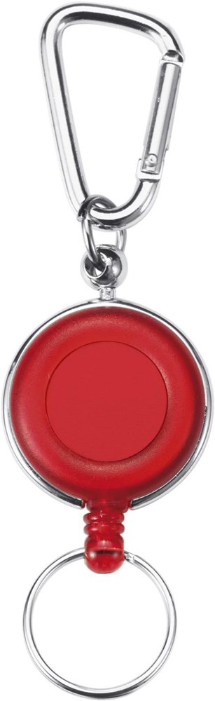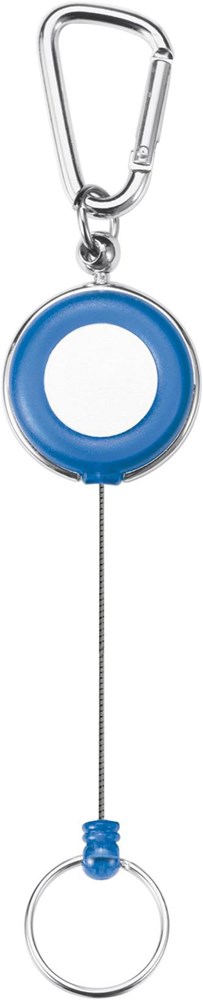 Kunststof sleutelhanger/badgehouder met metalen plaatje, trekkoord (ca. 60 cm), en karabijnhaak.