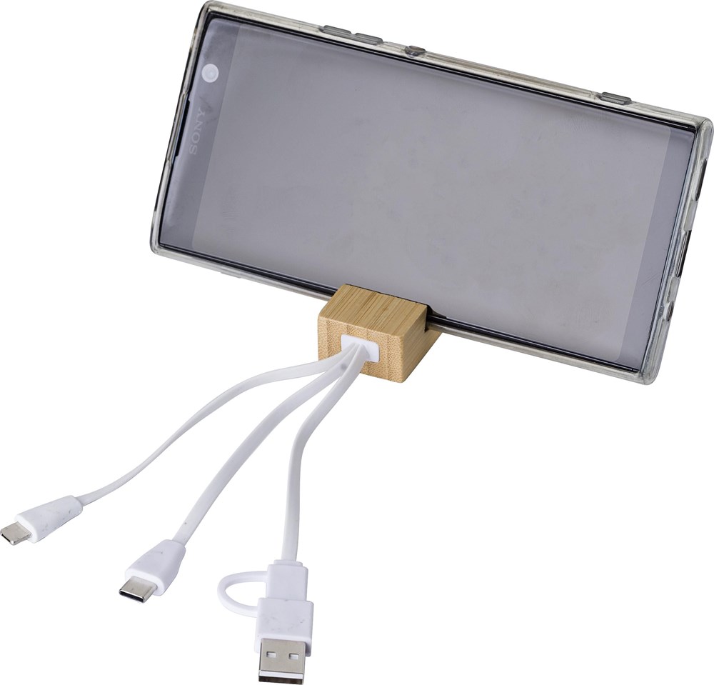 Bamboe sleutelhanger telefoonhouder met oplaadkabels. Type-C, lightning en USB-A/C. Individueel...
