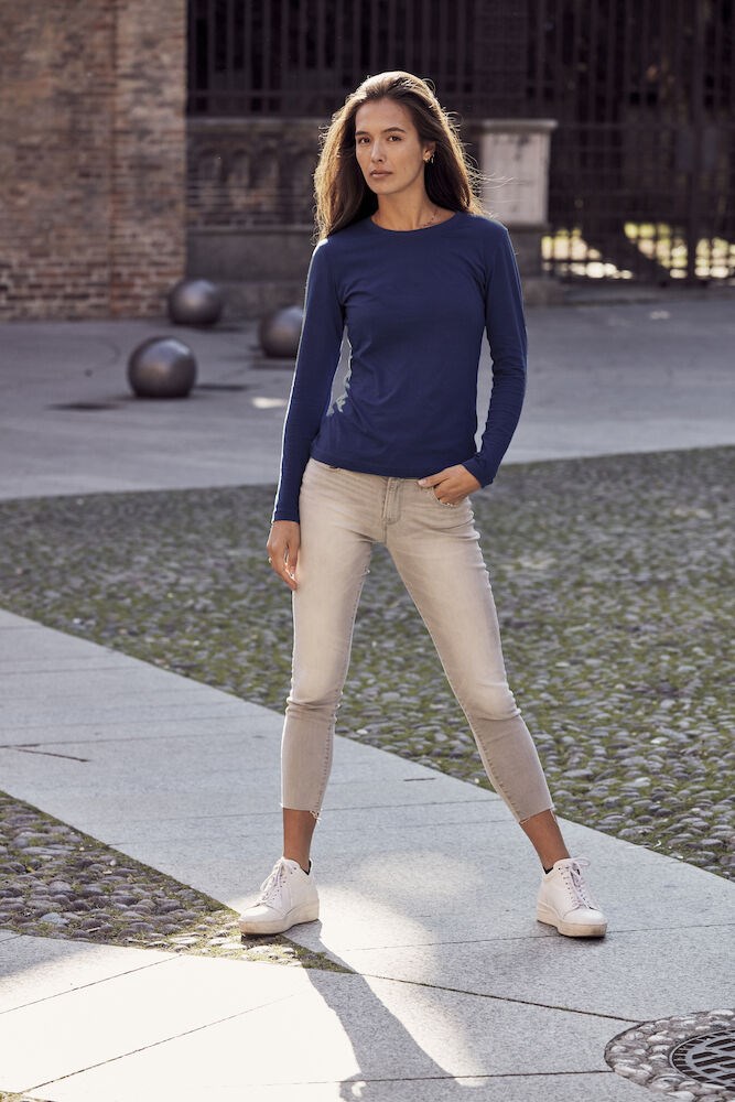 Modern, lichtgewicht T-shirt met lange mouwen en een comfortabele pasvorm. Zeer breed inzetbaar als basis T-shirt in tal van doelgroepen en zeer aantrekkelijk geprijsd. Het dames T-shirt is getailleerd en voorzien van zijnaden, het heren T-shirt is rondgebreid en heeft geen zijnaden. De behandelingen met softener en enzymen zorgen ervoor dat het T-shirt zacht en glad aanvoelt.