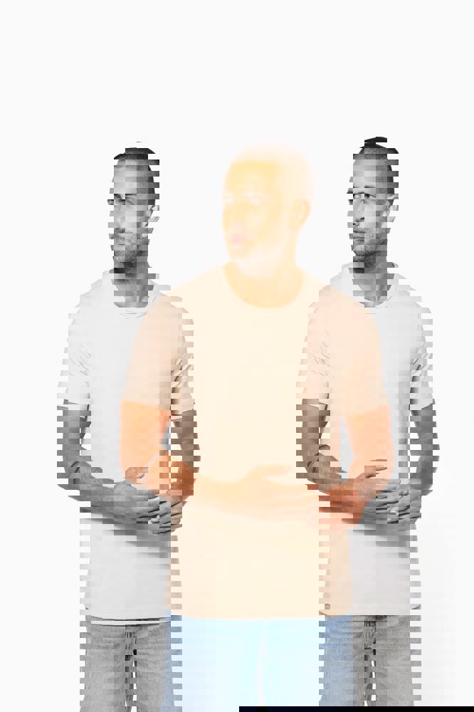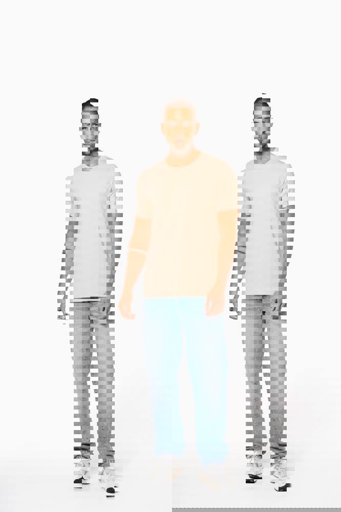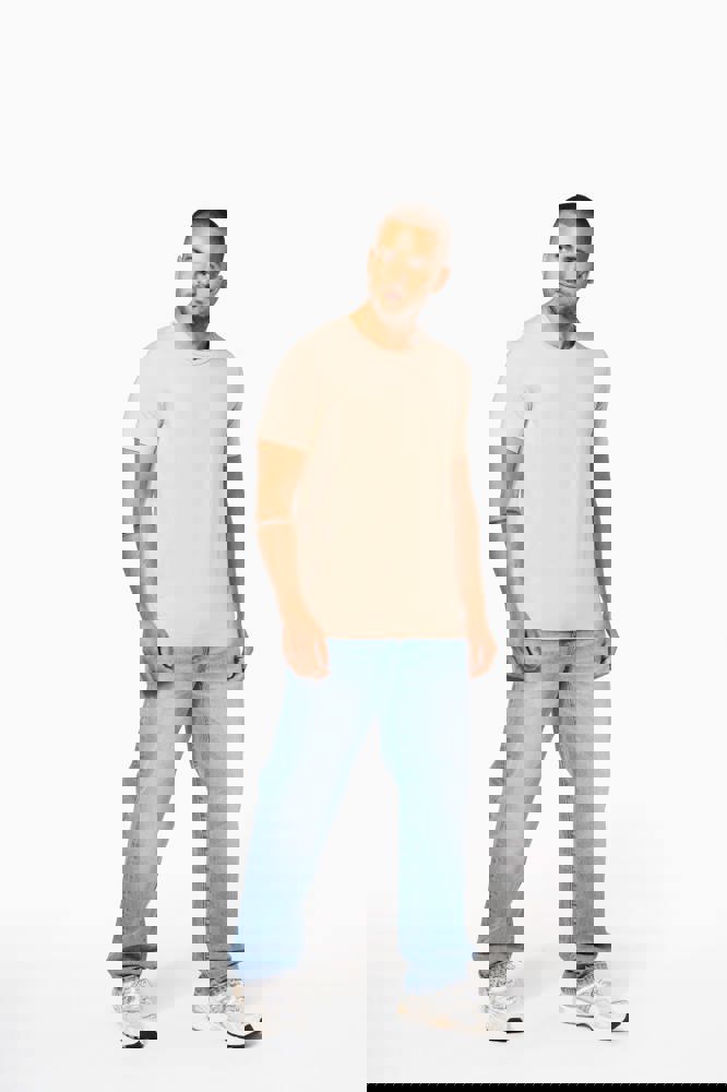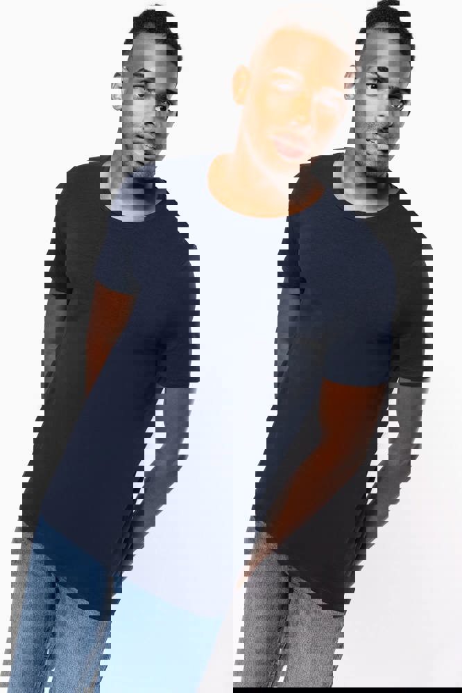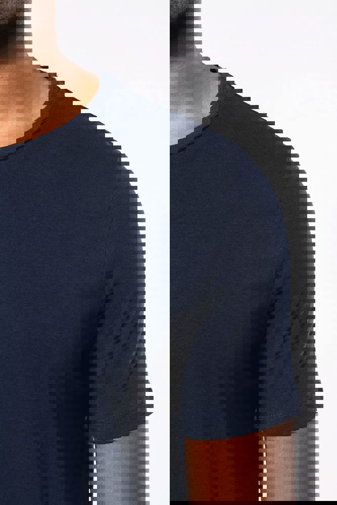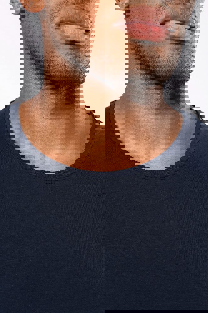 97% katoen / 3% elasthan. Voor chiné kleuren: 87% katoen / 9% viscose / 4% elasthan. Ronde hals. Dubbel stiksel aan mouwuiteinden en onderkant. De moderne en nauwsluitende snit zijn volgens de confectie standaards.