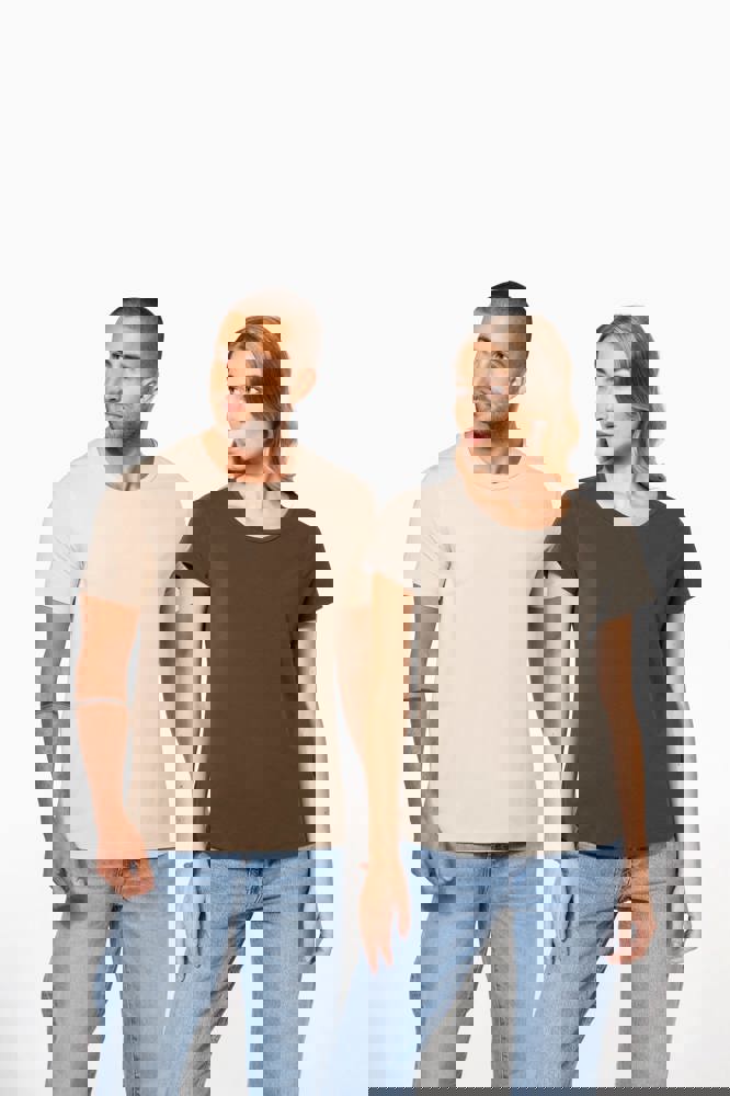 97% katoen / 3% elasthan. Chiné kleuren: 87% katoen / 9% viscose / 4% elasthan. Ronde hals. Dubbel stiksel aan mouwuiteinden en onderkant. De moderne getailleerde snit zijn volgens de laatste modetrends.