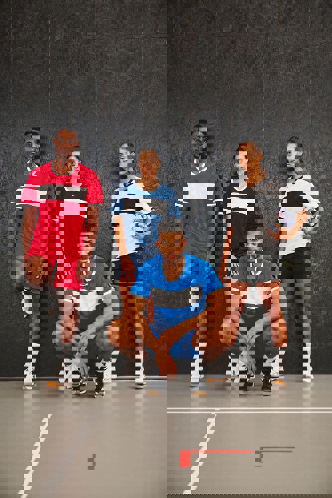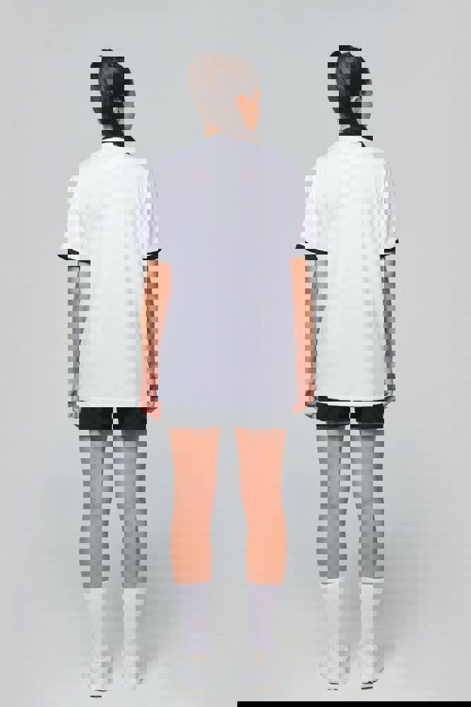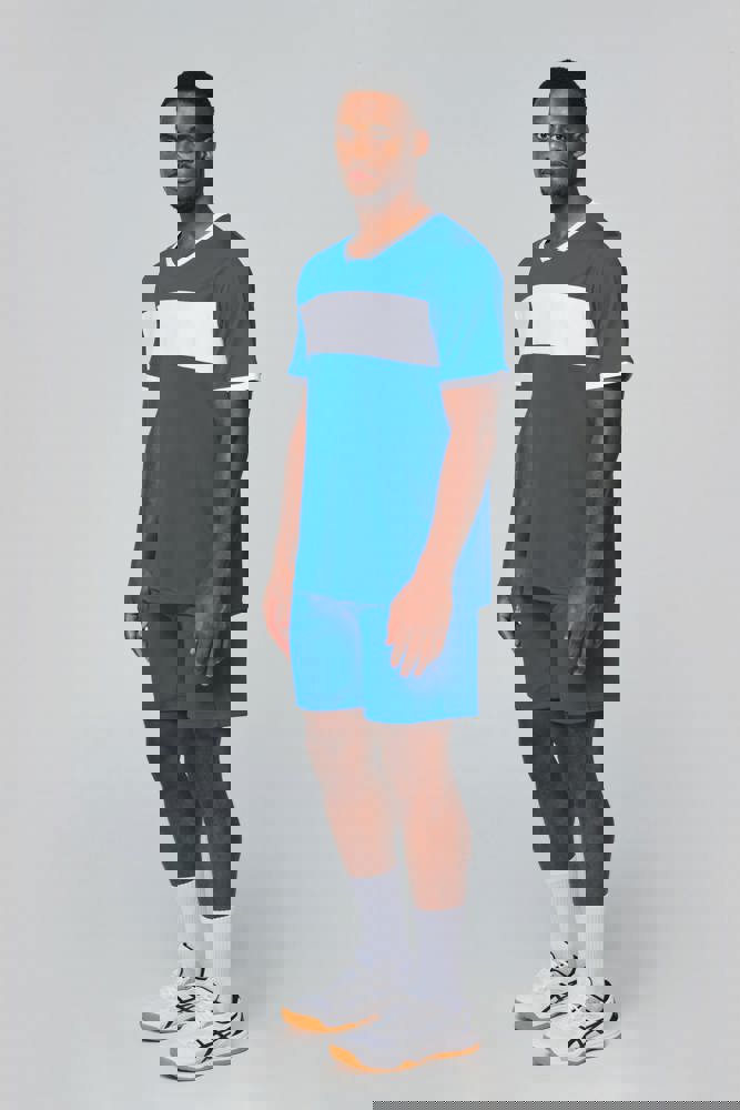 100% interlockpolyester. V-hals met nektape. Ingezette mouwen. Contrasterende borstinzetstukken, kraag en mouwuiteinden.
