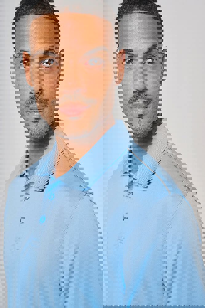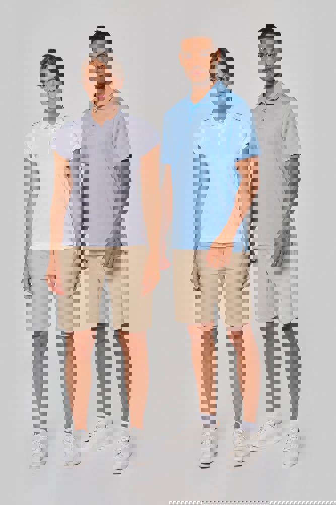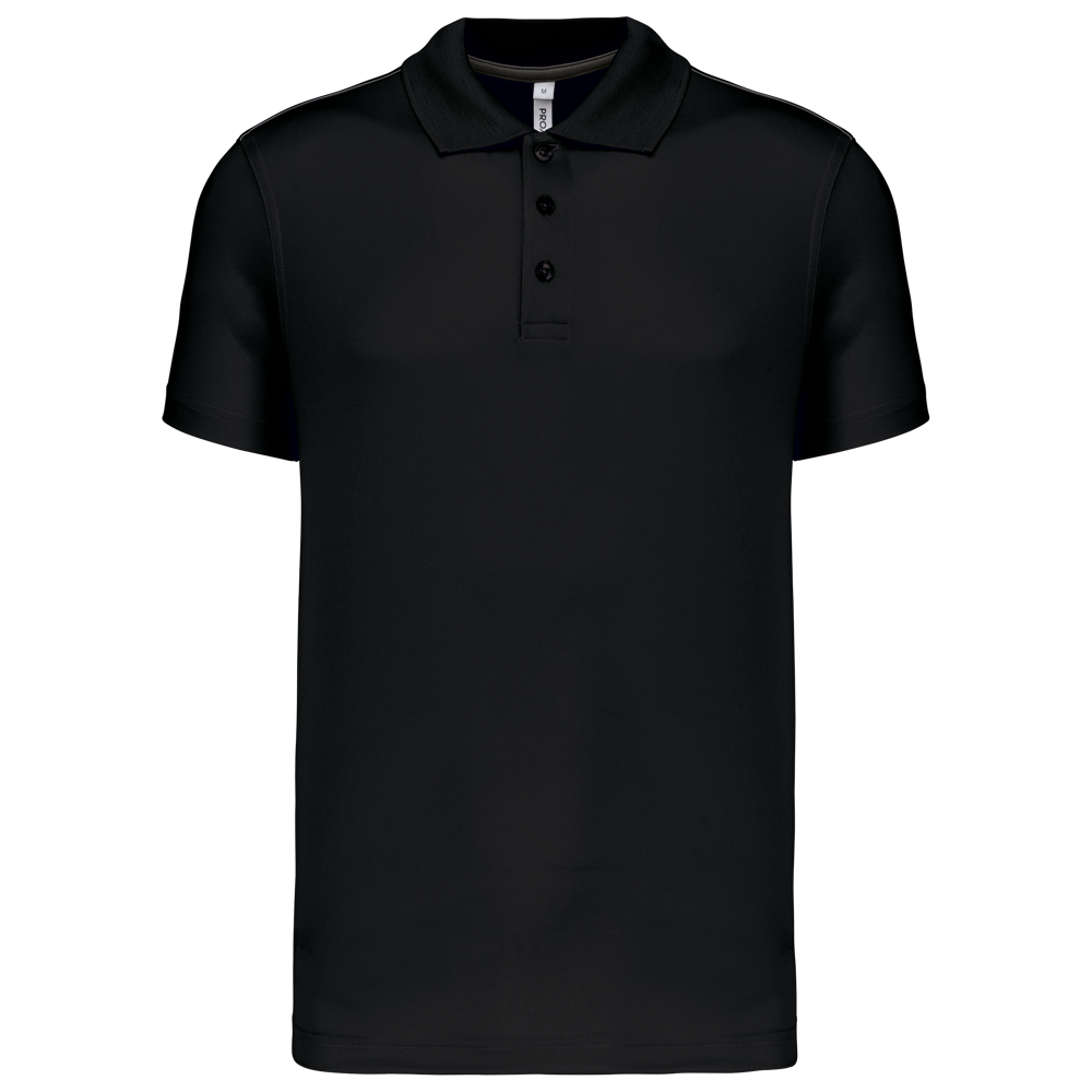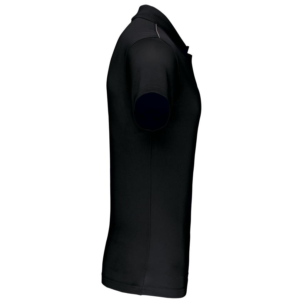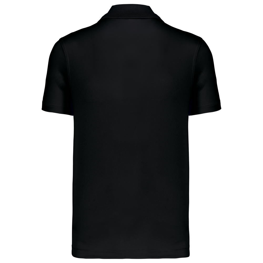 100% polyester interlock. Sneldrogende stof. Kraag in rib. Knooplijst met 3 knopen. Nektape en zijsplitjes in contrastkleur. Contrastkleurige bies op de schouders. Afwerking met dubbele stiksels aan de mouwuiteinden en onderaan.