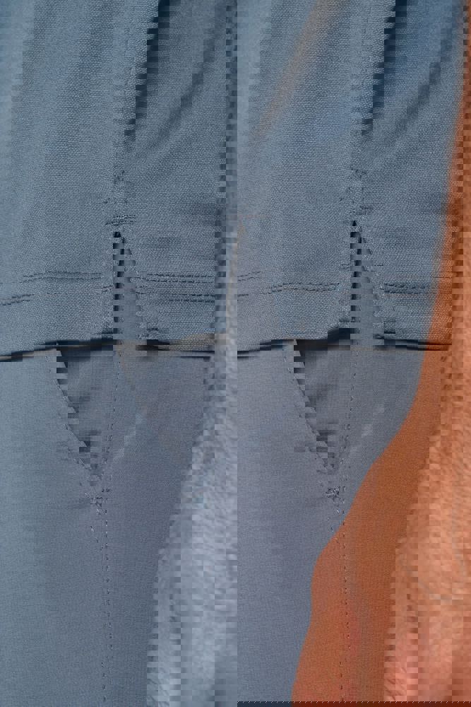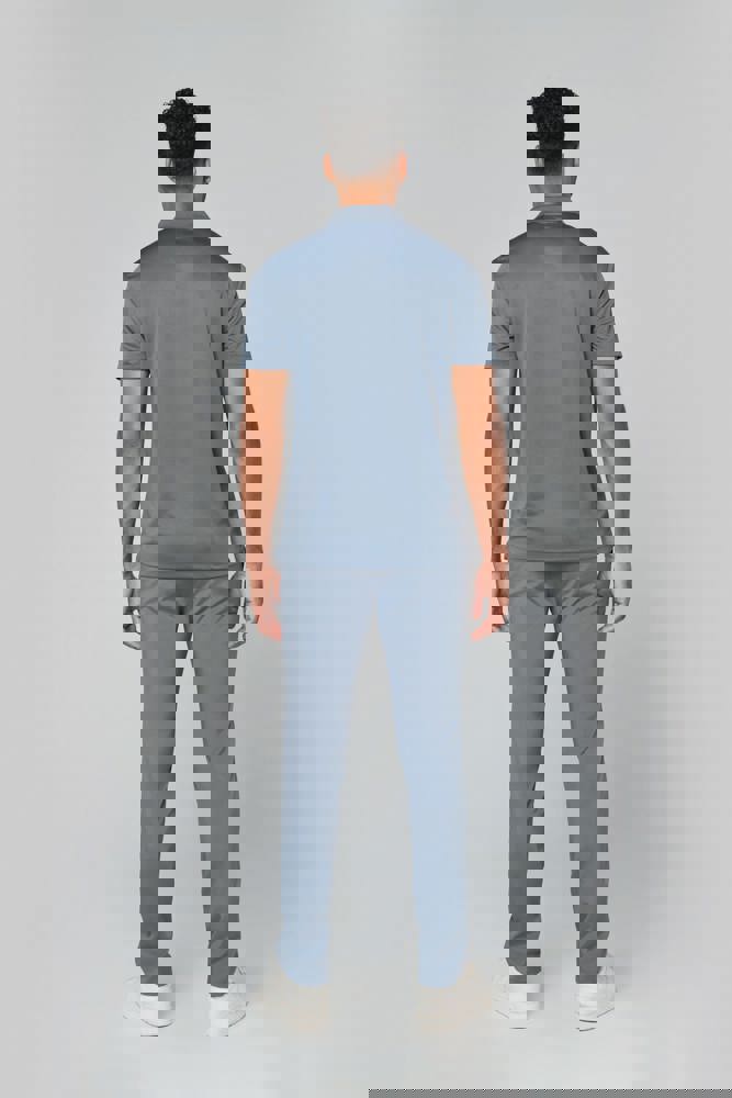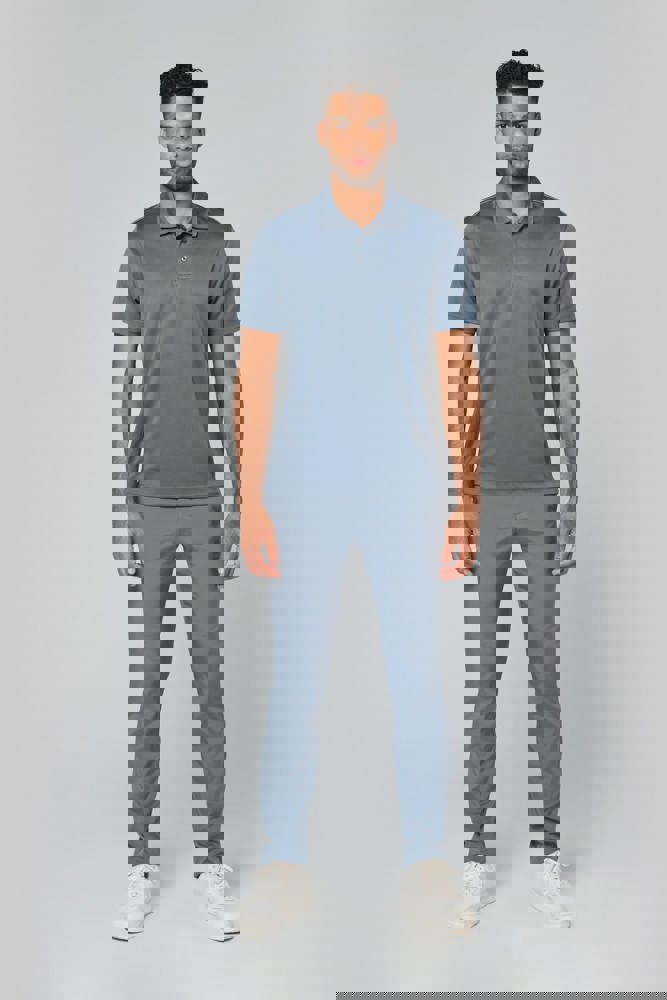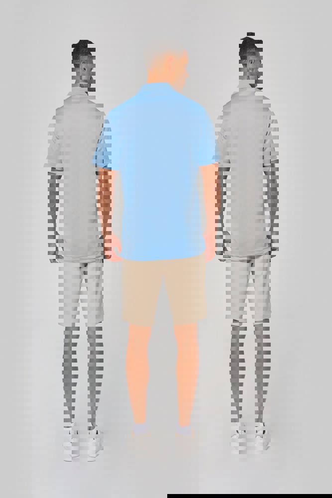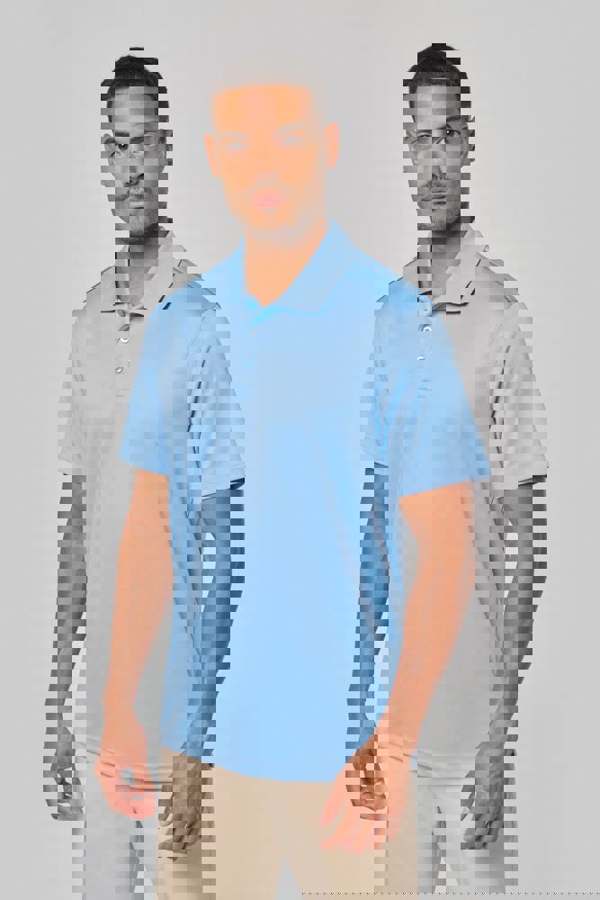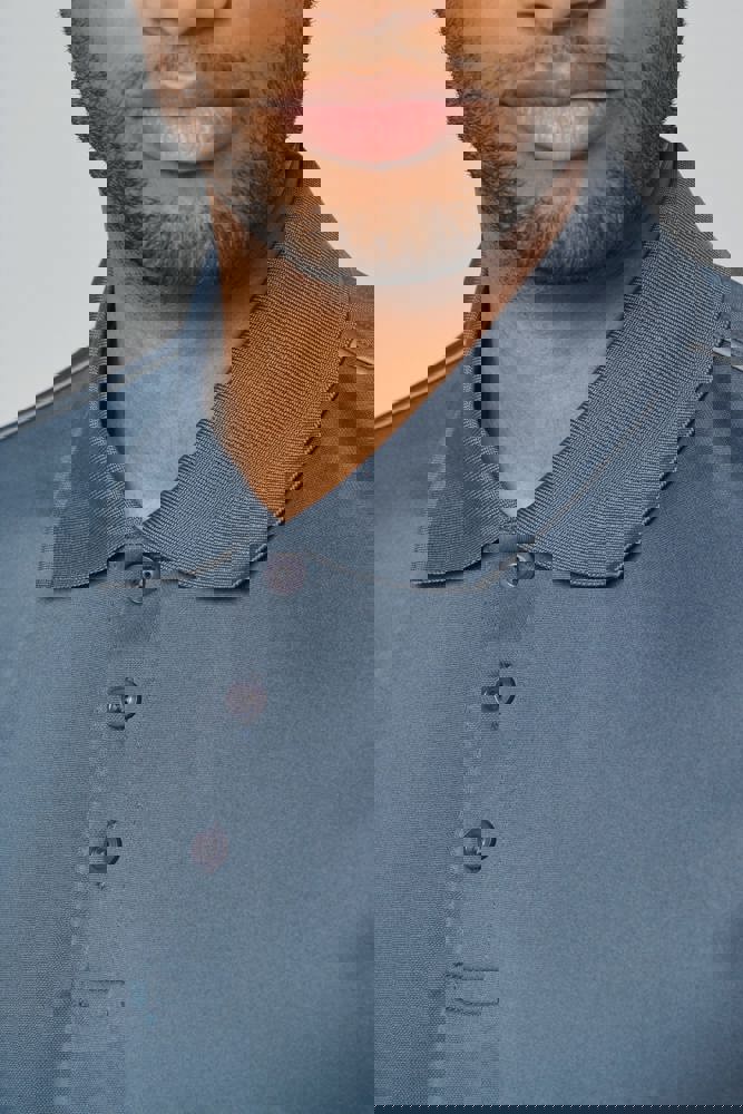 100% polyester interlock. Sneldrogende stof. Kraag in rib. Knooplijst met 3 knopen. Nektape en zijsplitjes in contrastkleur. Contrastkleurige bies op de schouders. Afwerking met dubbele stiksels aan de mouwuiteinden en onderaan.