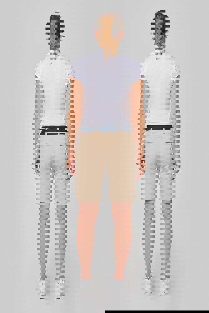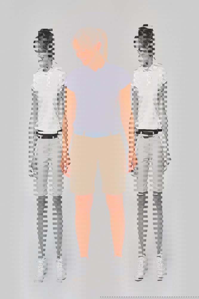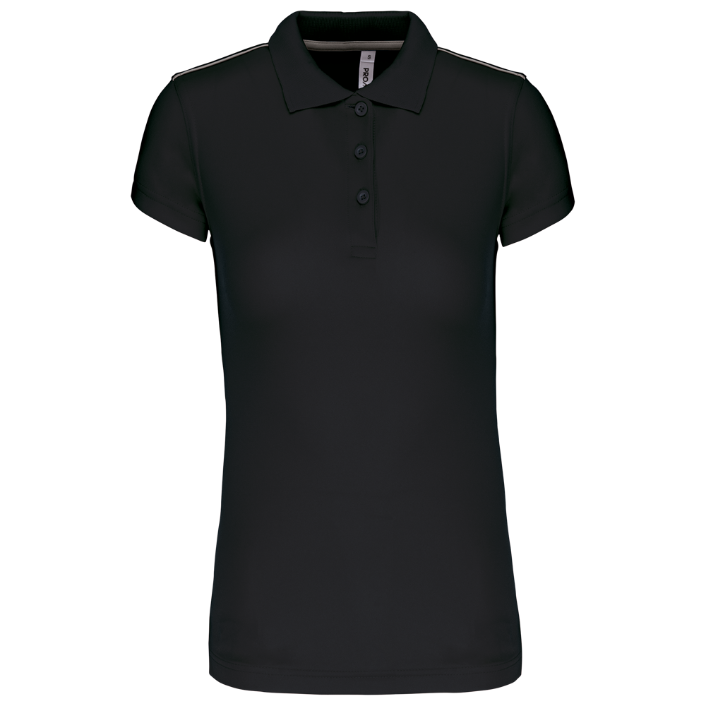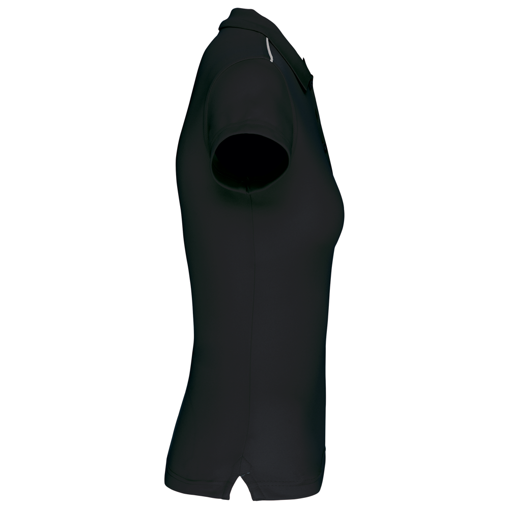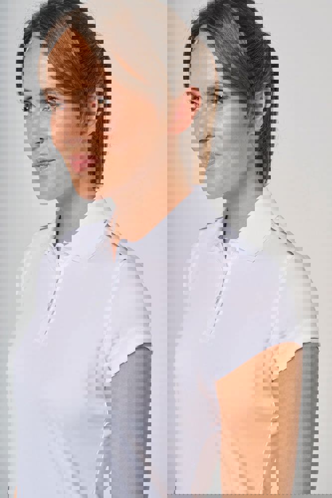 100% polyester interlock. Sneldrogende stof. Kraag in rib. Knooplijst met 3 knopen. Nektape en zijsplitjes in contrastkleur. Contrastkleurige bies op de schouders. Afwerking met dubbele stiksels aan de mouwuiteinden en onderaan.
