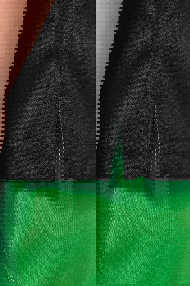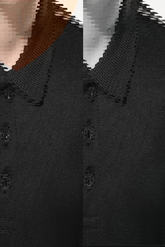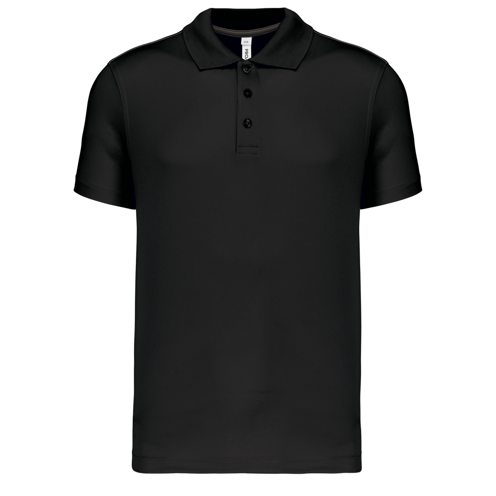 100% interlockpolyester. Sneldrogende stof. Kraag in ribboord. Knooplijst met 3 knopen. Contrasterende nektape in de hals en op de zijsplitten. Contrasterende bies aan de schouders. Dubbel stiksel aan mouwuiteinden en onderkant .