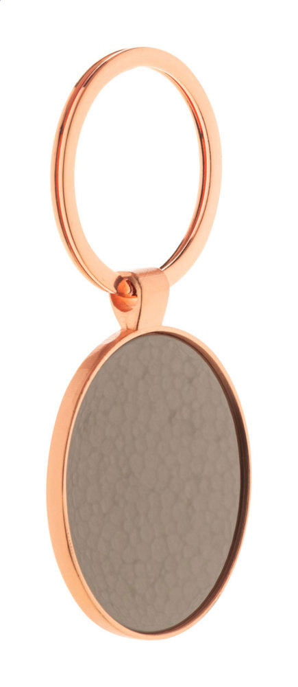 Ronde metalen sleutelhanger met gouden afwerking en bronskleurige plaat. In kraftpapieren doos.