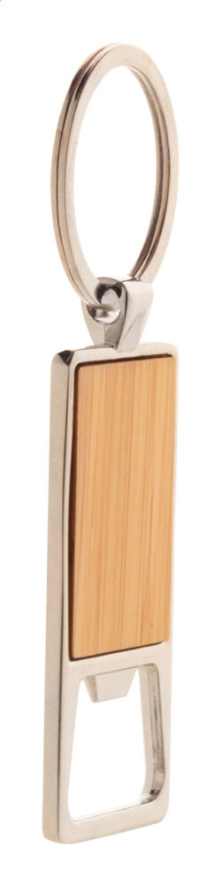 Metalen sleutelhanger met bamboe inzetstuk en flesopener.