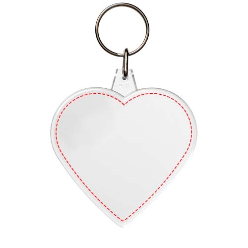Doorzichtige hartvormige sleutelhanger met metalen sleutelring. De metalen lusring biedt een vlak profiel dat ideaal is voor de post. Afmetingen van het te bedrukken inzetstuk: 5,8 cm x 5,0 cm.