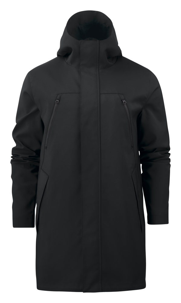 Matzwarte, metalen ritssluiting vooraan en aan de borstzakken. Stormflap met onzichtbare drukknopen. Ruime voorzakken met ritssluiting en binnenzak ook met ritssluiting.