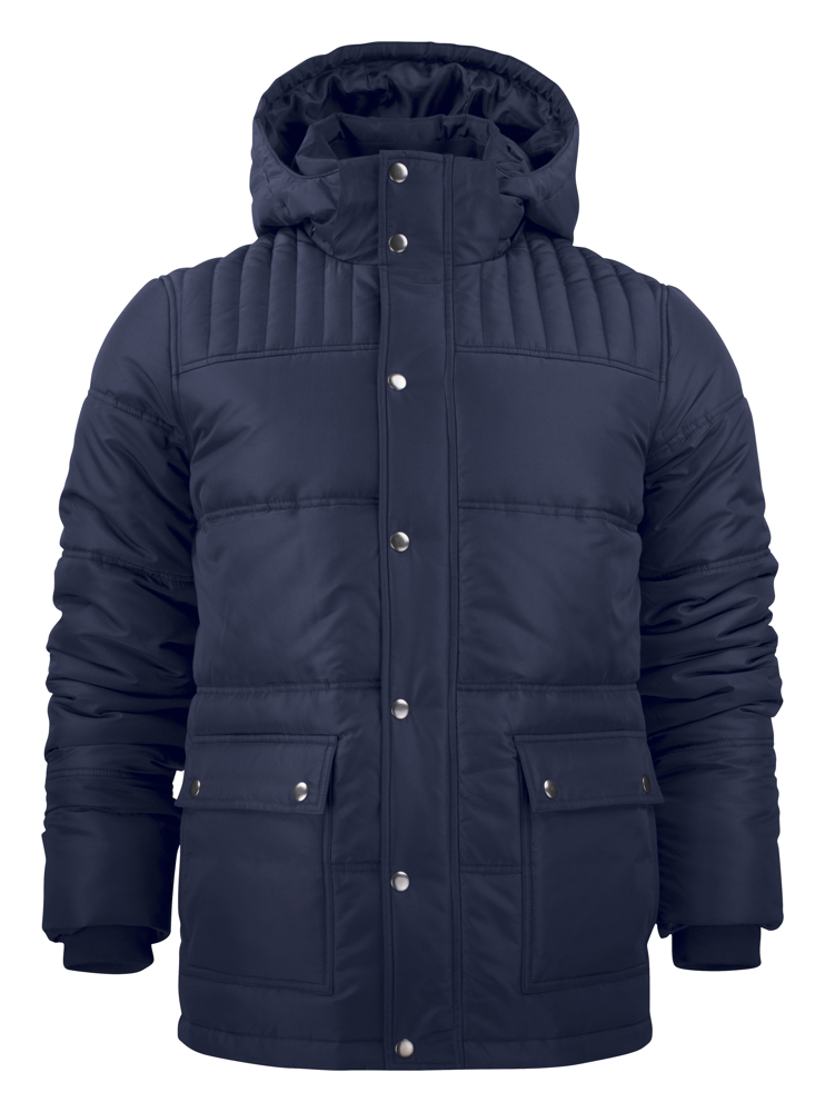 Winterjas met doorstikte voering. Verstelbaar aan de boord onderaan en aan de capuchon met elastisch trekkoord. Opgezette voorzakken met flap en drukknopen en fleece voering binnenin. Ritssluiting met stormflap met drukknopen. Afneembare capuchon. Ribboord aan de binnenkant van de kraag en aan de manchetten binnenin de mouwuiteinden. Binnenzak met ritssluiting. Verborgen ritssluiting op de rug voor print en/of borduring.