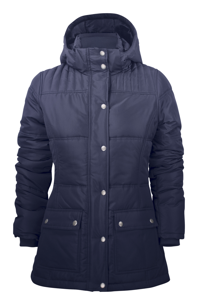 Winterjas met doorstikte voering. Verstelbaar aan de boord onderaan en aan de capuchon met elastisch trekkoord. Opgezette voorzakken met flap en drukknopen en fleece voering binnenin. Ritssluiting met stormflap met drukknopen. Afneembare capuchon. Ribboord aan de binnenkant van de kraag en aan de manchetten binnenin de mouwuiteinden. Binnenzak met ritssluiting. Verborgen ritssluiting op de rug voor print en/of borduring.