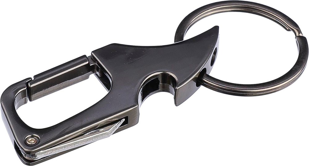Metalen karabijnhaak sleutelhanger met een flesopener en een klein mes. Per stuk verpakt in een...