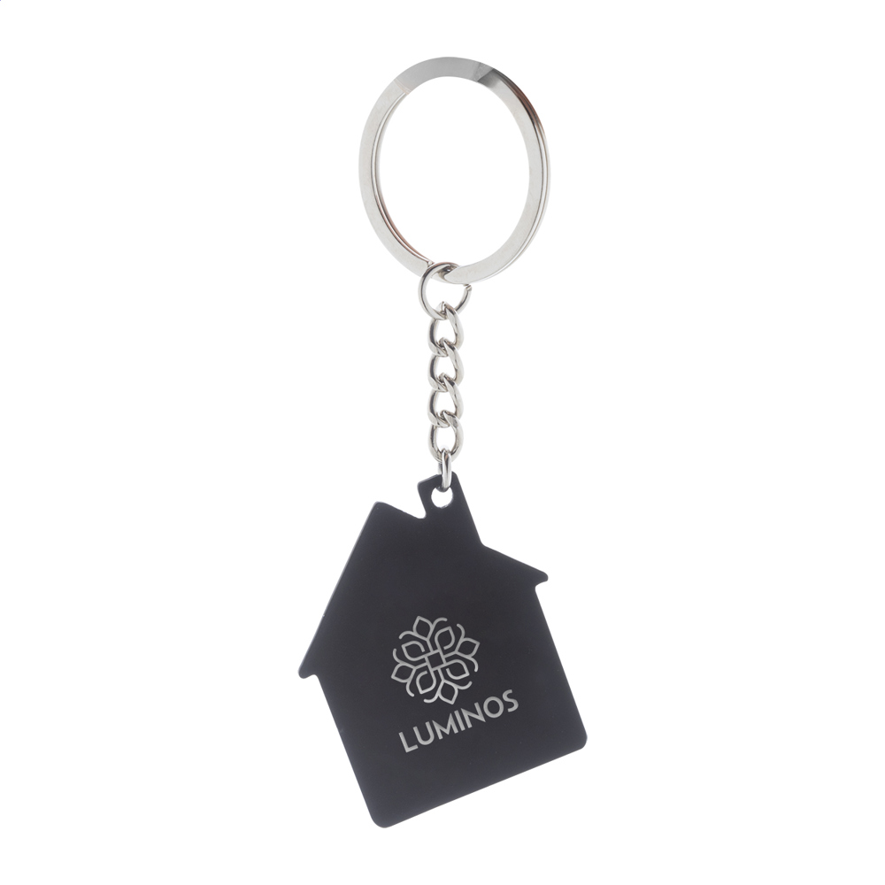 Huisvormige, gerecyclede roestvrijstalen sleutelhanger met rubberen afwerking. Met speciale...meer