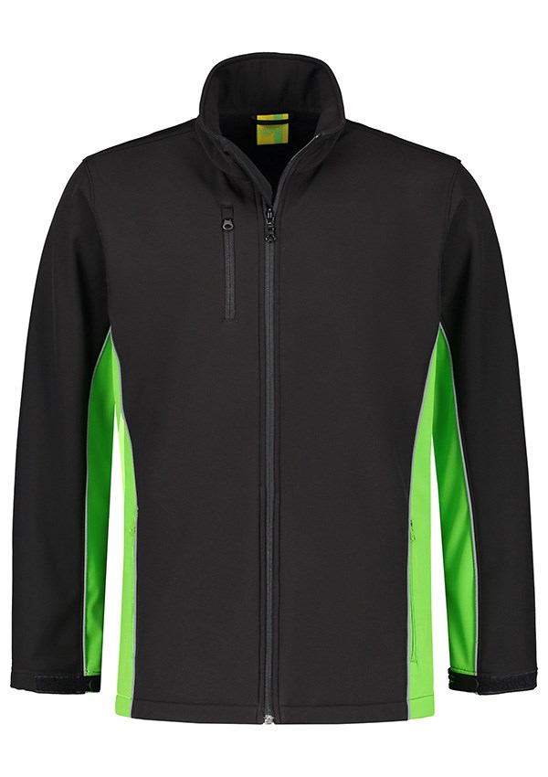 Lemon & Soda workwear softshell jacket. Comfortabele jas, gemaakt van een zware kwaliteit softshell. De jas is winddicht, waterafstotend en ademend. Daarnaast heeft het zijzakken met rits, reflecterende piping en een YKK-ritssluiting.