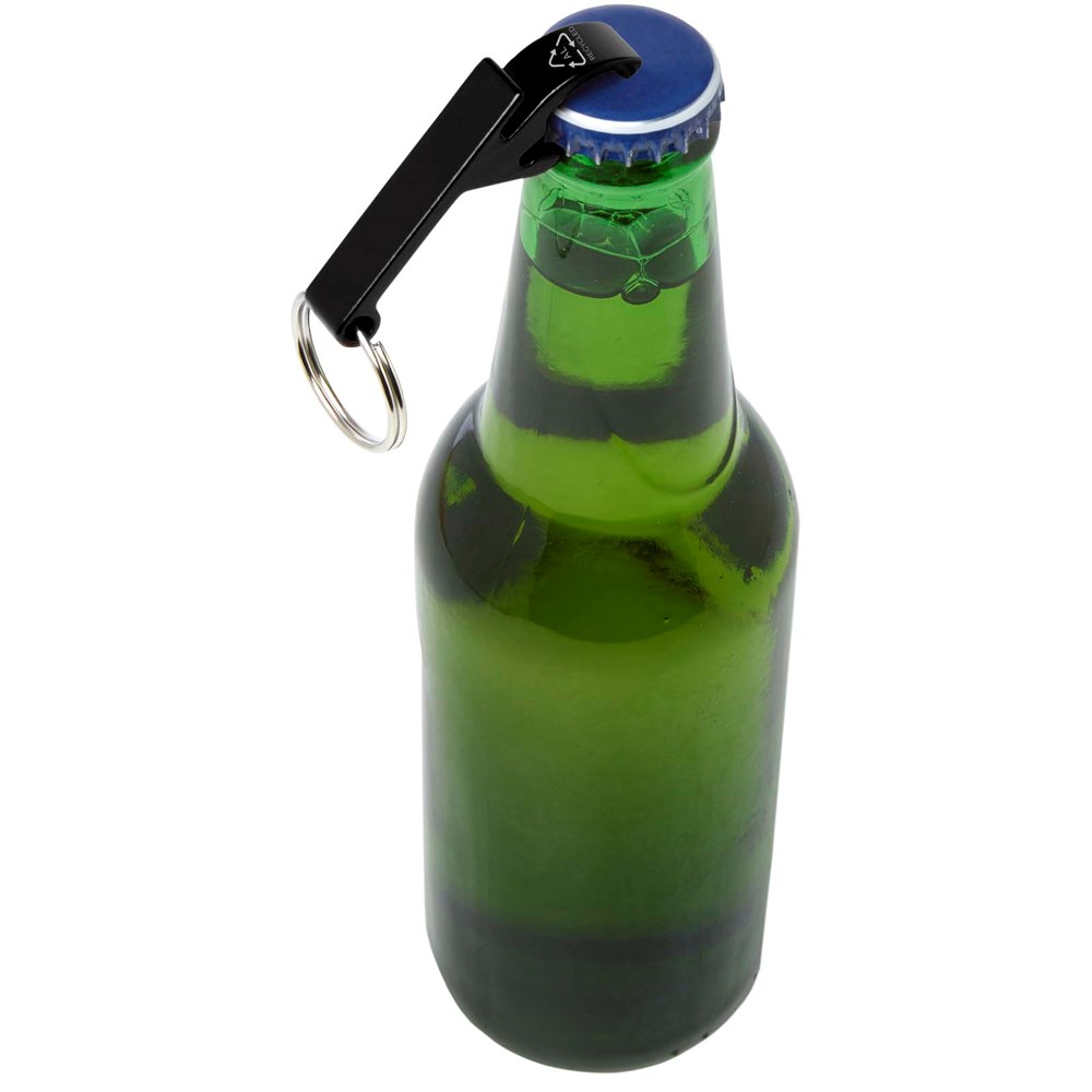 De sterke en lichte Tao fles- en blikopener met sleutelhanger is gemaakt van 83% RCS-gecertificeerd gerecycled aluminium. De Recycled Claim Standard (RCS) controleert de gerecyclede inhoud van een product in de hele toeleveringsketen. Verkrijgbaar in verschillende opvallende kleuren met een metallic afwerking, waardoor een gedrukt logo mooi opvalt.