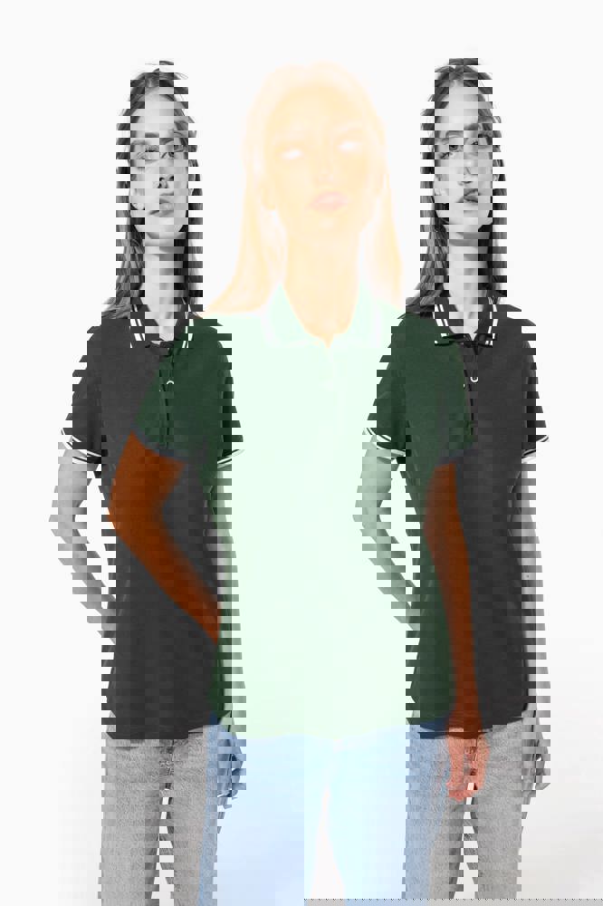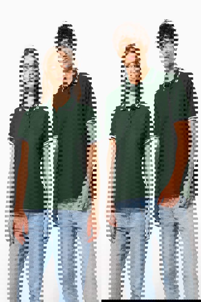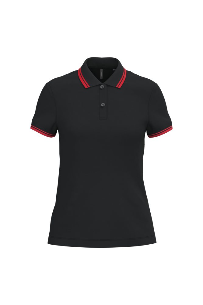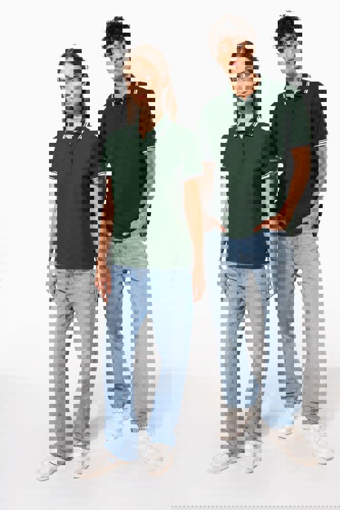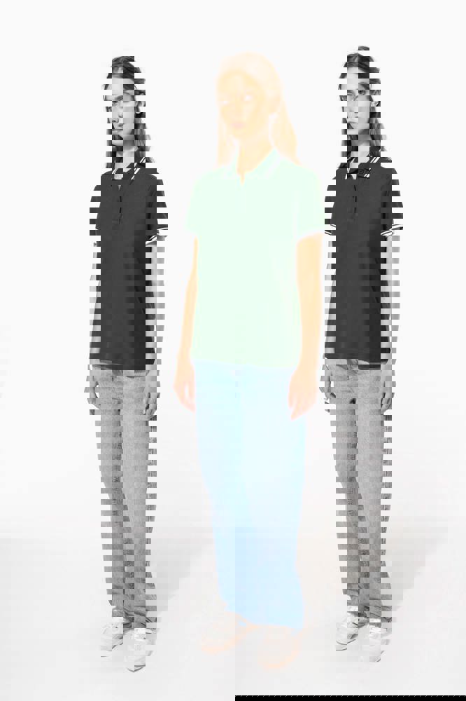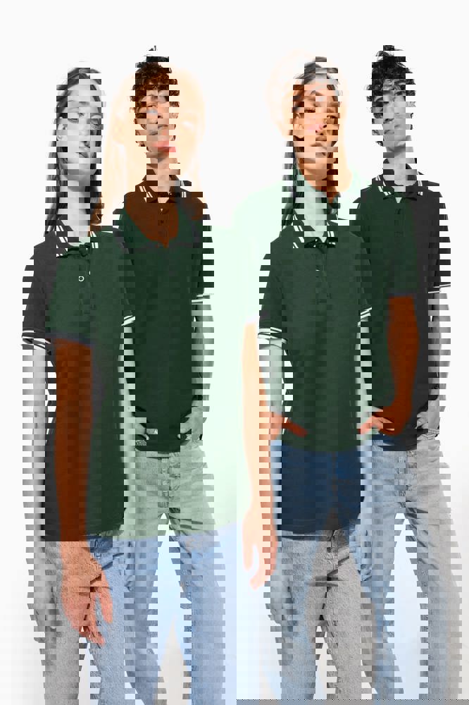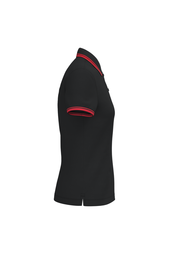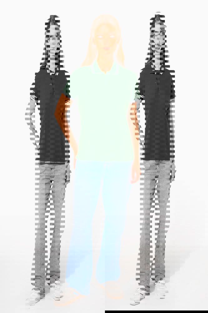 100% gekamd katoen. Voor de gevlamde kleuren: 92% katoen / 8% viscose. Piquétricot. Rechte snit. Knooplijst met 2 toon-op-toon knopen aan de kraag. Nektape in de hoofdstof in de kraag. Zijsplitten met een afwerkingsboord in de hoofdstof. Ribboord met contrasterende biesjes aan kraag en mouwuiteinden. Dubbel stiksel aan de onderkant.