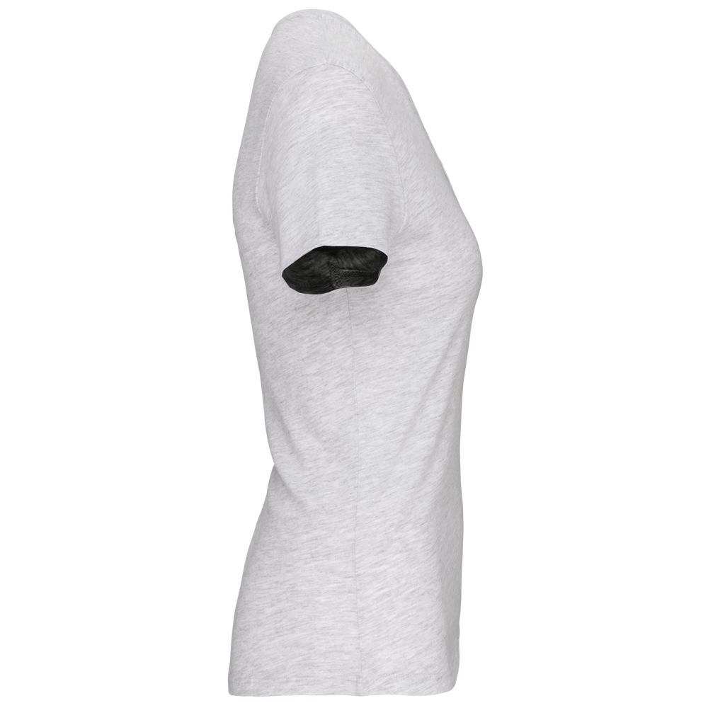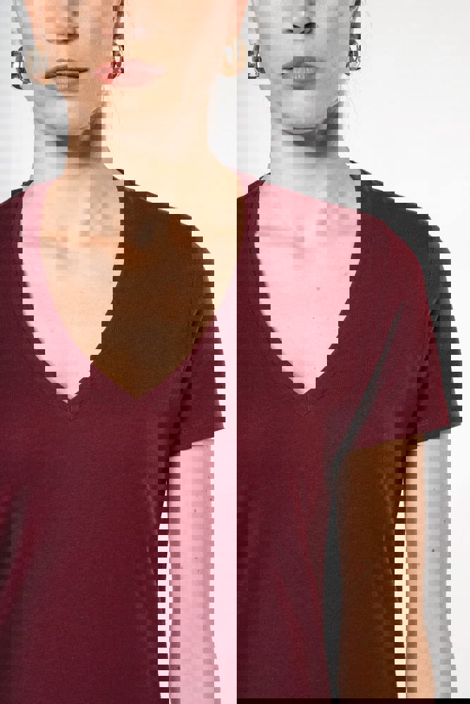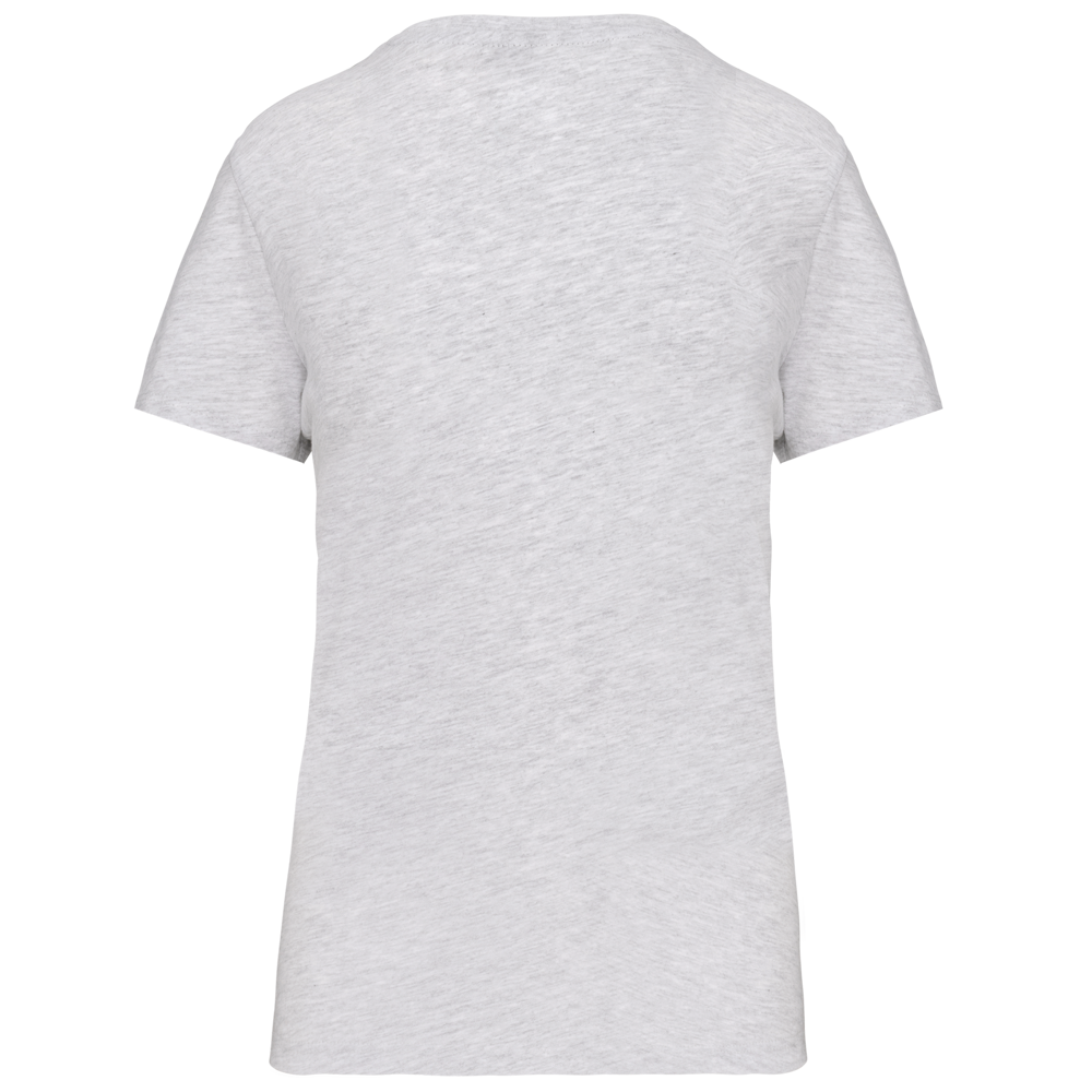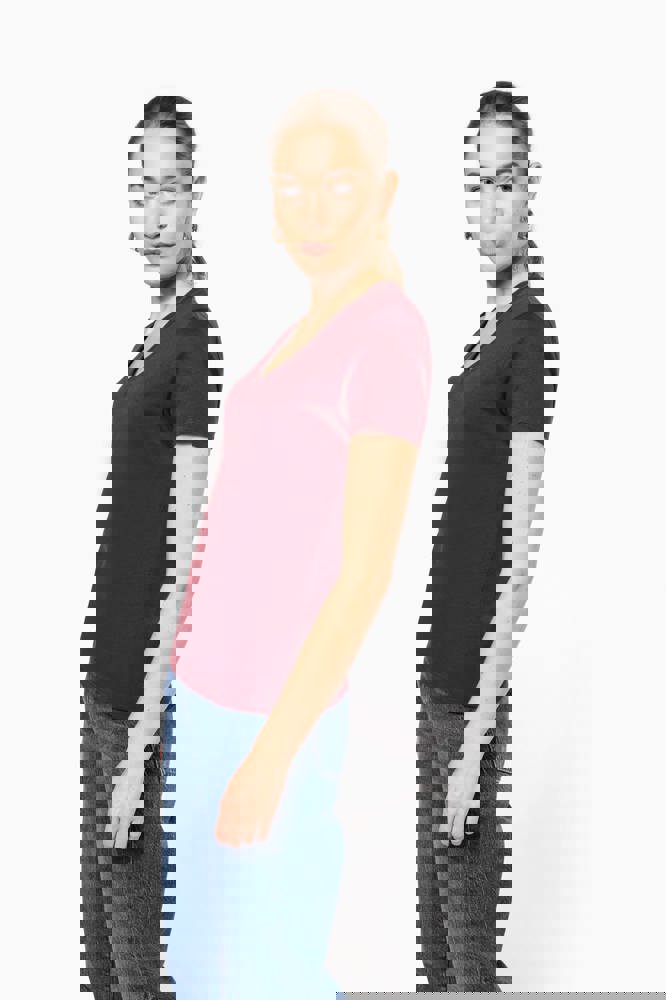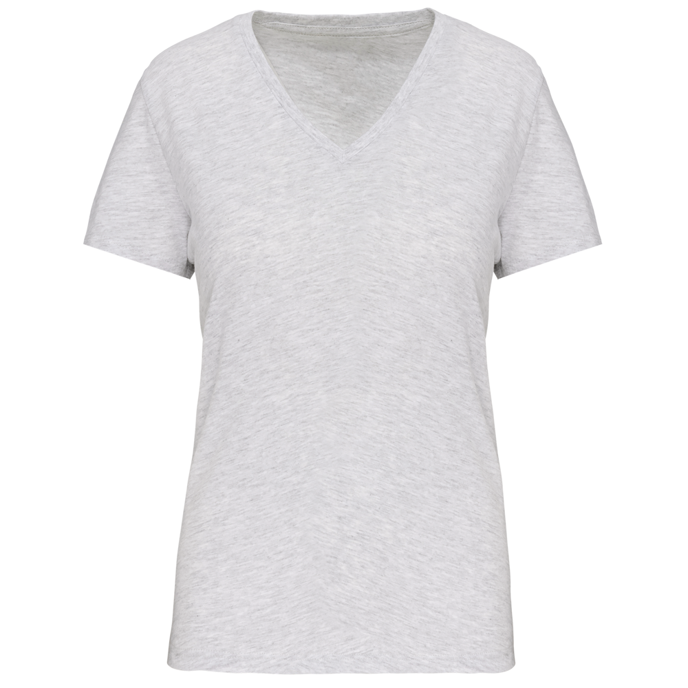 Effen kleuren : 100% katoen. Kleur Ash Heather 98% katoen / 2% viscose en Oxford Grey : 90% katoen / 10% viscose. Alle kleuren zijn gemaakt van biologisch katoen. Gekamd katoen. V-hals in ribboord met elasthan. Toon op toon nektape. Dubbel stiksel aan mouwuiteinden en onderkant.