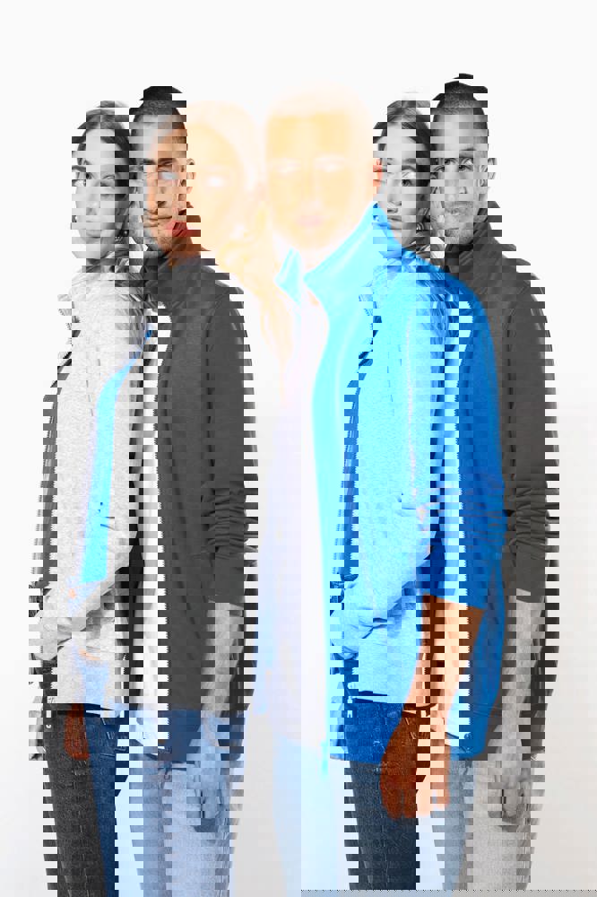 80% katoen / 20% polyester. Buitenoppervlak 100% katoen. LSF-behandeling (Low Shrinkage Fleece: voorgekrompen fleece). Aan de binnenkant geborsteld fleece 3 draden van gekamd katoen. Rechte snit. Rechte mouwen. Opstaande kraag. Ritssluiting in toon op toon plastic. 2 ritszakken en biesjes opzij. Halvemaanvormige afwerking aan de halsopening op de achterkant, voor eenvoudige personalisatie van het merk aan de binnenkant van de kraag. Afwerking van 1x1 ribboord aan de mouwuiteinden en onderaan. Tear-away merklabel.