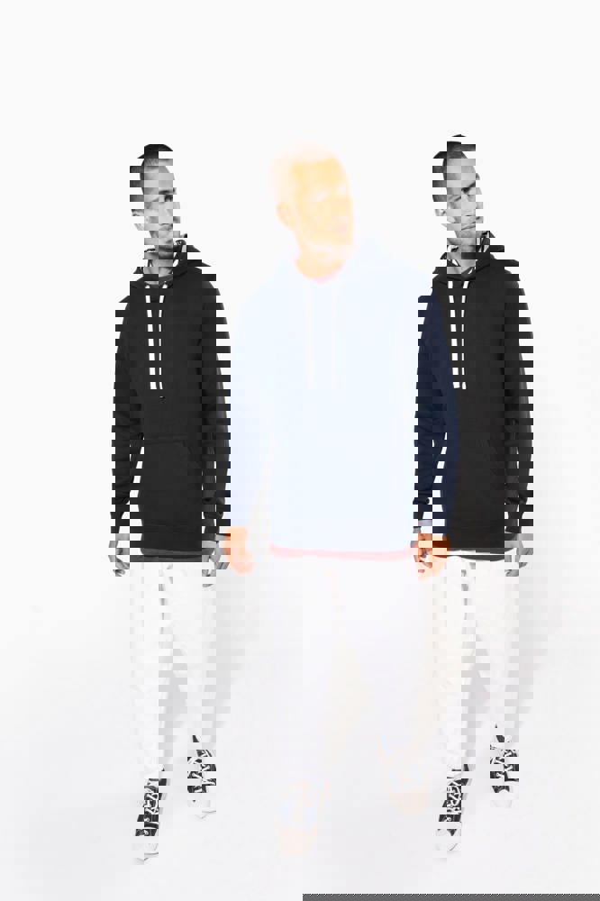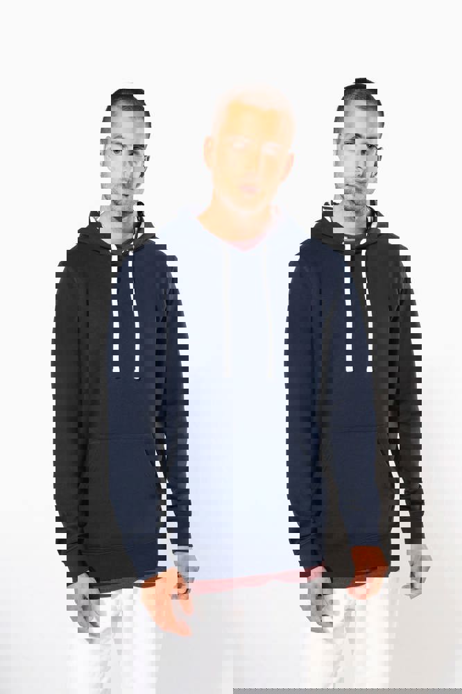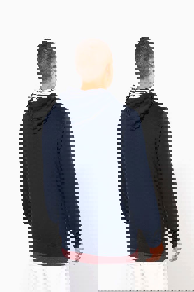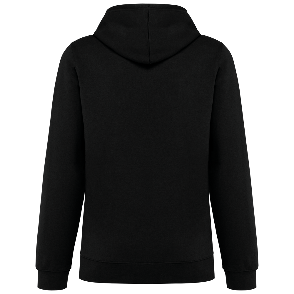 80% katoen / 20% polyester. Gekamd katoen. Aan de binnenkant geborsteld fleece 3 draden. Rechte snit. Rechte mouwen. Kangoeroezakken. Halvemaanvormige halsopening voor eenvoudige personalisatie van het merk aan de binnenkant van de kraag. Afwerkingen van 1x1 ribboord aan de mouwuiteinden en de boord. Gevoerde capuchon met een themastof in bedrukt jerseykatoen en contrasterende aanrijgkoordjes. Tear-away merklabel.
