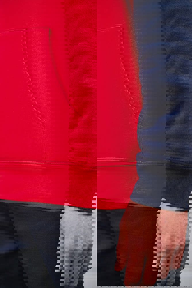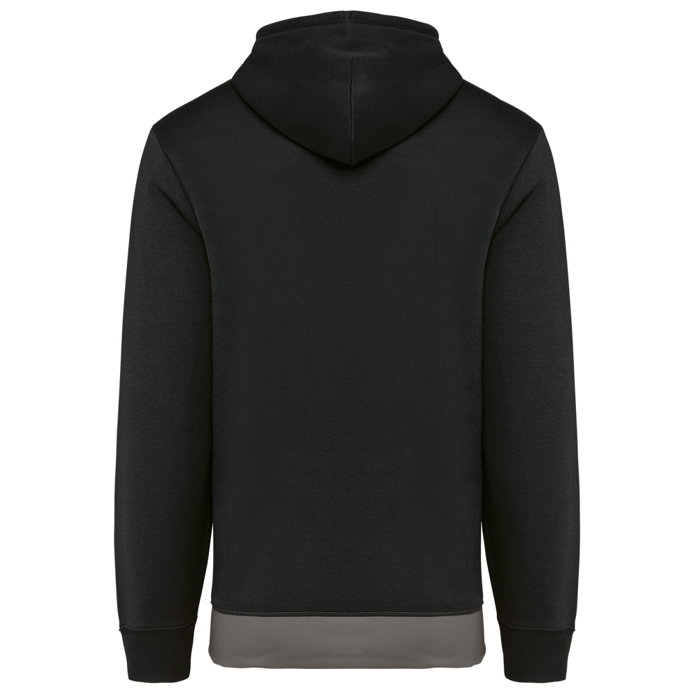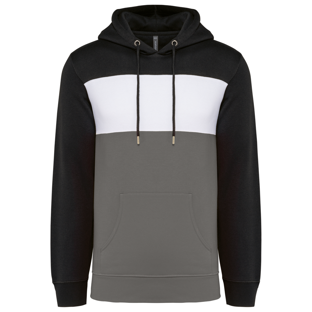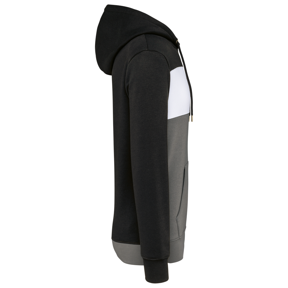 80 % katoen/20 % polyester. Buitenoppervlak 100% gekamd katoen. Rechte snit. Aan de binnenkant geborsteld fleece 3 draden. LSF (Low Shrinkage Fleece). Enzymgewassen. Driekleurige sweater met capuchon met centrale witte streep op alle kleuren. Afwerking ribboord 1x1 aan mouwuiteinde en aan de onderkant in kokervorm voor een betere afwerking, met stiksel. Kangoeroezak met dubbel stiksel. Capuchon met plooien, oogje en metalen koorduiteinden, met ronde aanrijgkoordjes Toon-op-toon nektape met visgraatmotief. In de mouwuiteinden en onderaan zit elastaan om vervorming van het kledingstuk te voorkomen. Halvemaanvormige afwerking op de achterkant voor eenvoudige personalisatie. Afscheurbaar merklabel en maatlabel in de kraag voor eenvoudige personalisatie.