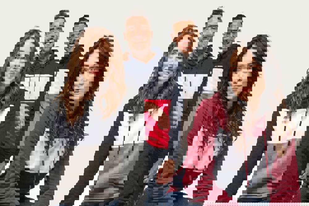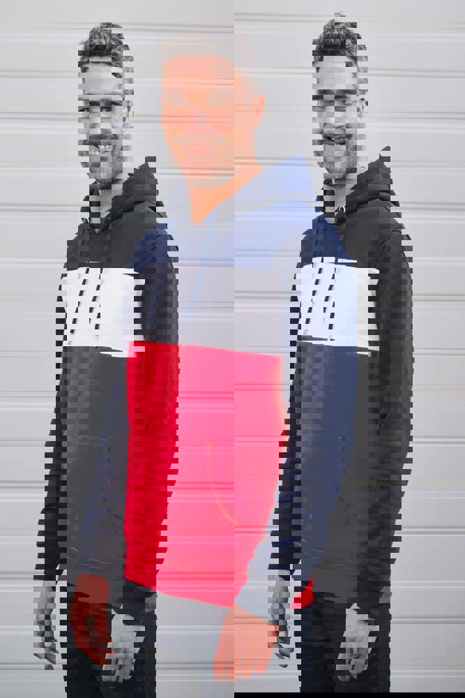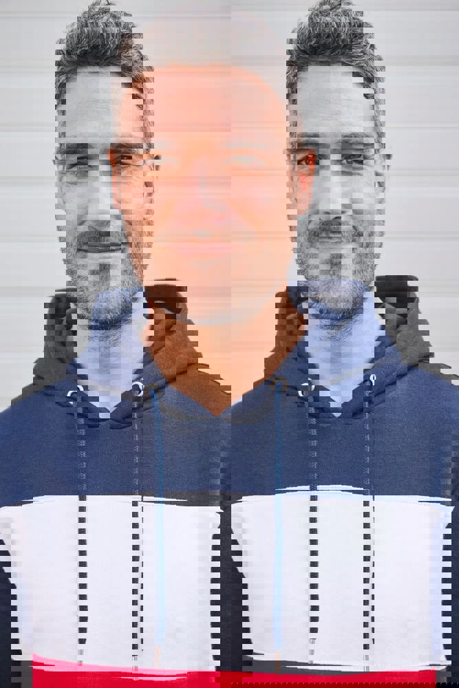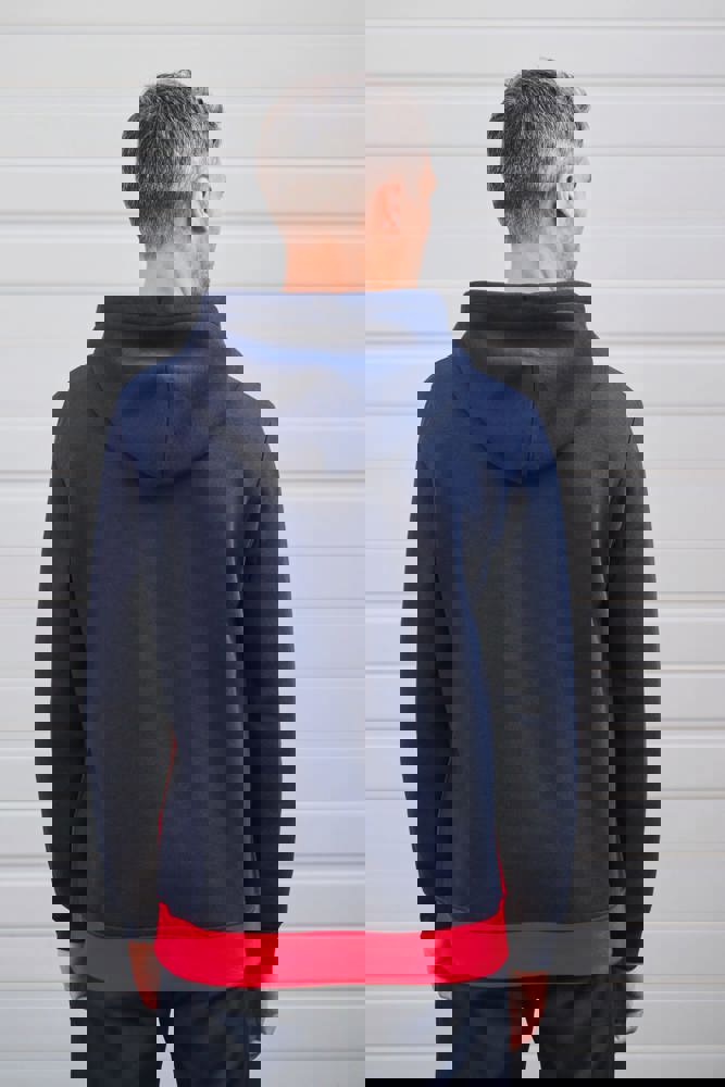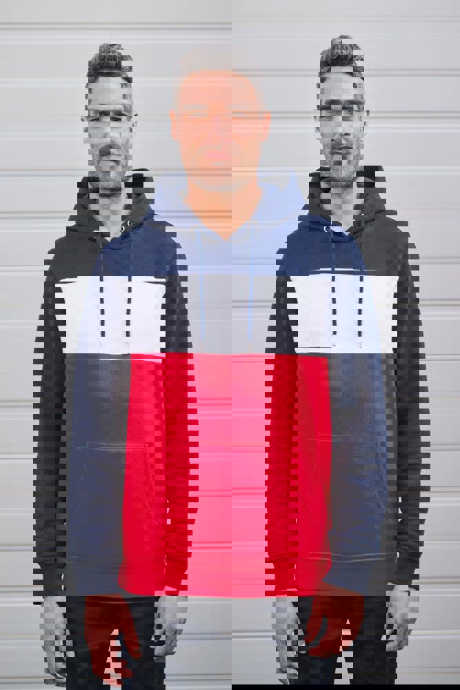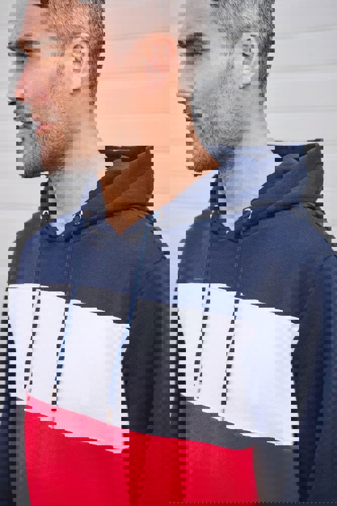 80 % katoen/20 % polyester. Buitenoppervlak 100% gekamd katoen. Rechte snit. Aan de binnenkant geborsteld fleece 3 draden. LSF (Low Shrinkage Fleece). Enzymgewassen. Driekleurige sweater met capuchon met centrale witte streep op alle kleuren. Afwerking ribboord 1x1 aan mouwuiteinde en aan de onderkant in kokervorm voor een betere afwerking, met stiksel. Kangoeroezak met dubbel stiksel. Capuchon met plooien, oogje en metalen koorduiteinden, met ronde aanrijgkoordjes Toon-op-toon nektape met visgraatmotief. In de mouwuiteinden en onderaan zit elastaan om vervorming van het kledingstuk te voorkomen. Halvemaanvormige afwerking op de achterkant voor eenvoudige personalisatie. Afscheurbaar merklabel en maatlabel in de kraag voor eenvoudige personalisatie.