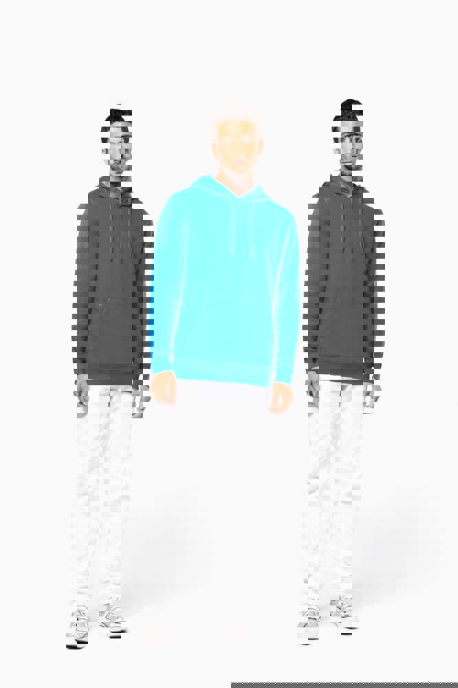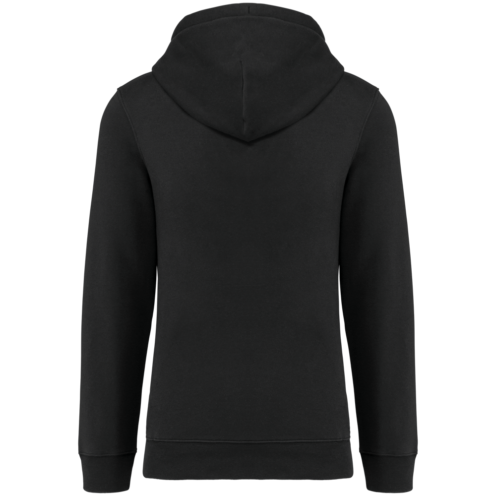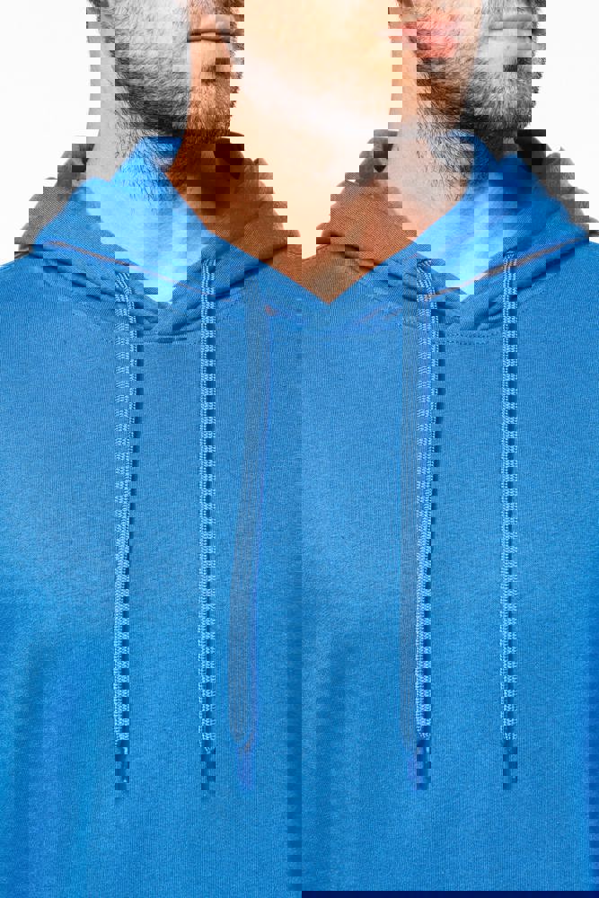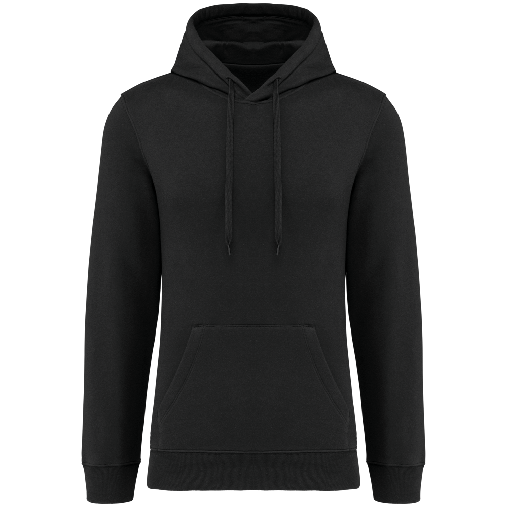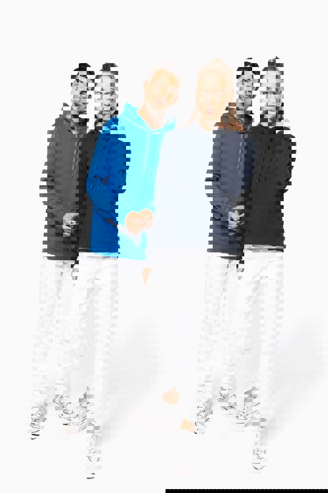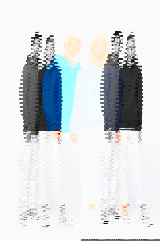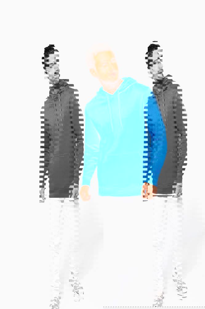 80% katoen / 20% polyester. Geborsteld LSF-fleece 3 draden (Low Shrinkage Fleece), behandeld tegen pluizen. Gemaakt in Portugal. Straight snit. Cut-and-sew-techniek. 1x1 ribboord in buisconstructie voor een betere afwerking aan de mouwuiteinden en de onderkant. Kangoeroezak. Gevoerde capuchon in 100% jerseykatoen met platte aanrijgkoordjes die door knoopsgaten lopen. Halvemaanvormige afwerking aan de binnenkant van de kraag. Dubbel stiksel aan de mouwuiteinden en de onderkant. Geen merklabel, maar een maatlabel in de kraag voor eenvoudige personalisatie.