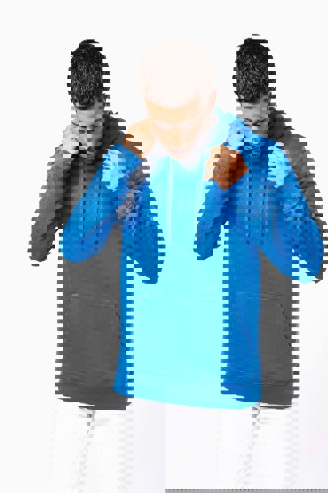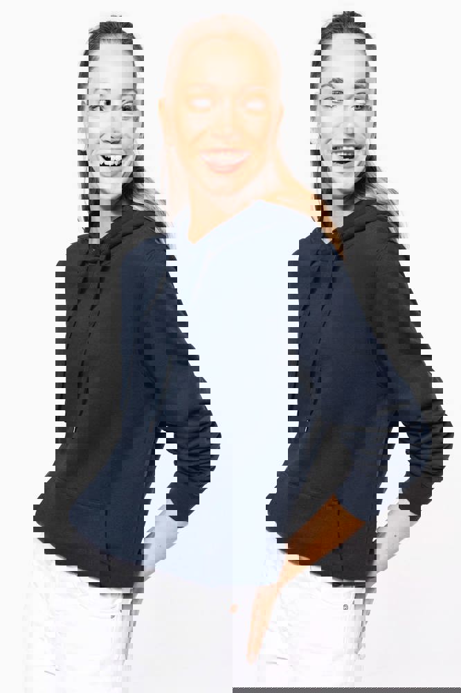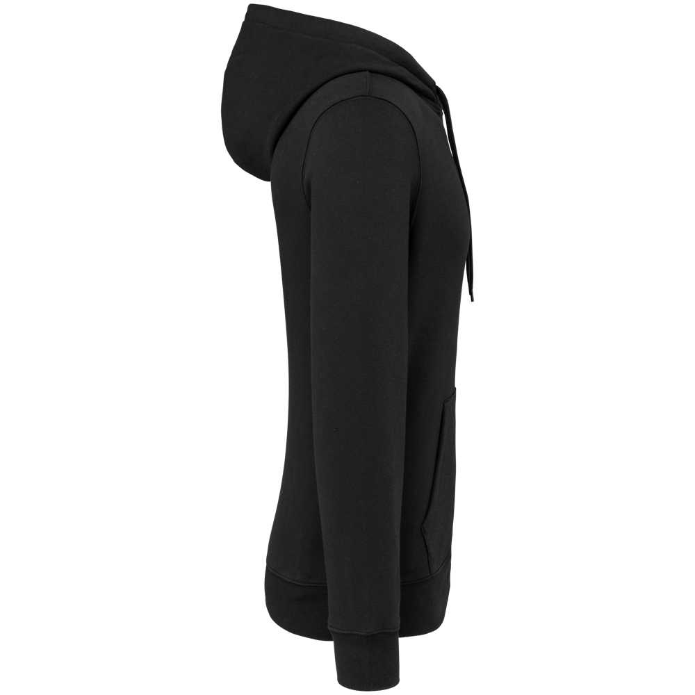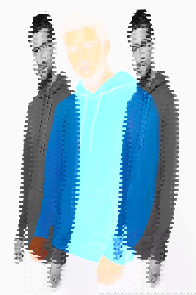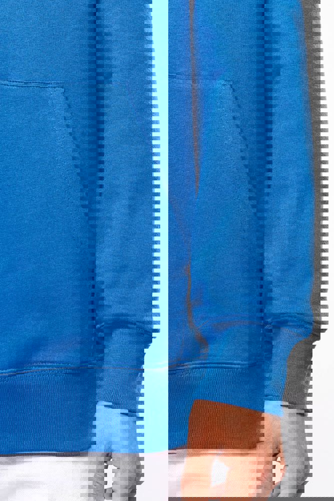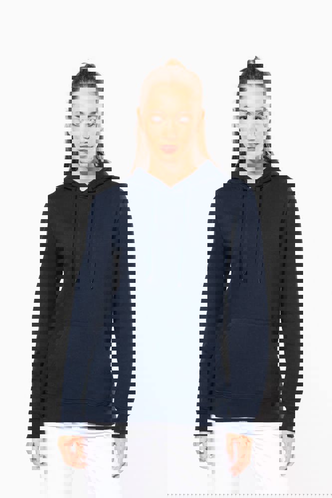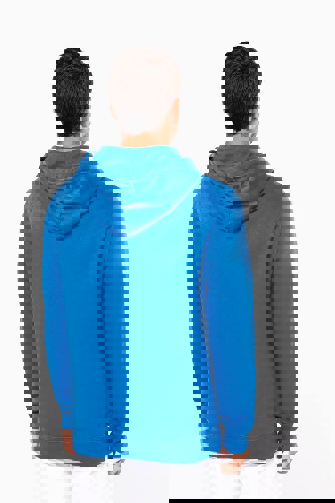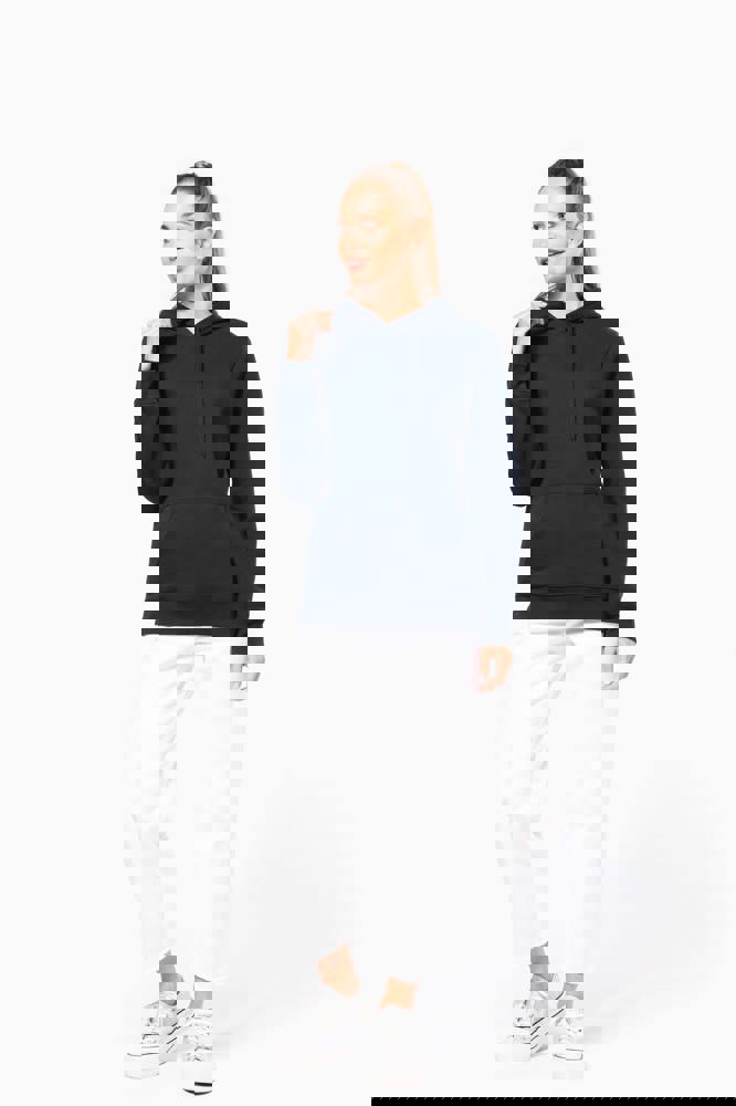 80% katoen / 20% polyester. Geborsteld LSF-fleece 3 draden (Low Shrinkage Fleece), behandeld tegen pluizen. Gemaakt in Portugal. Straight snit. Cut-and-sew-techniek. 1x1 ribboord in buisconstructie voor een betere afwerking aan de mouwuiteinden en de onderkant. Kangoeroezak. Gevoerde capuchon in 100% jerseykatoen met platte aanrijgkoordjes die door knoopsgaten lopen. Halvemaanvormige afwerking aan de binnenkant van de kraag. Dubbel stiksel aan de mouwuiteinden en de onderkant. Geen merklabel, maar een maatlabel in de kraag voor eenvoudige personalisatie.
