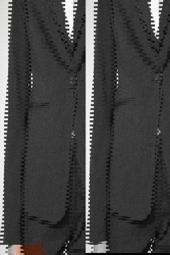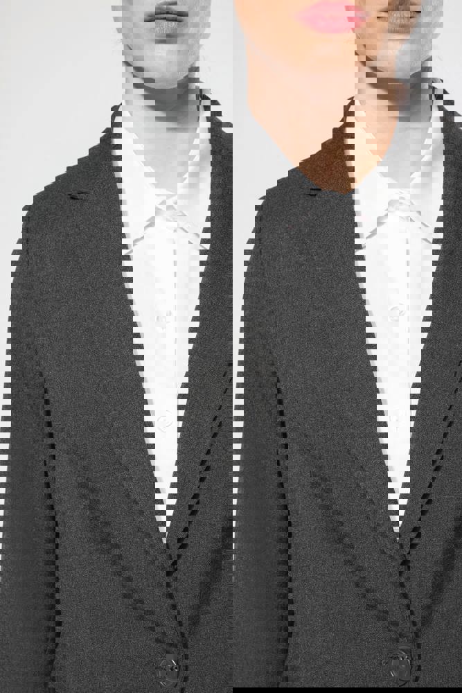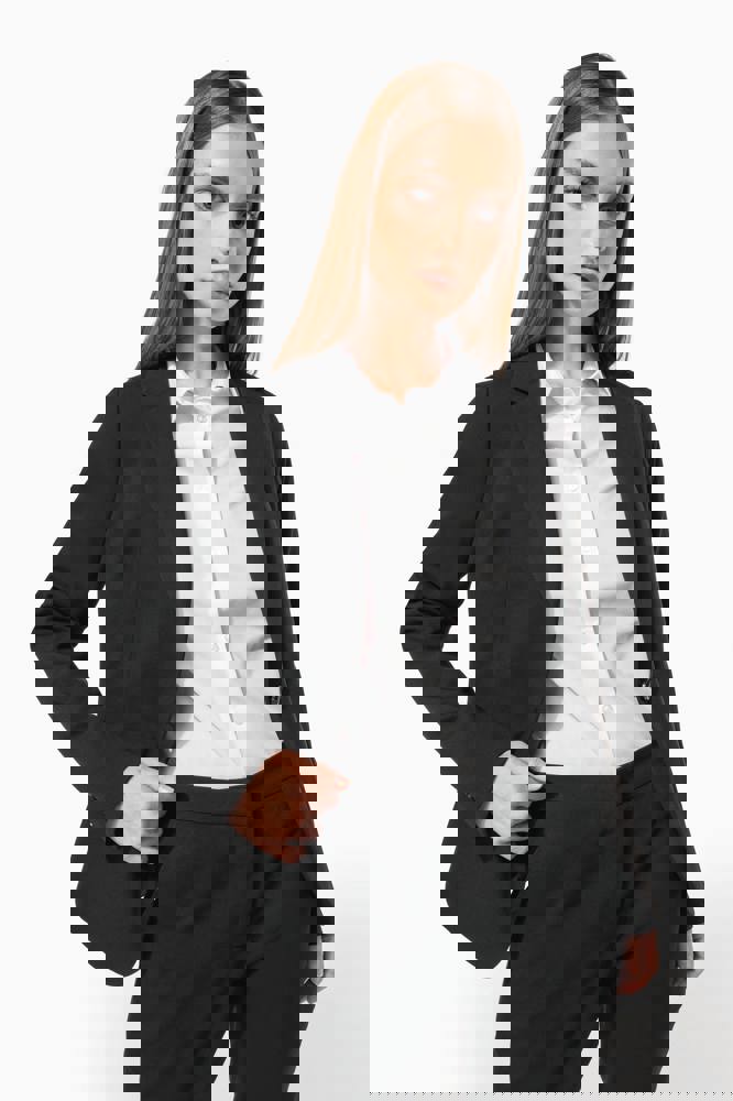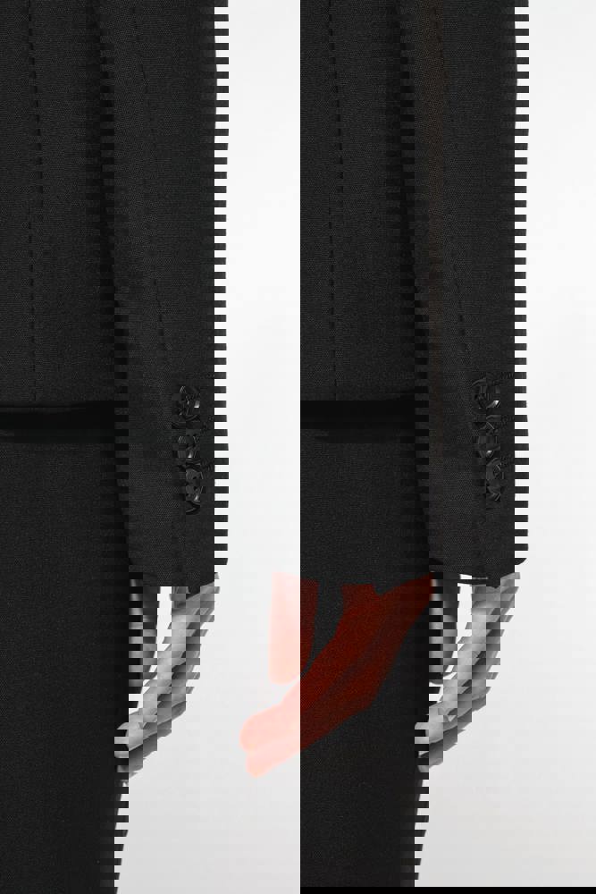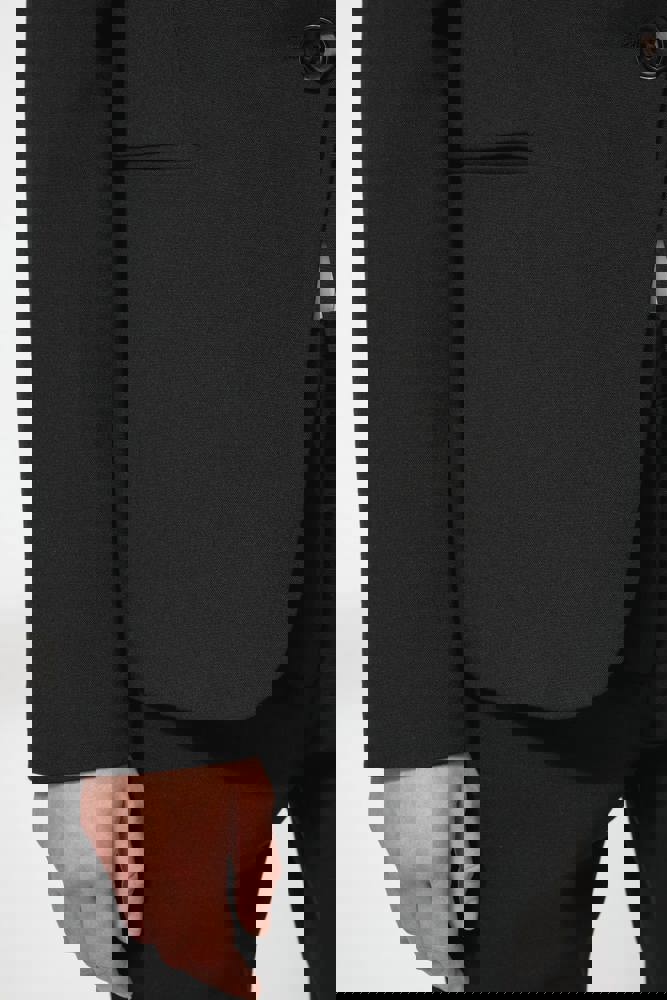 64% polyester / 34% viscose / 2% elasthan. Voering 100% tafpolyester. Jas met 1 knoop. 2 omzoomde zakken aan de voorkant. 2 binnenzakken met knoop. Mouwuiteinde met 3 knopen. 1 ruimtesplit op de achterkant.