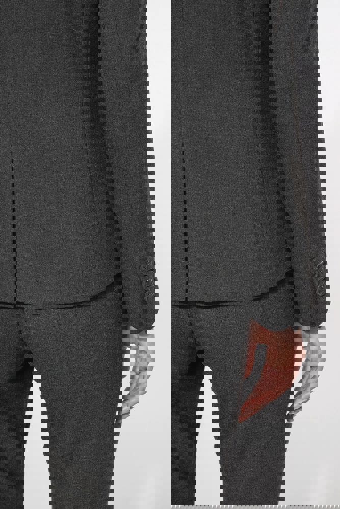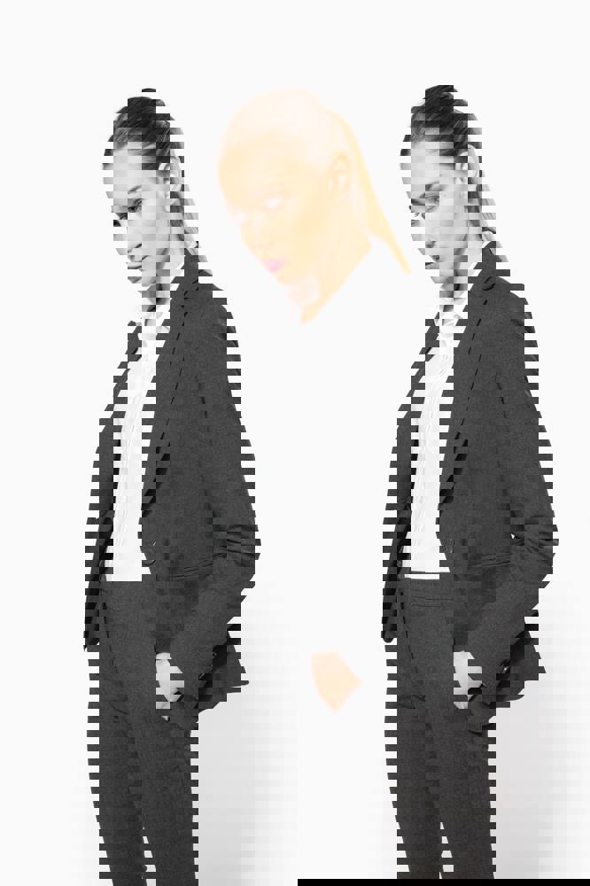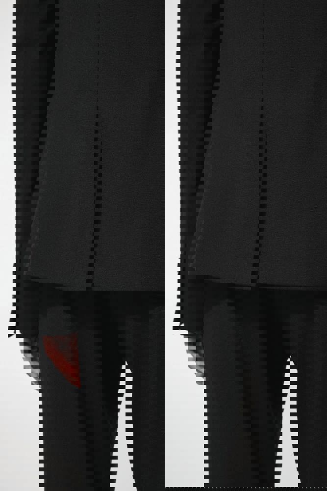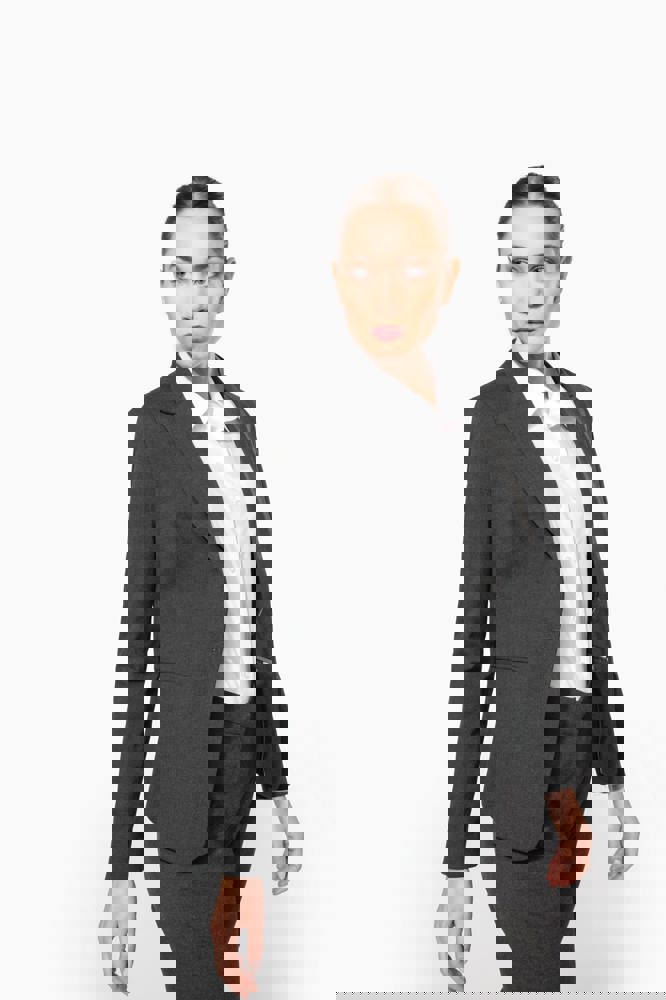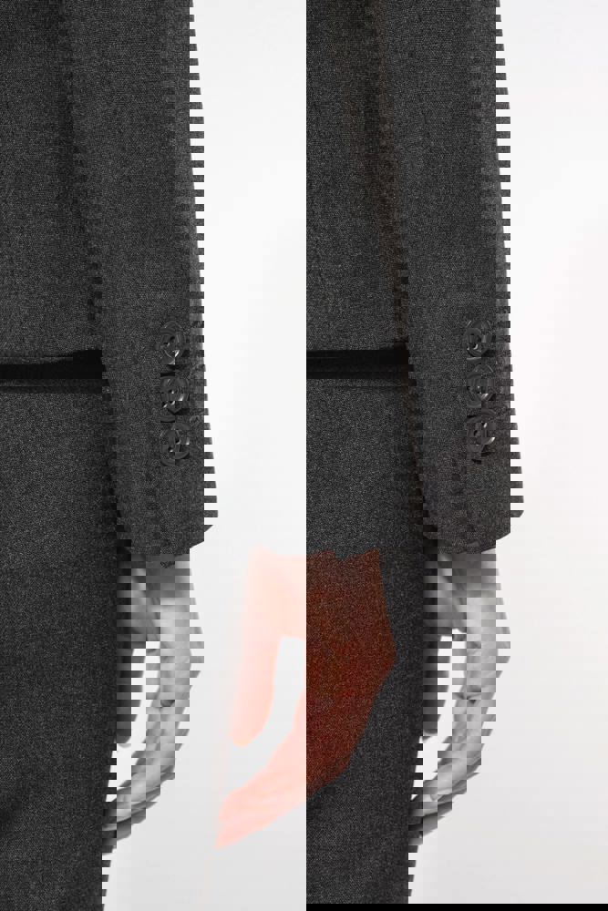 64% polyester / 34% viscose / 2% elasthan. Voering 100% tafpolyester. Jas met 1 knoop. 2 omzoomde zakken aan de voorkant. 2 binnenzakken met knoop. Mouwuiteinde met 3 knopen. 1 ruimtesplit op de achterkant.