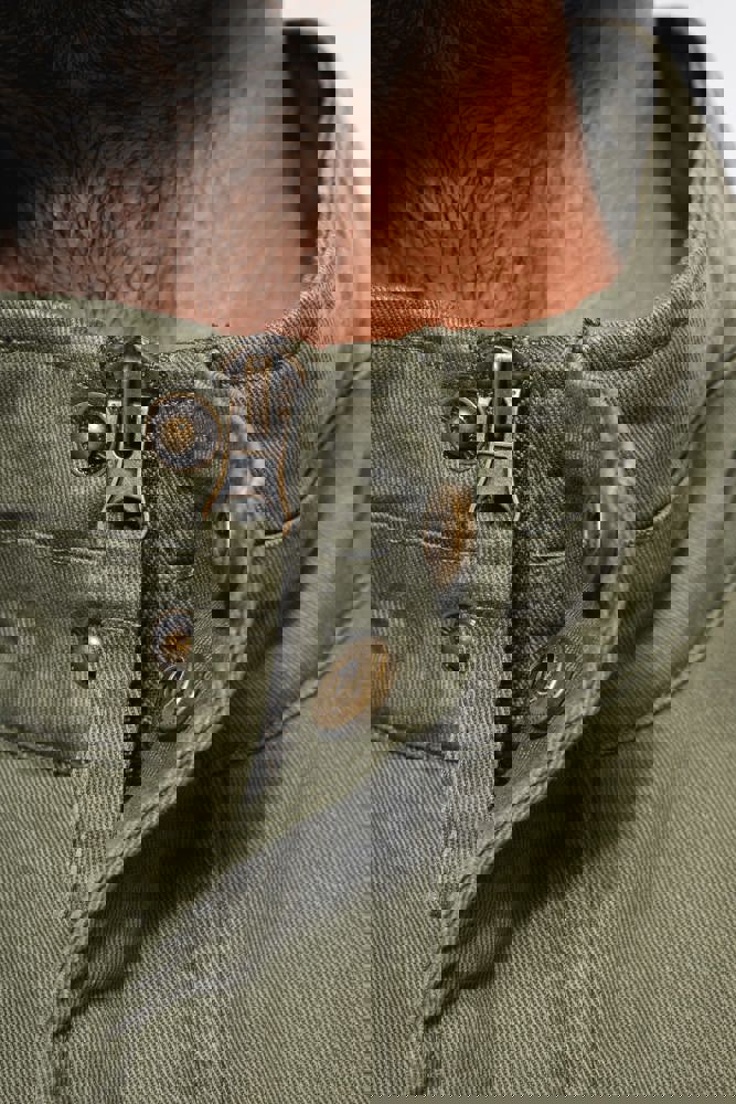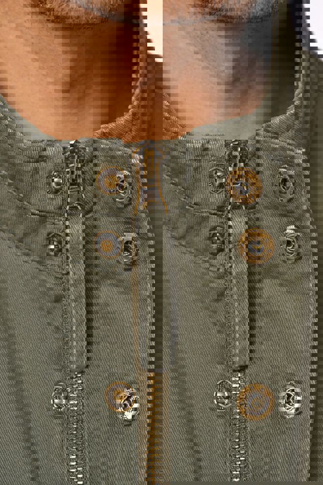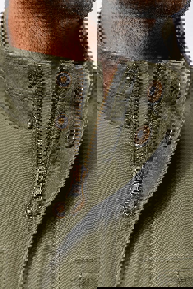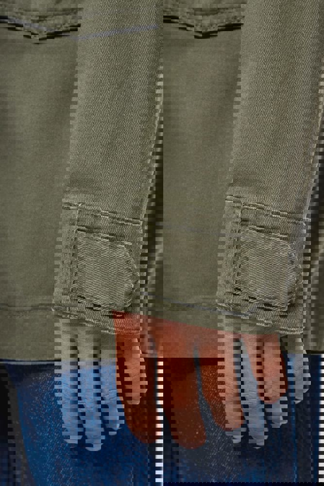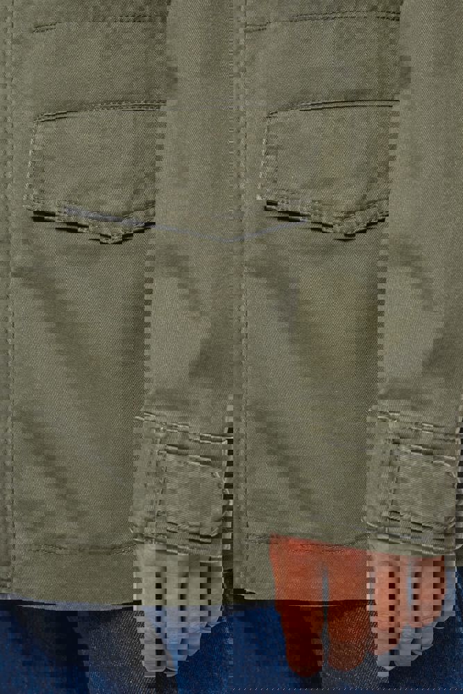 100% katoen. Twillconstructie. Regular fit. Gewassen kledingstuk. Deze techniek maakt dat er kleurverschillen kunnen zijn tussen de producten en elk stuk dus uniek is. Ritssluiting met een metalen schuiver en trekker in de hoofdstof, en een knooplijst met onzichtbare drukknopen in het midden vooraan. Binnenin afgewerkt met een oplegsel. Vier buitenzakken met een drukknoop. Pols met een sierlijst, samengehouden met een drukknoop. Verstelbare aanrijgkoordjes in de tailleband, met stopper met lederlook in het kledingstuk. Schouderlijst met knoop. Binnenzak met klittenband. Halve maan voor eenvoudige personalisatie en ophanglus binnenin.