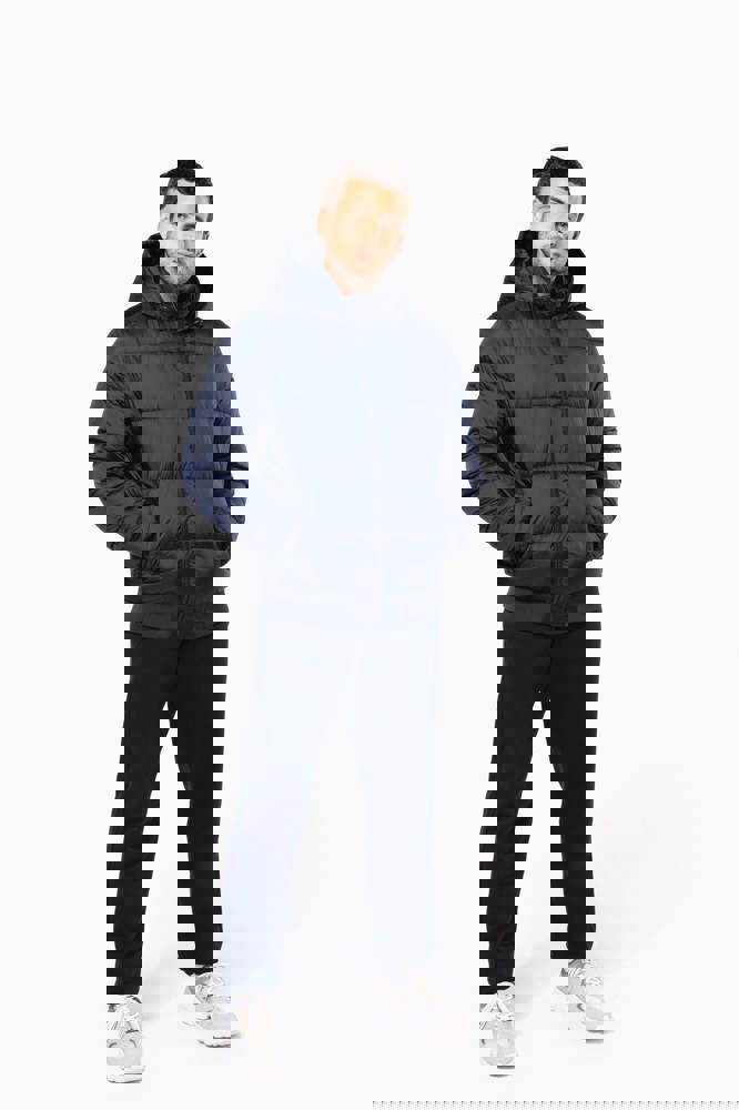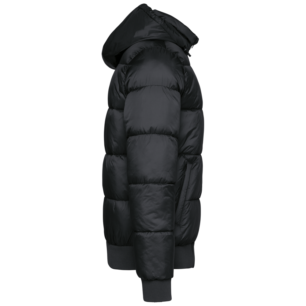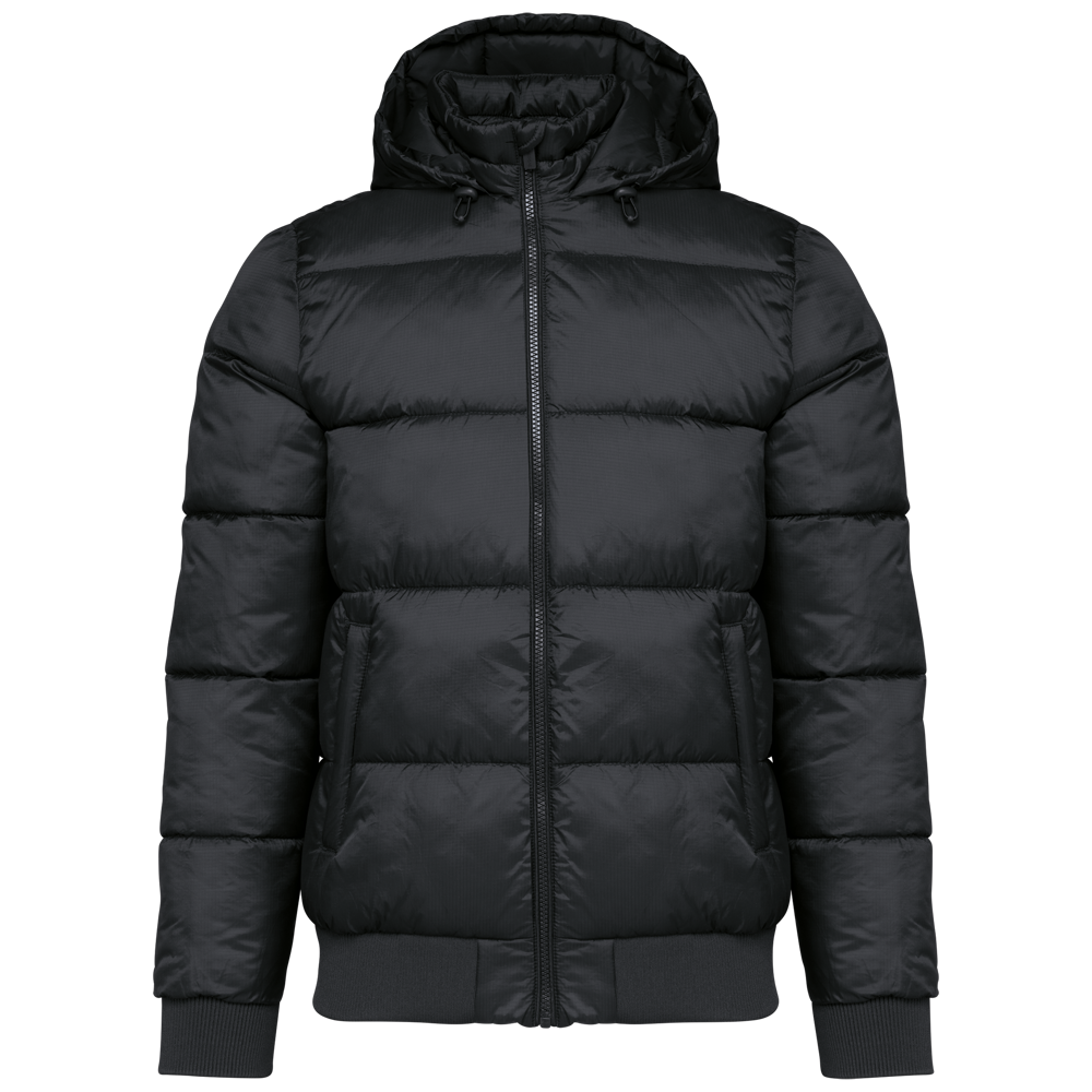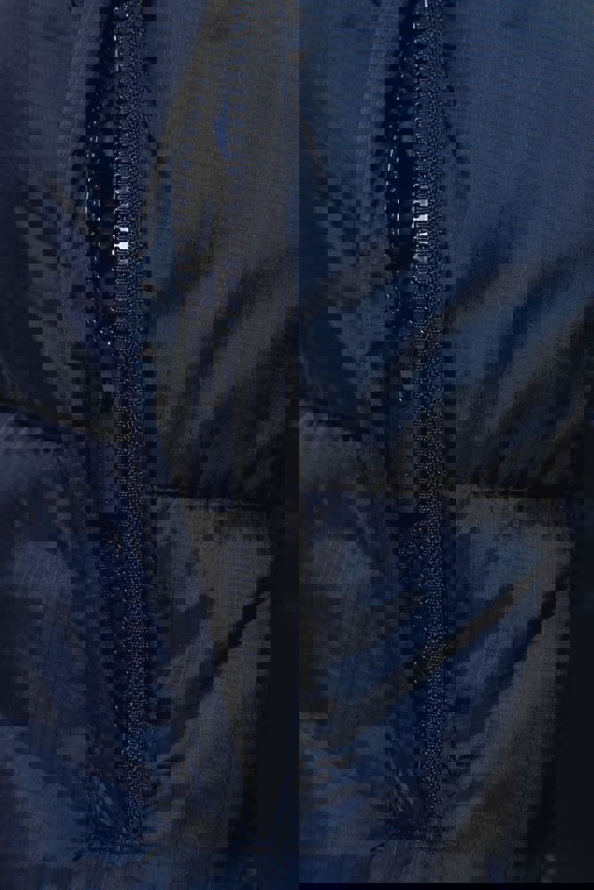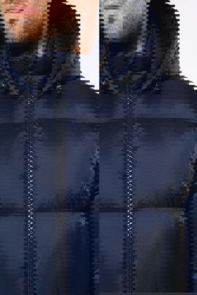 100% gerecycleerd 380T-ripstoppolyamide. Waterafstotende stof. Binnenvoering 100% gerecycleerd polyester. Voering 100% gerecycleerd polyamide. Straight snit. 2 omzoomde ritszakken opzij. 1 opgezette binnenzak met klittenbandsluiting. Ritssluiting aan de voorkant. Opstaande kraag met een gevoerde, gewatteerde, 3-delige capuchon die verstelbaar is met een stopper. Ribboord aan de mouwuiteinden en onderaan. Verborgen drukkersrits aan de binnenkant linkerborst en onder aan het kledingstuk. Geïnjecteerde vulling: het gewicht kan variëren afhankelijk van de zones van het kledingstuk. Het totaalgewicht is indicatief.