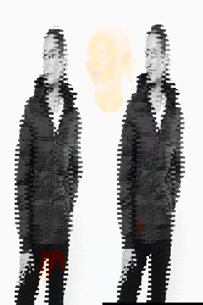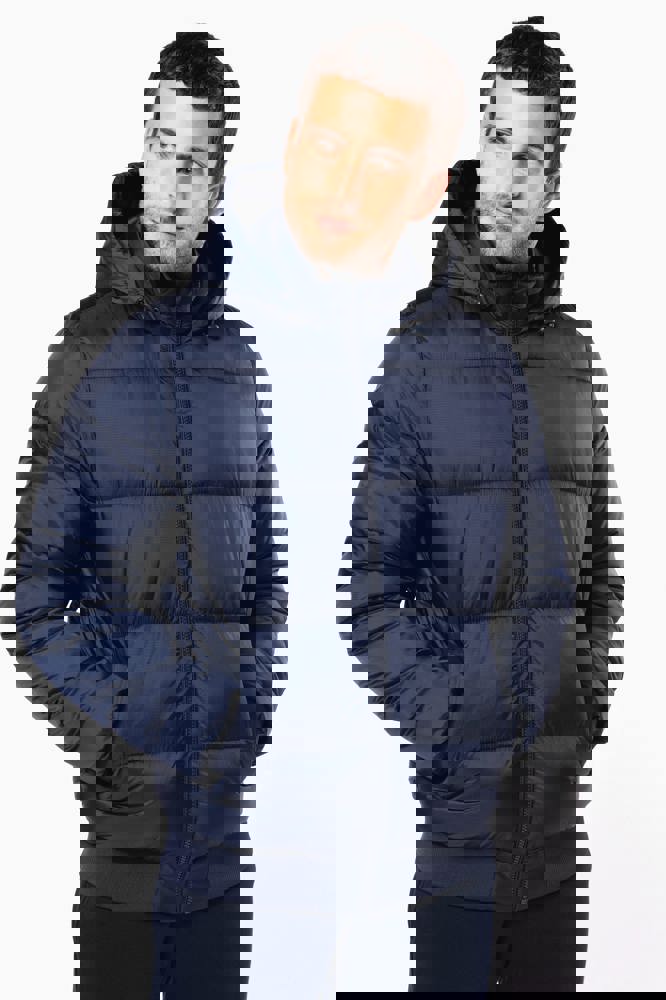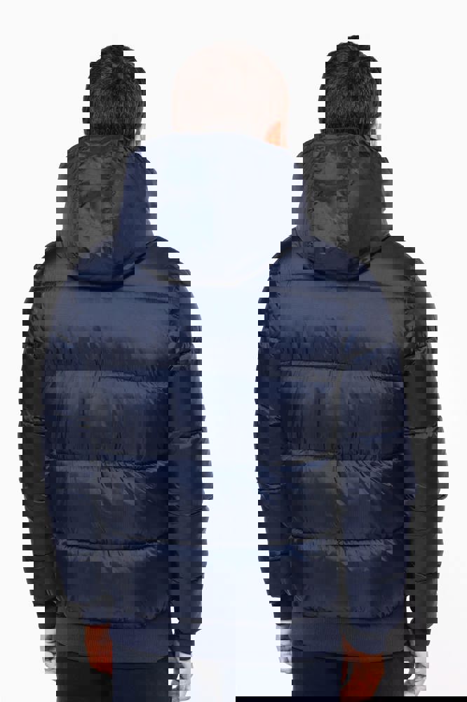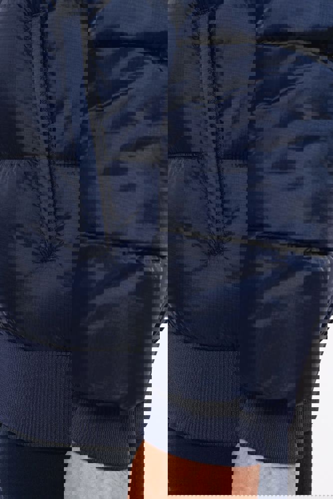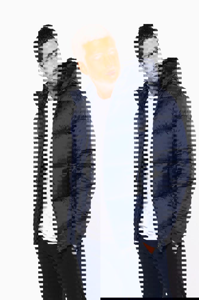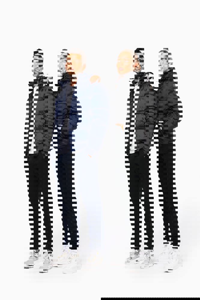 100% gerecycleerd 380T-ripstoppolyamide. Waterafstotende stof. Binnenvoering 100% gerecycleerd polyester. Voering 100% gerecycleerd polyamide. Straight snit. 2 omzoomde ritszakken opzij. 1 opgezette binnenzak met klittenbandsluiting. Ritssluiting aan de voorkant. Opstaande kraag met een gevoerde, gewatteerde, 3-delige capuchon die verstelbaar is met een stopper. Ribboord aan de mouwuiteinden en onderaan. Verborgen drukkersrits aan de binnenkant linkerborst en onder aan het kledingstuk. Geïnjecteerde vulling: het gewicht kan variëren afhankelijk van de zones van het kledingstuk. Het totaalgewicht is indicatief.