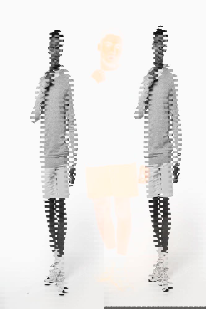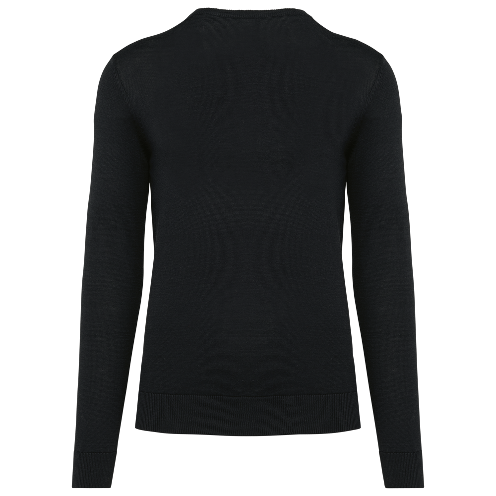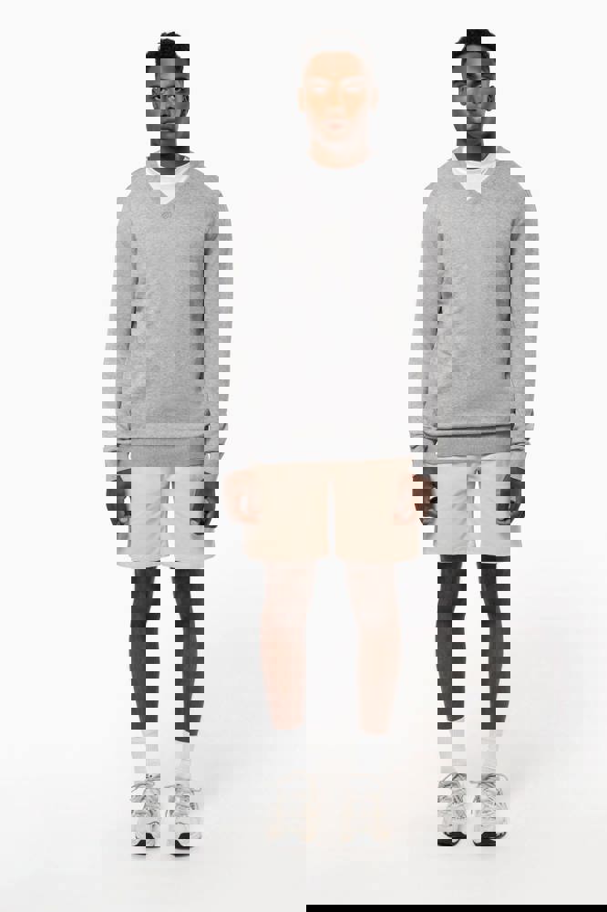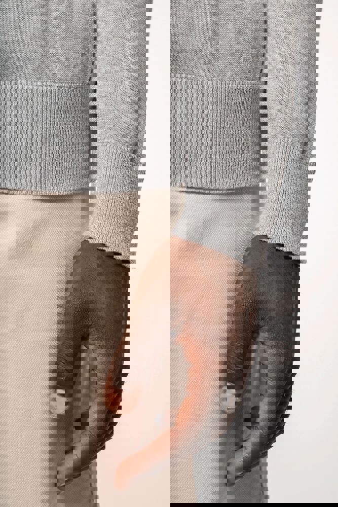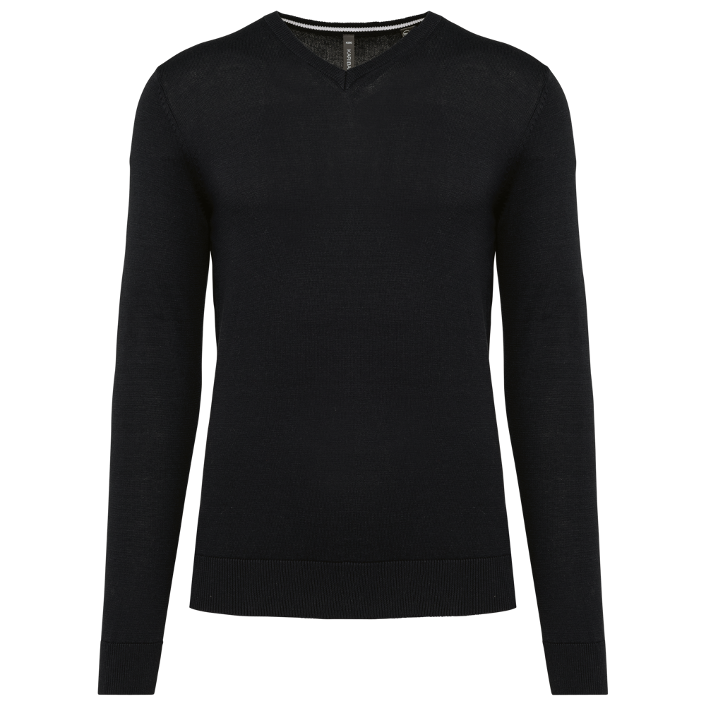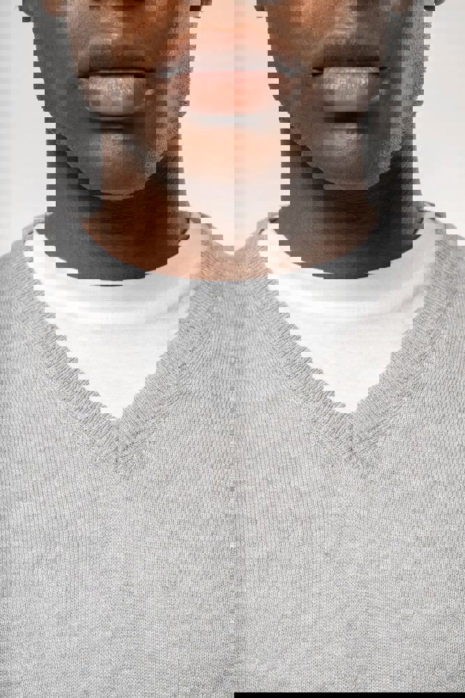 50% katoen / 50% polyester. Gemaakt van 50% biologisch katoen en 50% gerecycleerd polyester post-consumer. Gauge 12. Fully Fashion breiwerk. Rechte snit. Ingezette mouwen. V-hals met 1x1 ribboord met een dun, contrasterend streepje van 3 mm aan de binnenkant van de kraag. 1x1 ribboord aan de mouwuiteinden en onderaan. Tear-away merklabel.