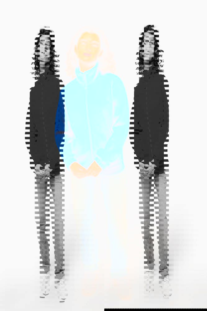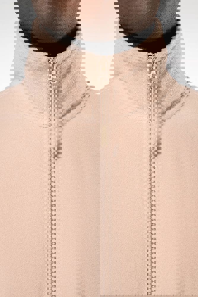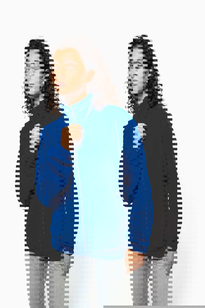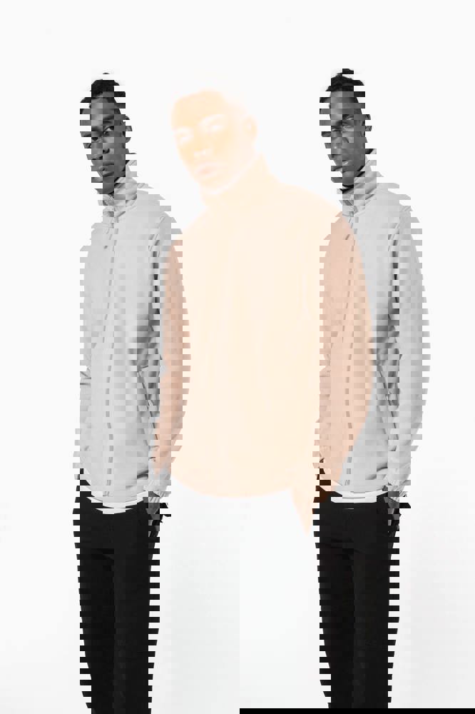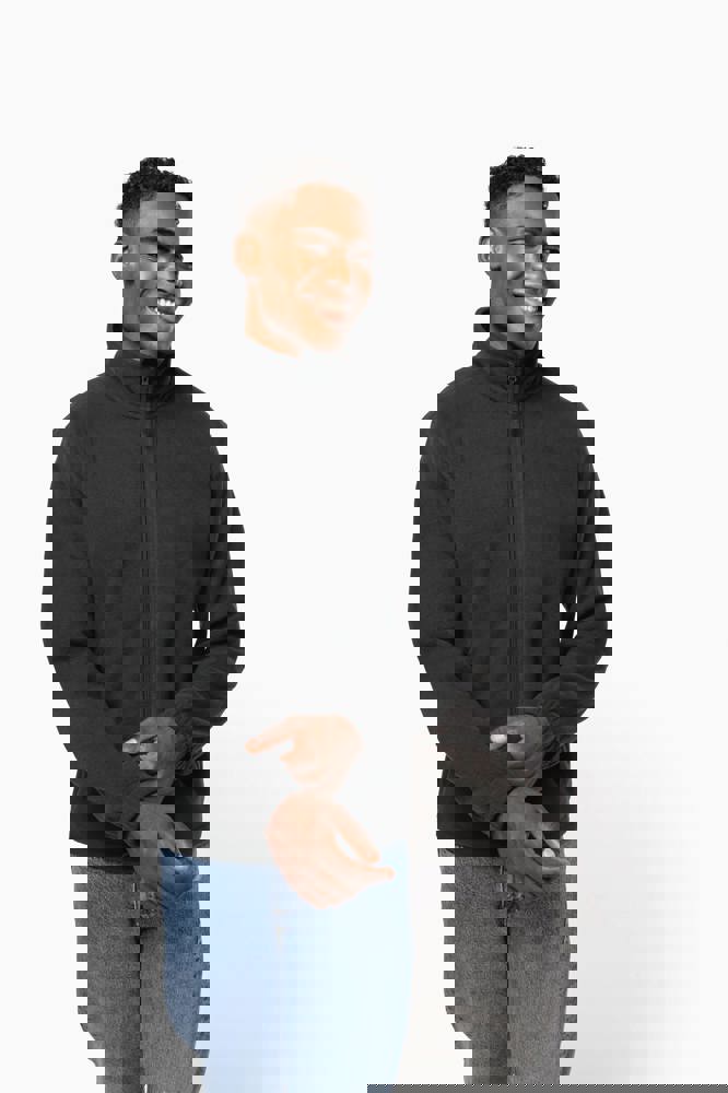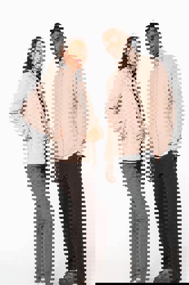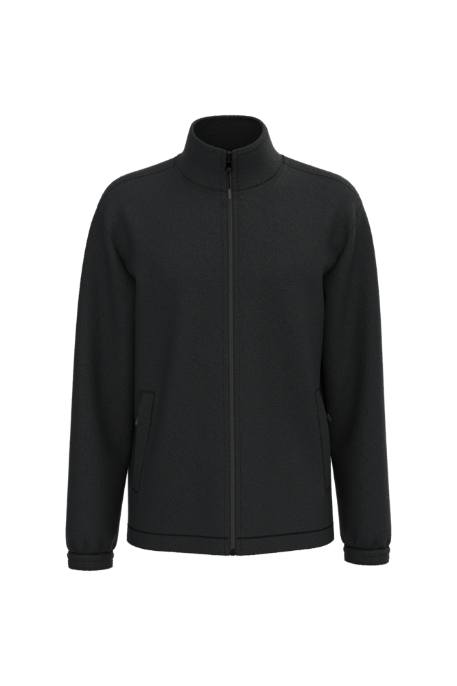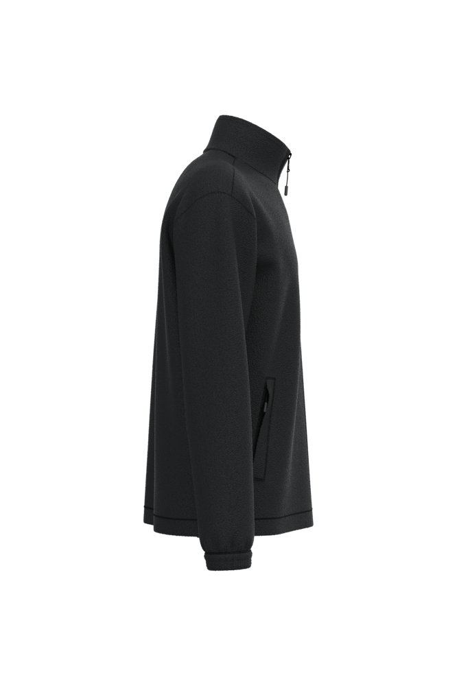 100% microfleece polyester met antipluisbehandeling. 2 omzoomde ritszakken opzij. Ritssluiting. Elastische mouwuiteinden. Boord verstelbaar met elastische aanrijgkoordjes (de elastiek zit aan de binnenkant vast om hem te verbergen).