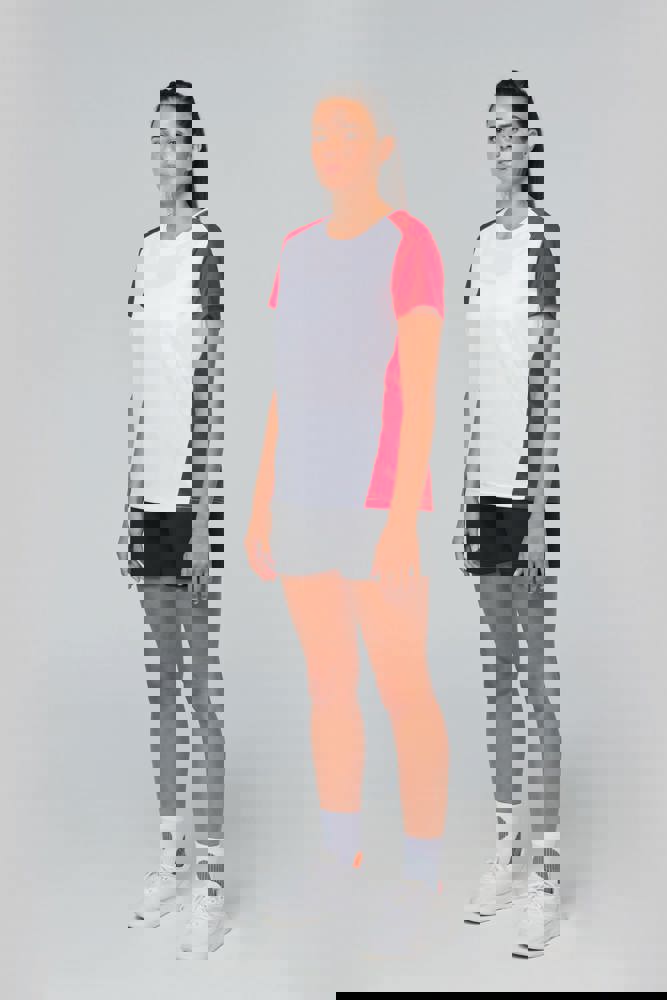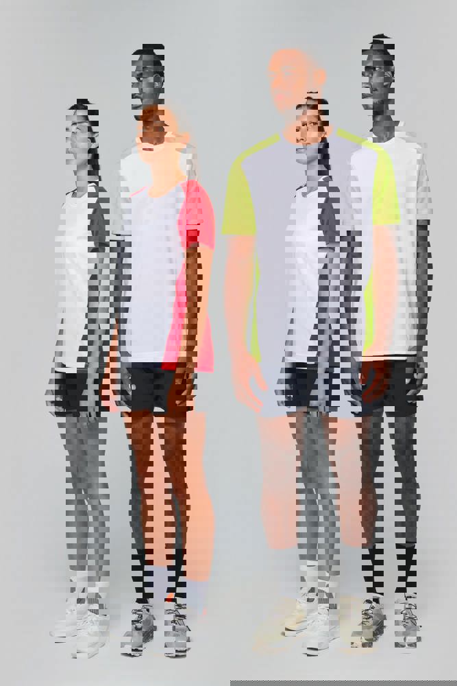 100% post-consumer gerecycled birdseye-polyester. Lichte, sneldrogende stof. Rechte snit. Ronde hals met nektape. Ingezette mouwen. Uitsnijdingen op schouders, mouwen en achterkant. Contrasterende schuine voorkant. Dubbel stiksel op mouwuiteinden en boord onderaan. Afneembaar merklabel.