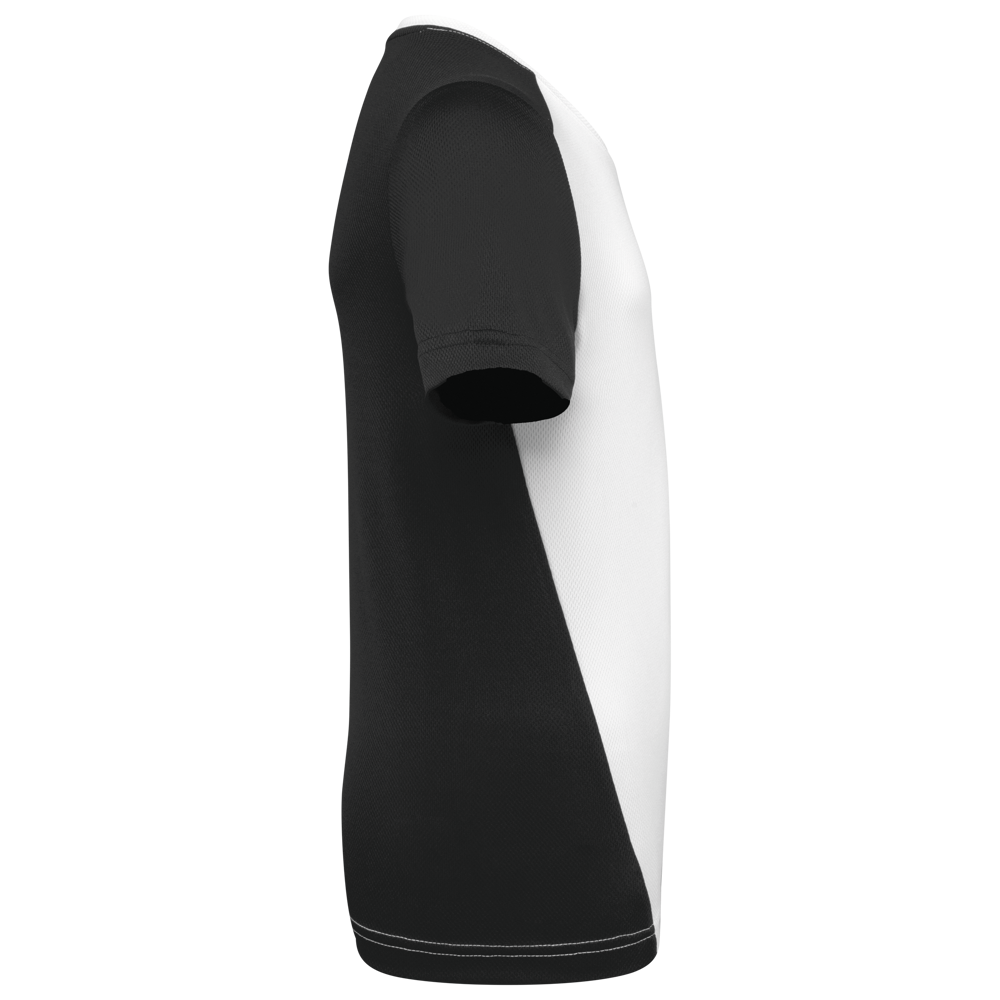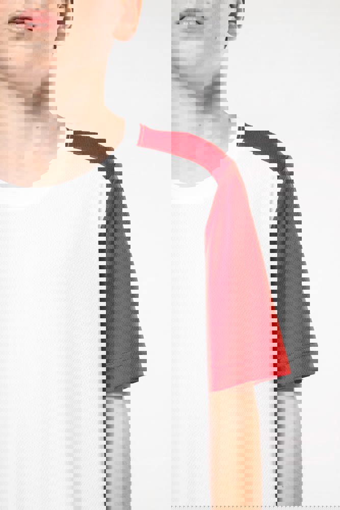 100% post-consumer gerecycled birdseye-polyester. Lichte, sneldrogende stof. Rechte snit. Ronde hals met nektape. Ingezette mouwen. Contrasterende uitsnijdingen op schouders, mouwen en paneel met biesje voor- en achteraan. Dubbel stiksel op mouwuiteinden en boord onderaan. Afneembaar merklabel.