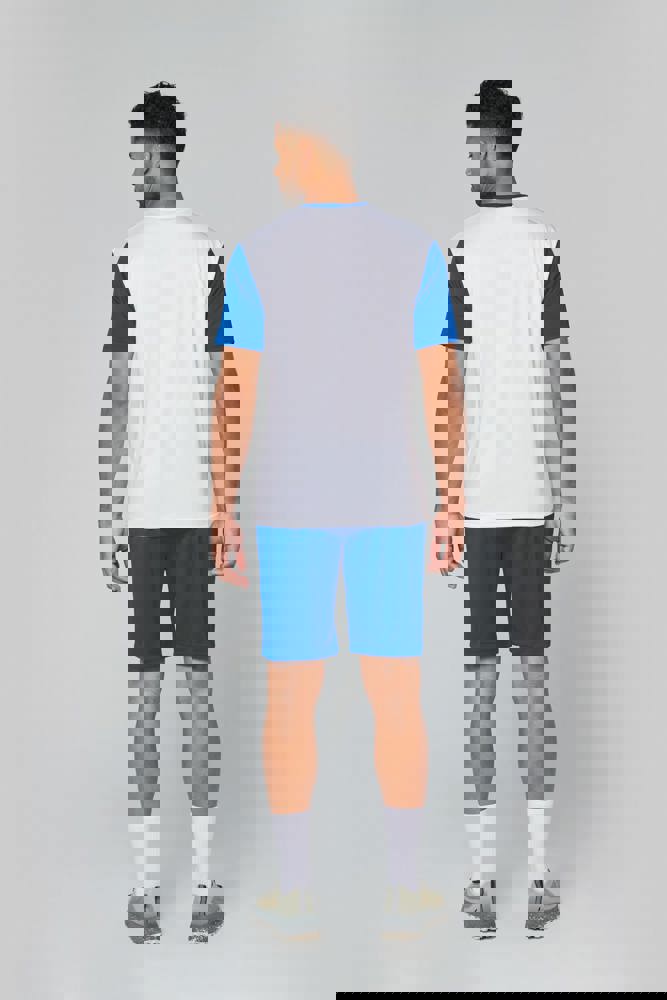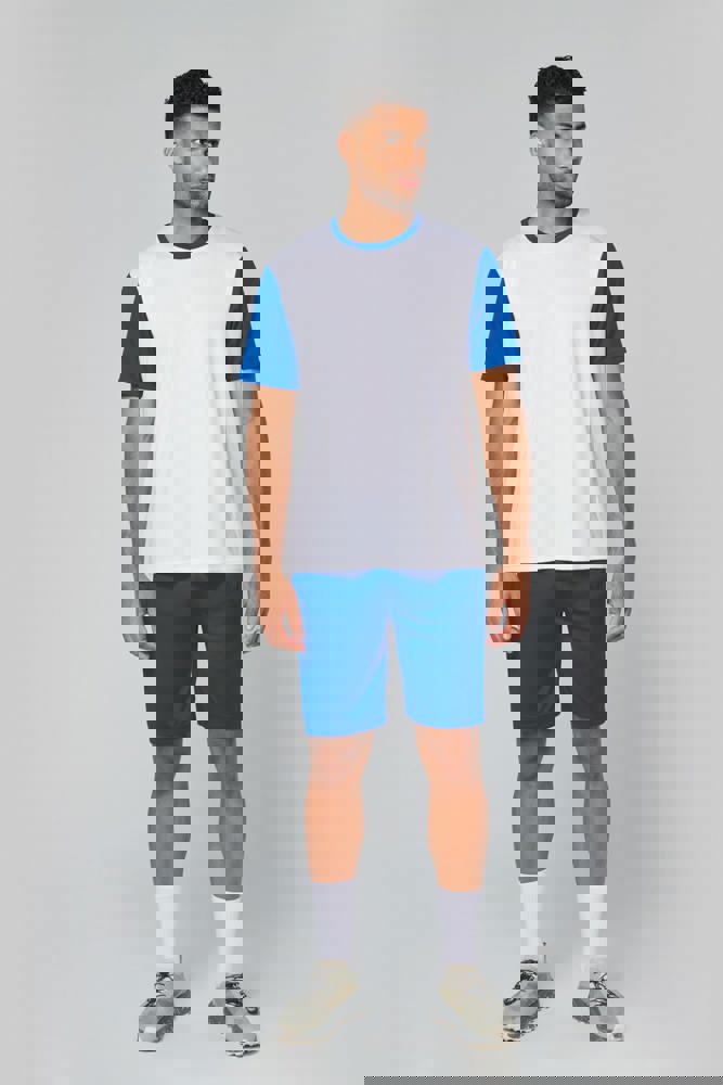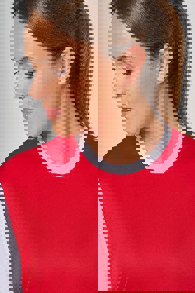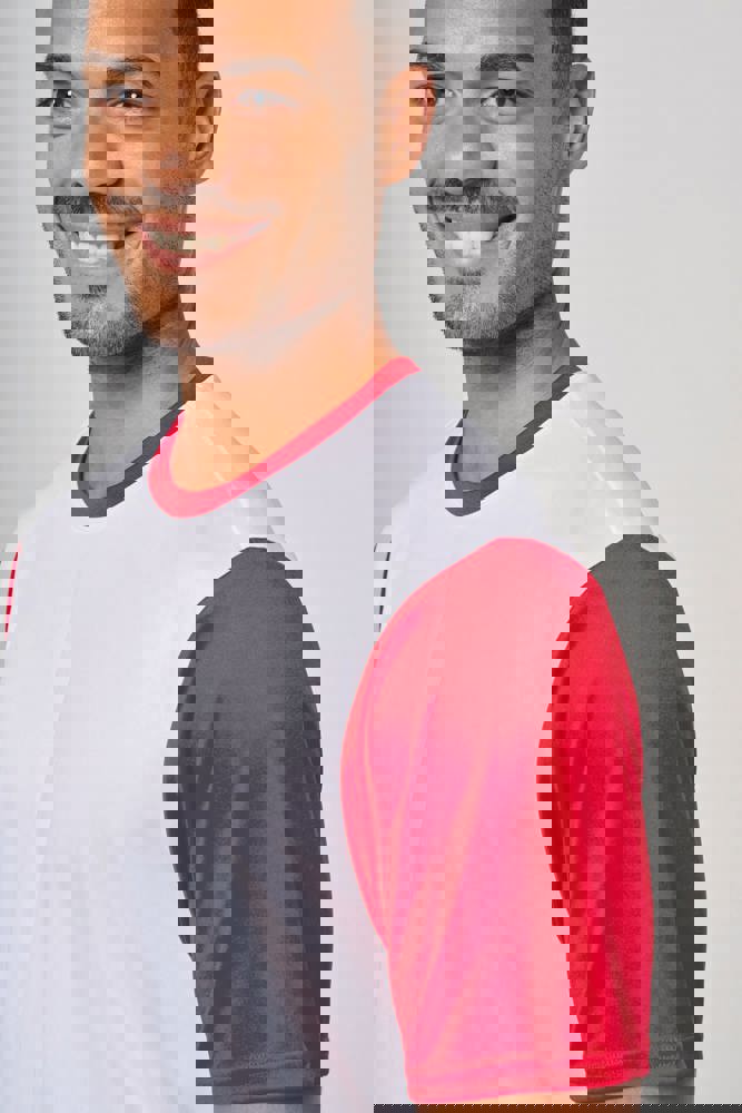 100% polyester. Interlock gaas. Rechte snit. Contrasterende ronde halslijn en nektape. Contrasterende rechte mouwen. Dubbelnaaldsafwerking op de onderste mouwen en het kledingstuk.