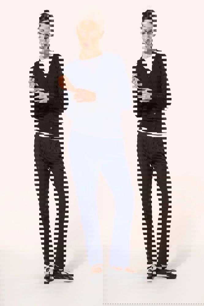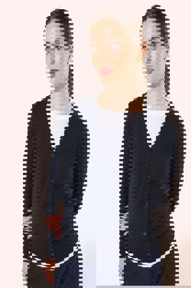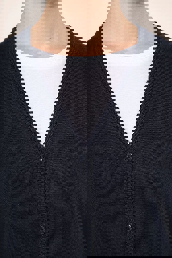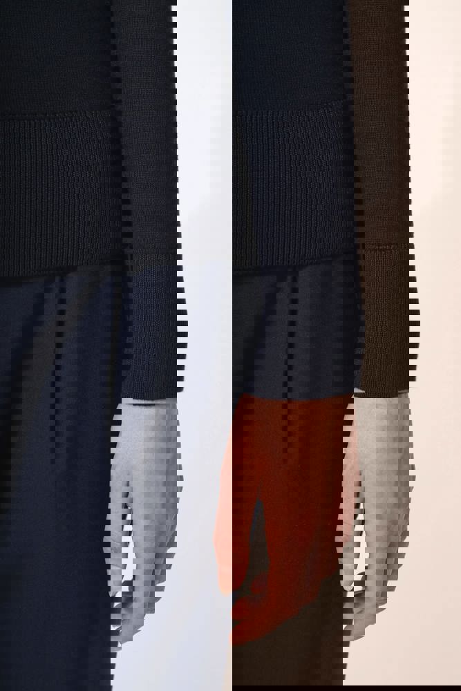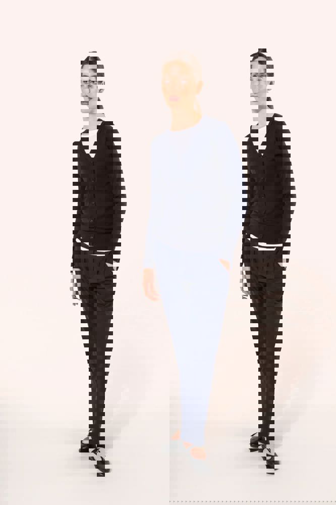 100% Supima® katoen. Gekamd katoen. Gauge 12. Stof van topkwaliteit. Fully-fashioned: gebreid in de vorm en geassembleerd op de machine. Halsopening, mouwuiteinden en onderkant in 1x1 ribboord. Knoopsgat met plastic knopen. Ton-sur-ton.