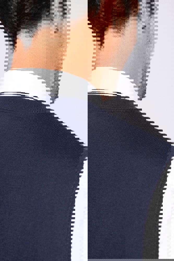 100% Supima® katoen. Gekamd katoen. Gauge 12. Rechte snit. Fully-fashioned afgewerkte mouwopening: gebreid in de vorm en geassembleerd op de machine. Halsopening, knoopsgat en onderzijde in 1x1 ribboord. Mouwopening in gevoerde 1x1 ribboord. Knooplijst met toon-op-toon knopen. Geen merklabel, maar enkel een maatlabel voor eenvoudige personalisatie.
