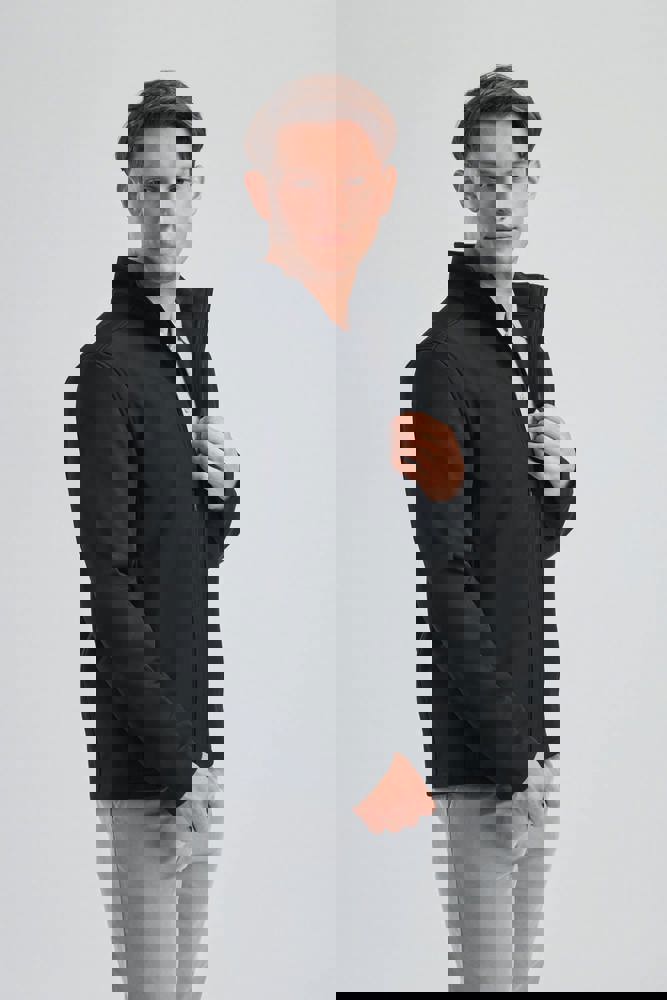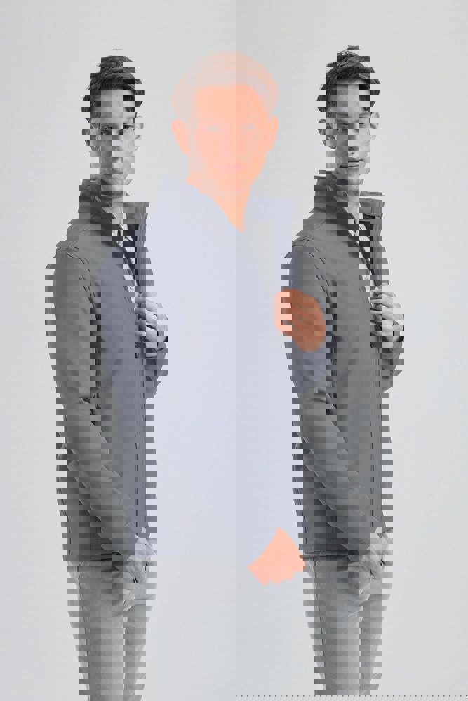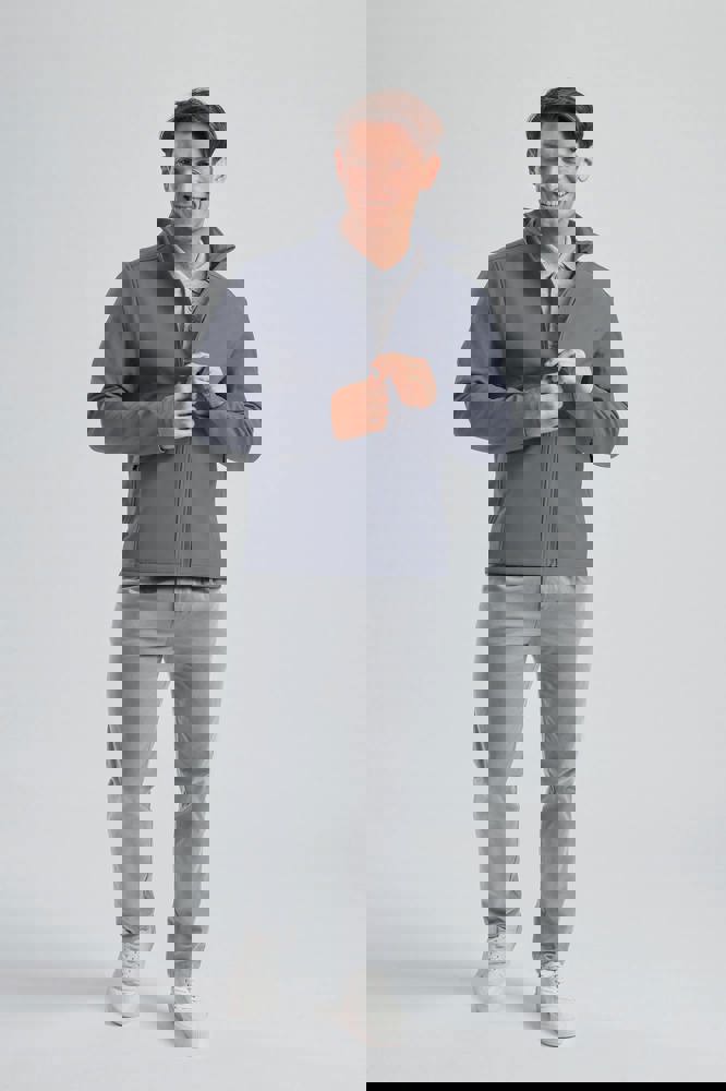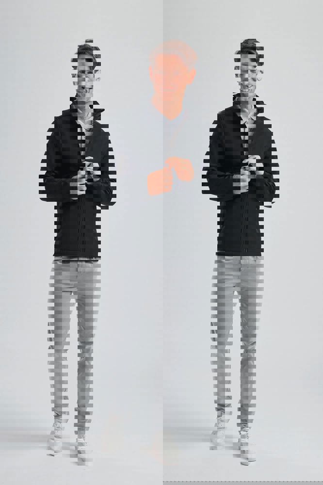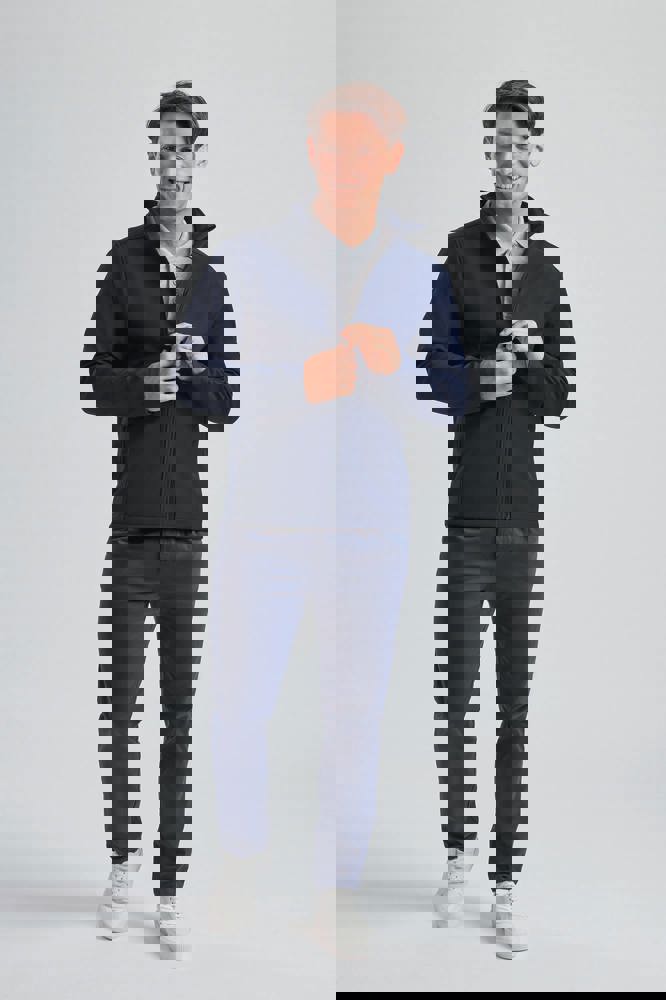 94% polyester / 6% elasthan. Klassieke pasvorm. 2-laags softshell stof met waterafstotende behandeling (PFC-vrij). Officierskraag. Stormflap. Zijzakken. Microfleece voering.