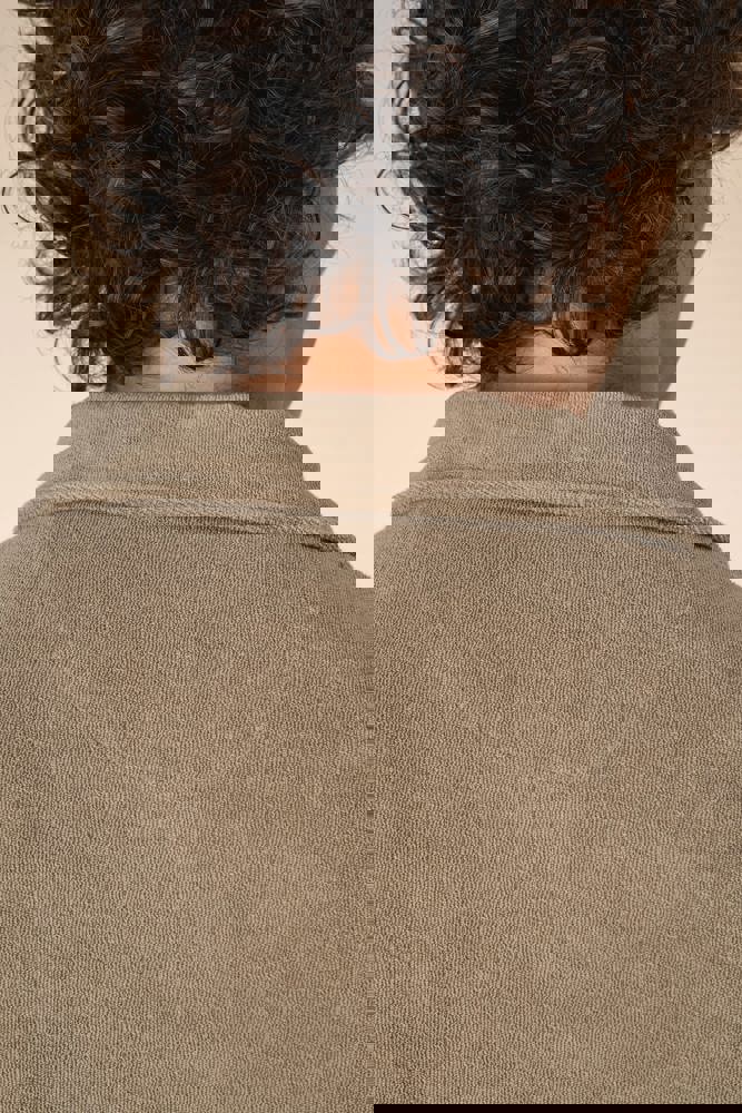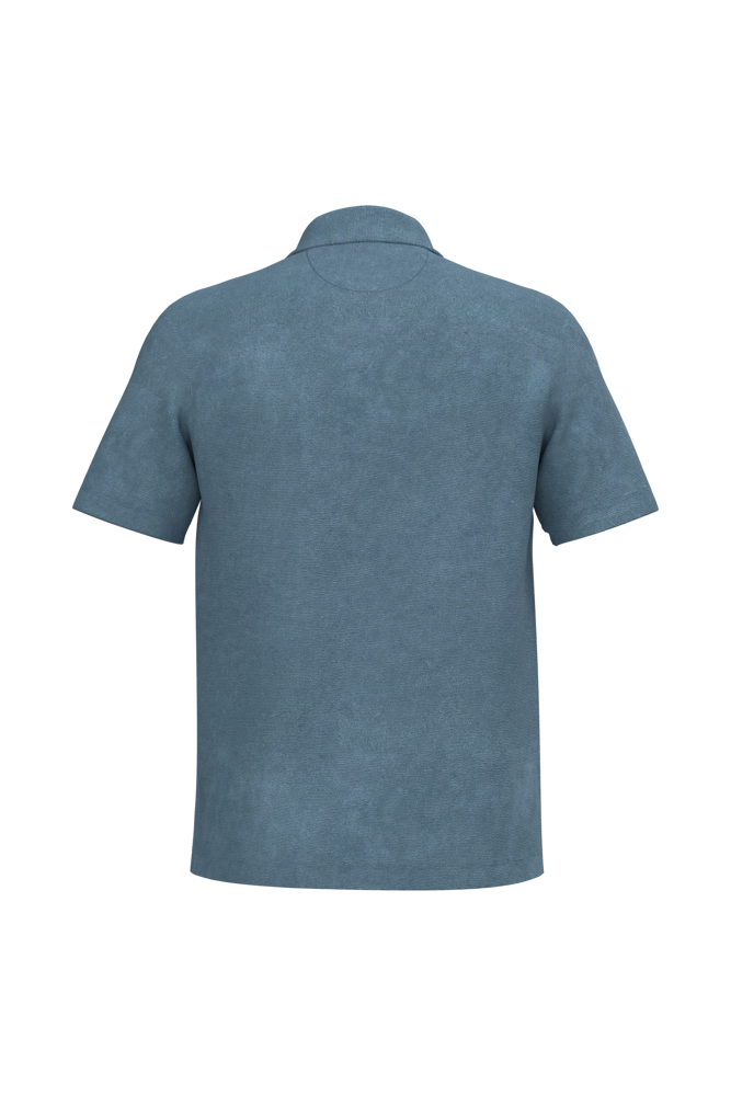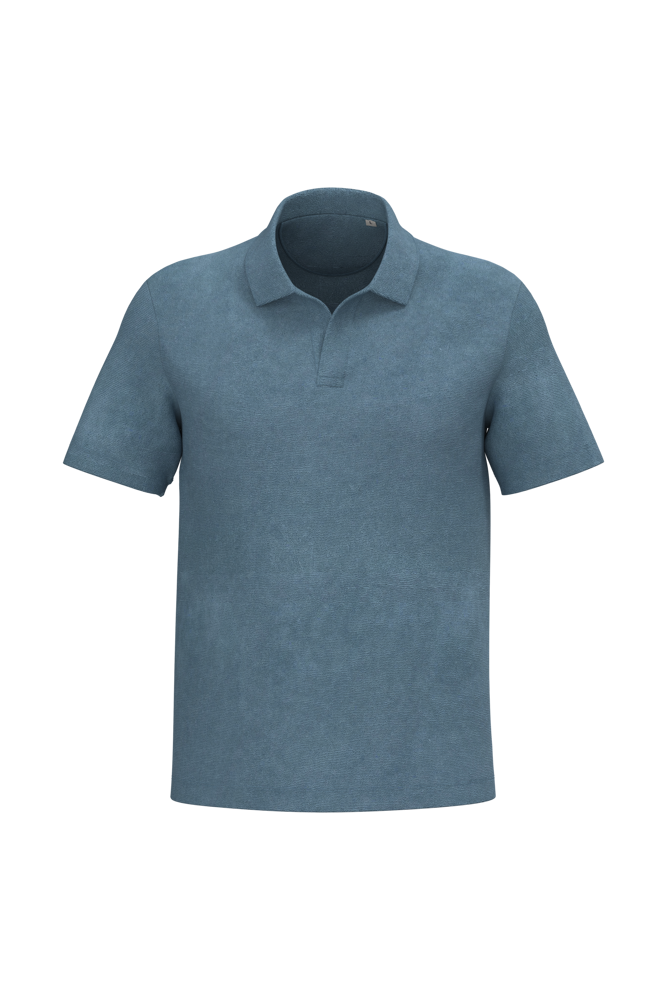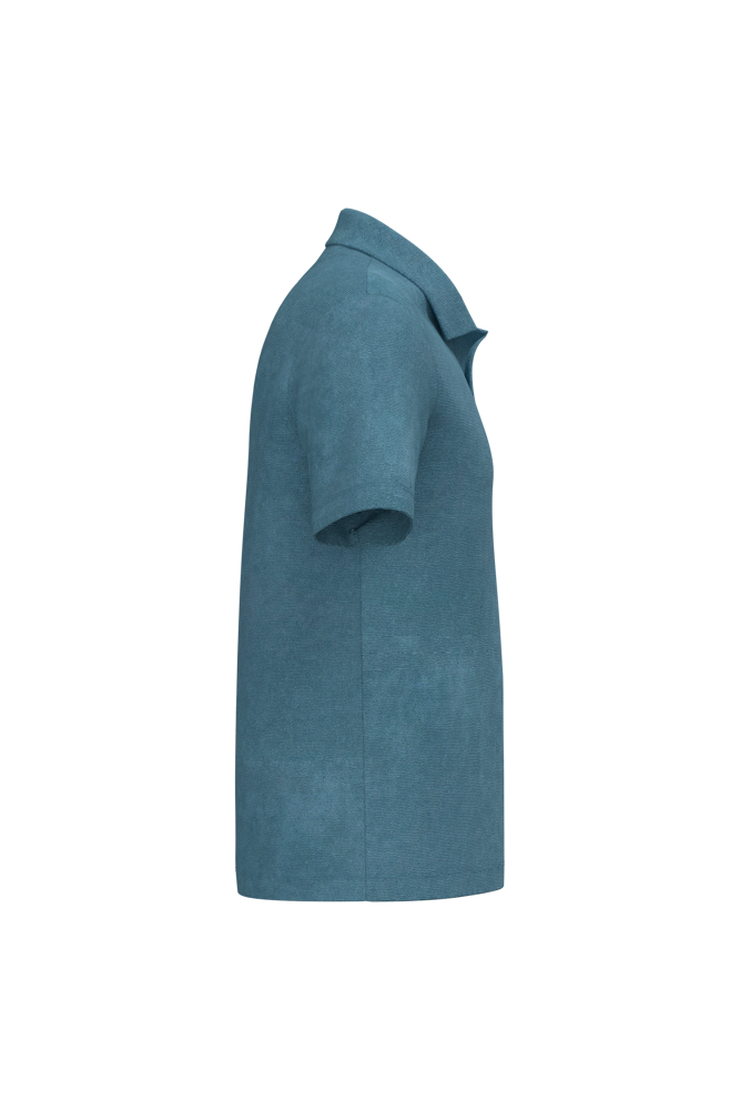 80% biologisch katoen / 20% post-consumer gerecycled polyester. Gemaakt in Portugal. Gekamd katoen. In spons. Rechte snit. Enzymgewassen. Polokraag en V-hals zonder knoopje in de hoofdstof. Schouderversteviging. Afgewerkt met dubbel stiksel aan de mouwuiteinden en de onderkant. Halvemaan op de achterkant.