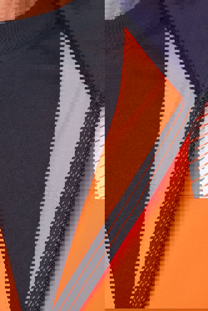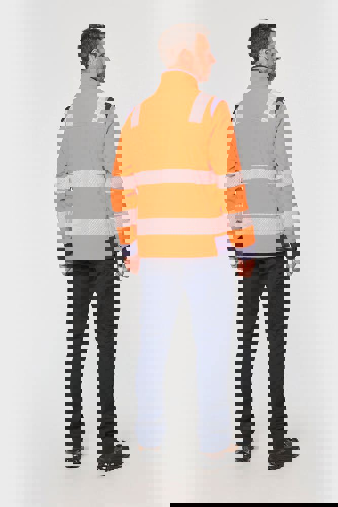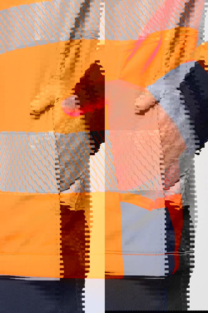 94% gerecycled polyester / 6% elastaan. 3-laags ademend gelamineerd materiaal met een waterdampdoorlaatbaarheid van 3000g/m²/24u en een waterdichtheid van 5000mm. Buitenkant: 94% gerecycled polyester / 6% elastaan. Tussenlaag: ademende en waterdichte membraan. Binnenlaag: 100% gerecycled polyester microfleece. Wasbaar op 40°C (25 wasbeurten). Nylon rits met kinbescherming en ritstrekkertje. 1 verticale borstzak met rits aan de rechterkant. 2 zijzakken met rits. 2 binnenzakken. Verstelbare manchetten met klittenband. Afneembare mouwen met rits. Onderaan verstelbaar met een trekkoord. Contrasterende inzetstukken op schouders, manchetten en zijkanten. Contrasterende binnenkant kraag en nekband. Ophanglus aan de binnenkant van de kraag. 5,5 cm gesegmenteerde reflecterende biezen op schouders, onder borst en mouwen. 7 cm retro-reflecterende gesegmenteerde banden op onderlichaam en mouwen. PBM Klasse II. Normen NF EN ISO 13688:2013 + NF EN ISO 13688/A1:2021 (Algemene eisen voor beschermende kleding), NF EN ISO 20471:2013 + NF EN ISO 20471/A1:2017: Kleding met mouwen: Klasse 2 voor maat XS en S - Klasse 3 voor maat M tot 6XL, Kleding zonder mouwen: Klasse 1 voor maat XS en S - Klasse 2 voor maat M tot 6XL (Hoogzichtbare kleding - Testmethoden en eisen), RIS-3279-TOM Issue 2:2019 alleen voor de kleur Hi Viz Orange/Navy (Norm voor de spoorwegindustrie). Afneembaar merketiket.