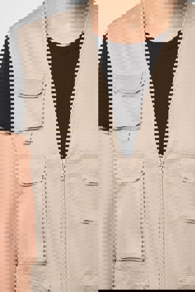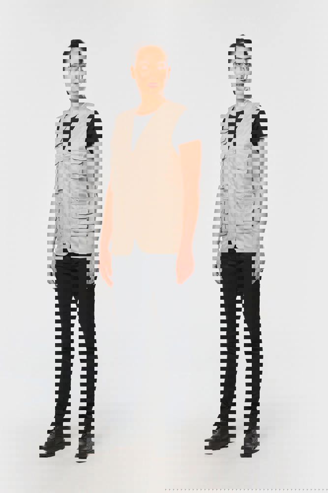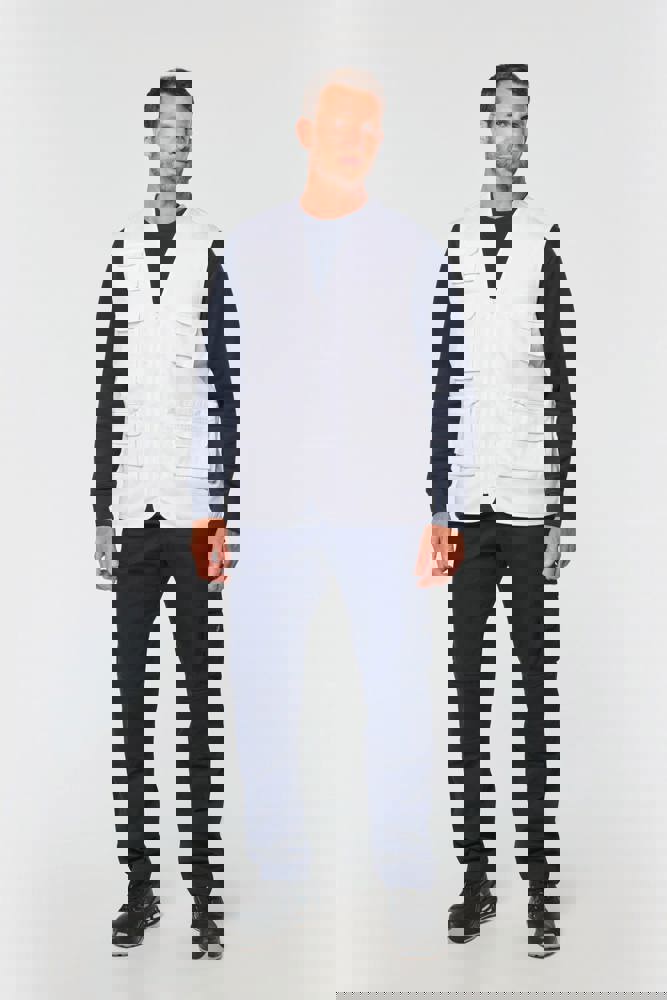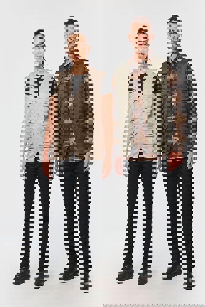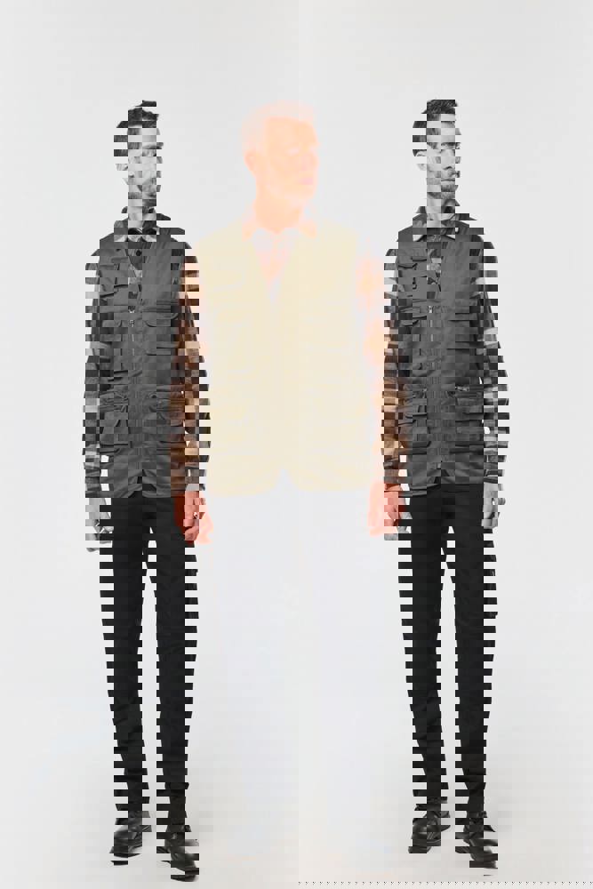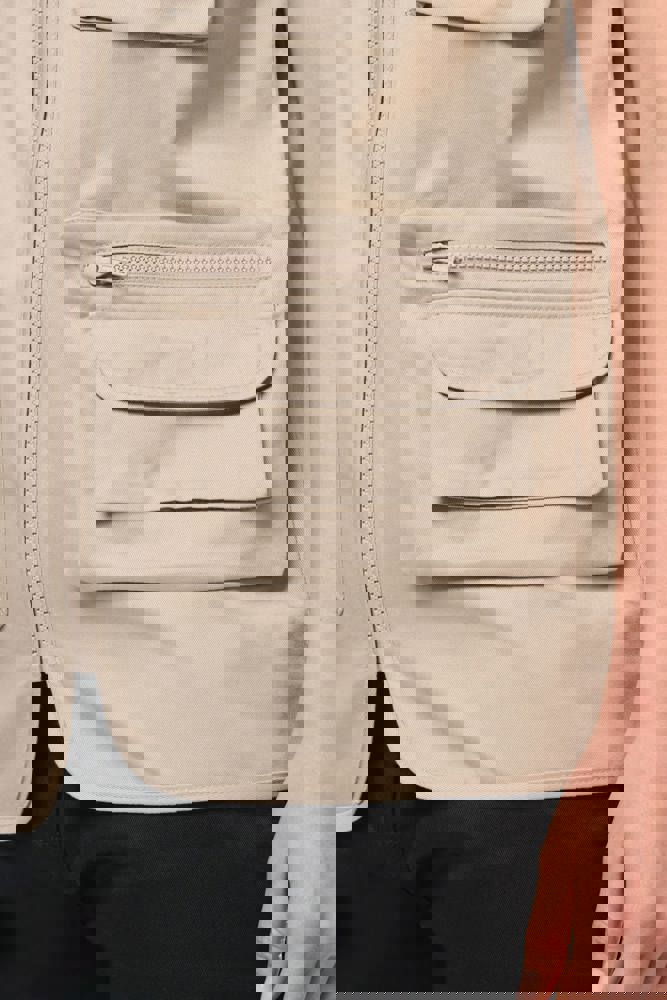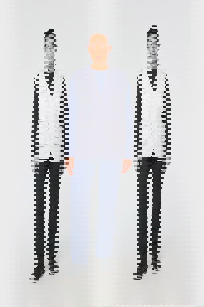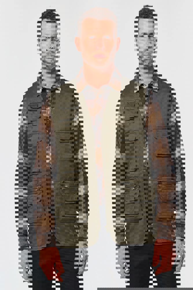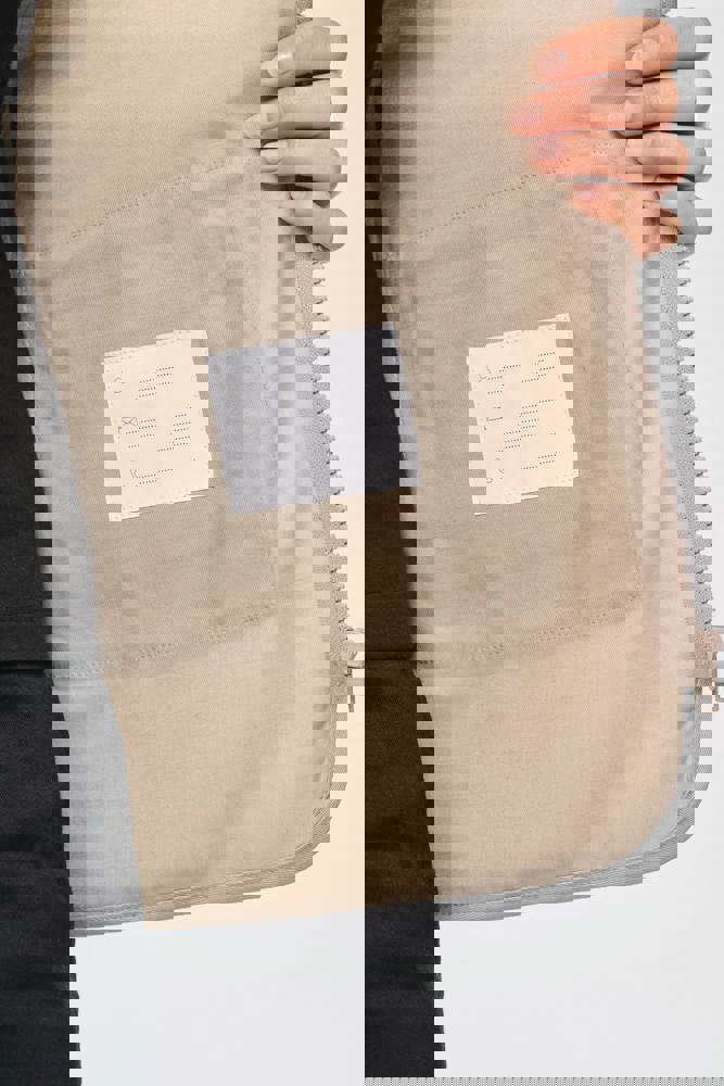 Buitenkant: 65% polyester / 35% katoen. Voering 100% polyester. Rechte snit. Voering in mesh op de helft van het achterpand. 2 dubbele opgezette zakken met plooi vooraan, waarvan 1 met klep en 1 met ton-sur-ton plastic rits + 3 opgezette zakken met plooi en klep met klittenbandsluiting in verschillende formaten. Ton-sur-ton plastic ritssluiting. Ophanglus in de kraag. Licht verlengd achterpand. Ton-sur-ton biesje aan de mouwopening en de rand van het kledingstuk. Naamlabel aan de binnenkant. Tear-away merklabel.