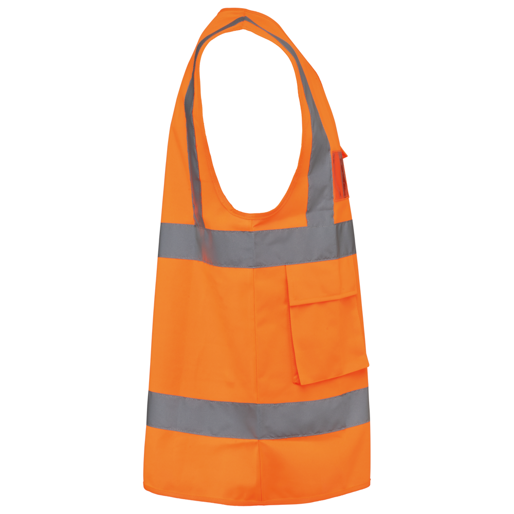 100% gerecycled polyester. Polytricot. Easy care behandeling. Wasbaar op 40°C (25 wasbeurten). Ruime pasvorm. 2 verticaal genaaide reflecterende banden van 5 cm op het lichaam en 2 horizontaal genaaide reflecterende banden van 5 cm aan de voor- en achterkant van het lichaam. Sluiting met kunststof rits (contrasterend bij tweekleurige modellen). 2 voorzakken met plooien en sluiting met klittenband. Rechterborstzijde bij dragen: 1 plooi voorzak met klittenbandsluiting + 1 compartiment met 2 penhouders + 1 plastic ring bevestigd onder het compartiment. Linkerborstzijde bij dragen: 1 transparante PVC-kaarthouder. Afwerkingsbies (contrasterend bij tweekleurige modellen). Ophanglus aan de binnenkant van de kraag. PBM Klasse II. Normen NF EN ISO 13688:2013 + NF EN ISO 13688/A1:2021 (Algemene eisen voor beschermende kleding), NF EN ISO 20471:2013 + NF EN ISO 20471/A1:2017: Klasse 1 voor effen kleuren in maat XS - Klasse 2 voor effen kleuren van maat S t/m 5XL - Klasse 1 voor tweekleurige modellen van maat XS t/m L - Klasse 2 voor tweekleurige modellen van maat XL t/m 5XL (Hoge zichtbaarheid kleding - testmethoden en eisen), RIS-3279-TOM Issue 2:2019 alleen voor de kleuren Hi Viz oranje en Hi Viz Oranje/Marineblauw Klasse 2 (Spoorwegindustrie norm). Afneembaar merketiket.