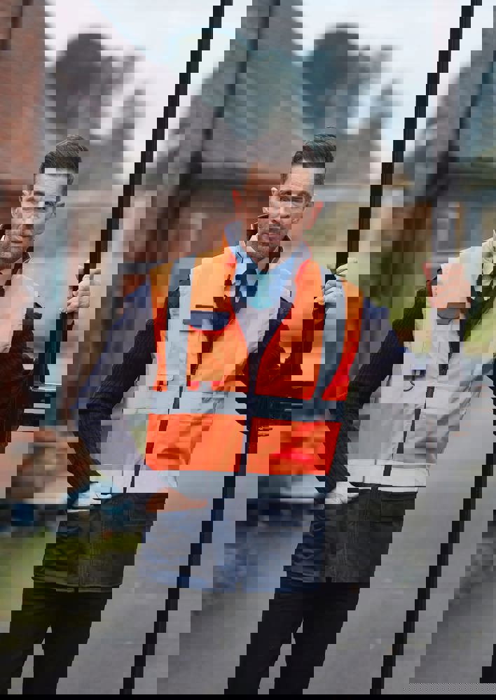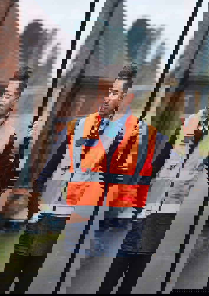Opgebouwd uit 3 lagen: 1) buitenzijde: polyester met PU Oxford-coating. Waterdicht. 2) niet-geweven tussenlaag en 3) binnenvoering van fleece voor een maximaal comfort en warmte. De donkerblauwe zoom vormt een mooi contrast en helpt schoon te blijven. Zakje voor gsm op de borst, met een D-ring onder. Twee zakken onderaan. Toegang voor de decoratie van het logo. Ideaal om dagelijks naar het werk te dragen. Conform aan de normen EN ISO20471:2013 van klasse 2