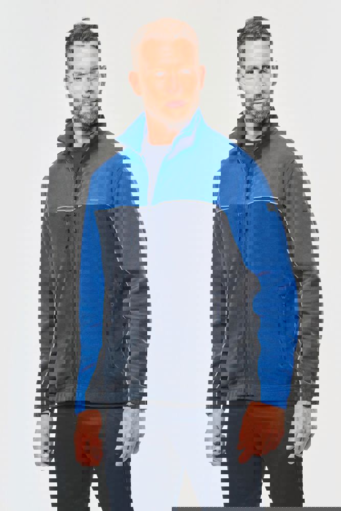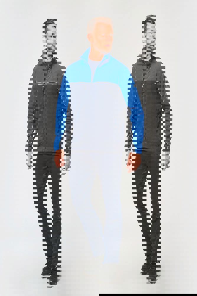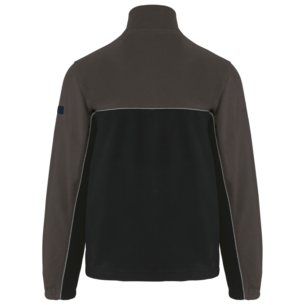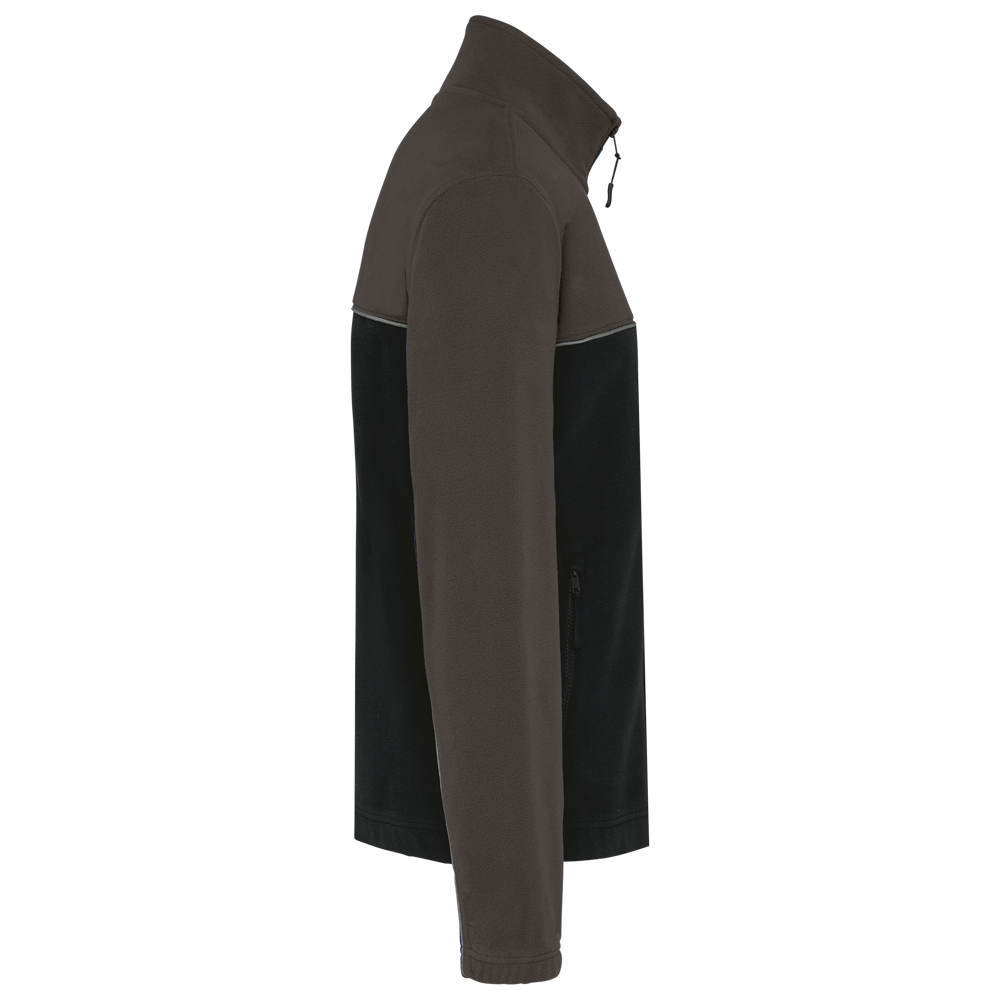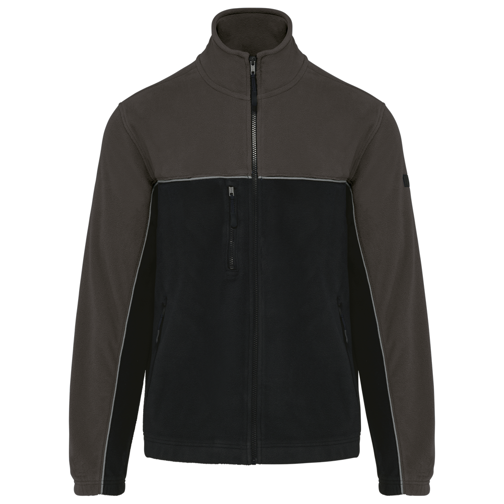 100% polyester. Gemaakt van 100% gerecycleerd polyester. Anti-pluis microfleece. Rechte snit. 2 ritszakken opzij + 1 borstzakje met rits Gerecycleerde toon-op-toon plastic ritsen met ritstrekker. Contrasterende nektape met visgraatmotief. Contrasterende bies tussen de tweekleurige delen van het kledingstuk (lichaam, voorkant mouwen en rug). Elastische penhouder met 3 vakken op de linkermouw. Ophanglint in de kraag. Elastische mouwuiteinden en boord. Tear-away merklabel.