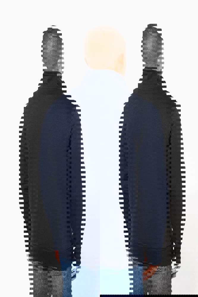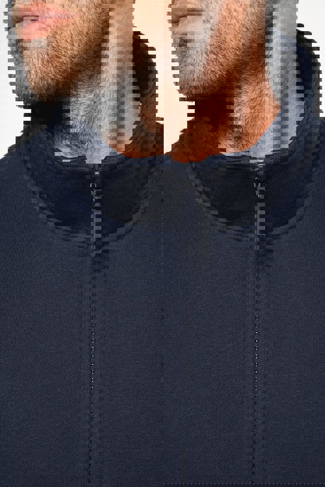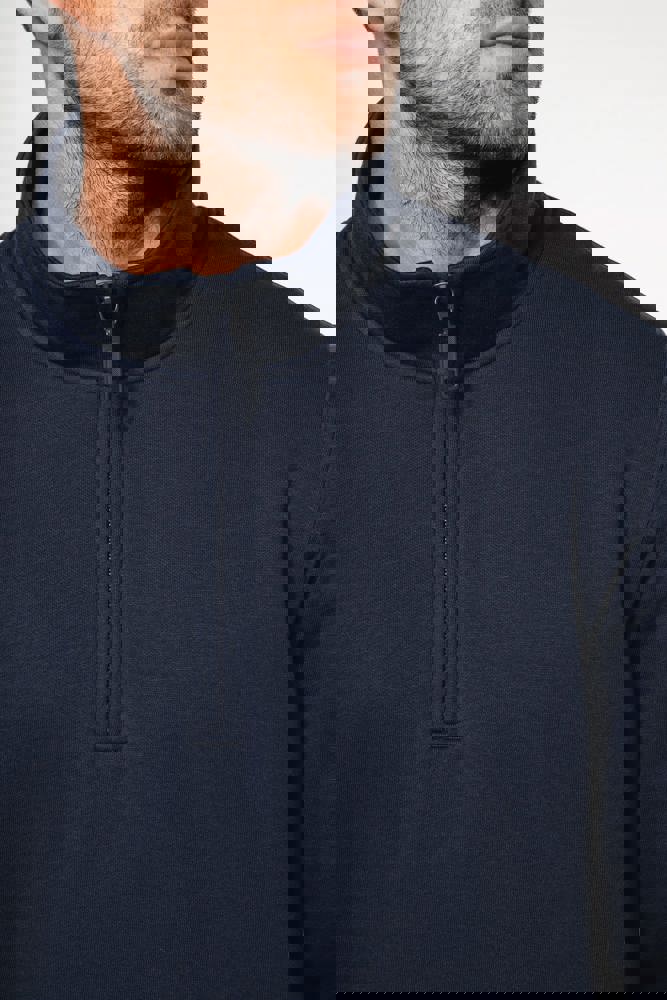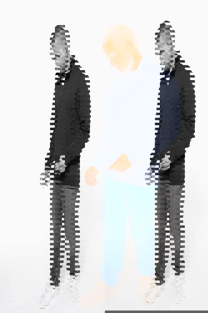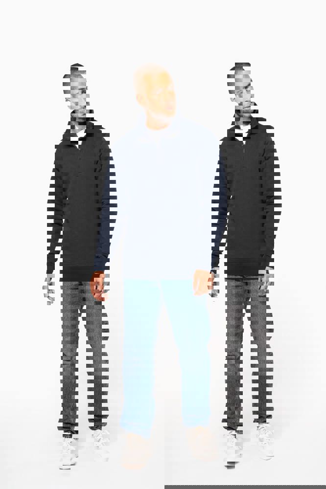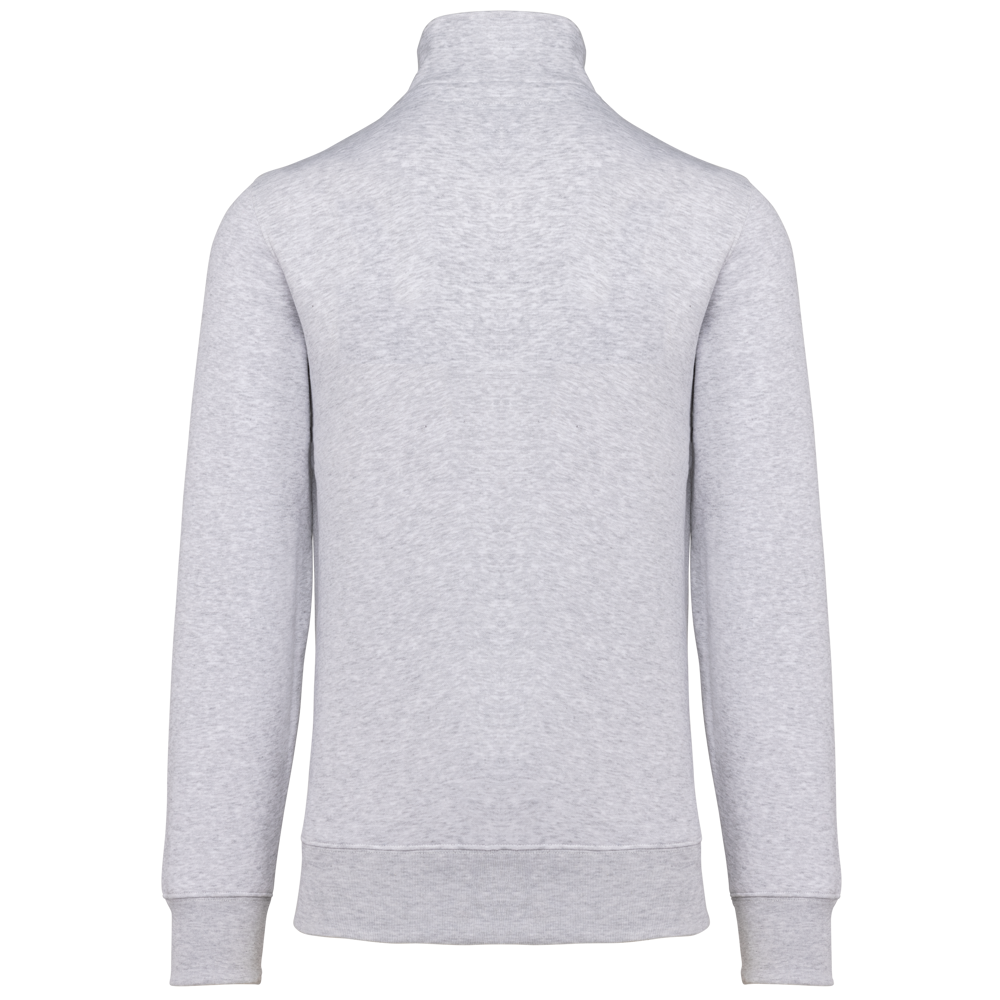 80% katoen / 20% polyester (Ash Heather : 79% katoen / 20% polyester / 1% viscose). Buitenoppervlak 100% katoen. LSF-behandeling (Low Shrinkage Fleece : voorgekrompen fleece). Aan de binnenkant geborsteld fleece 3 draden van gekamd katoen. Ingezette mouwen. Kraag met toon-op-toon plastic ritssluiting. Nektape in contrasterende kleur aan de halsopening (Navy voor de kleur Oxford Grey en Ash Heather ; Oxford Grey voor alle andere kleuren). Ribboord aan mouwuiteinden en aan de onderkant.