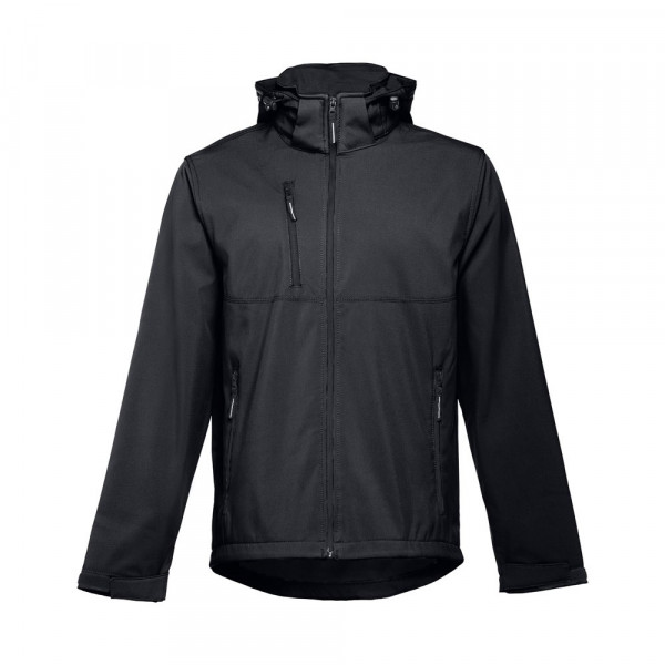 Softshell herenjack van 96% polyester en 4% elastaan (280 g/m²), met twee lagen, afneembare capuchon en waterafstotende coating. Met fleece gevoerde jas met 2 voorzakken en diagonale borstzak, allemaal met ritssluiting. Verstelbare mouwen met lussluiting. Afneembare capuchon met trekkoord en lus om aan de kraag te bevestigen. Afgeronde zoom op de rug. Maten: S, M, L, XL, XXL