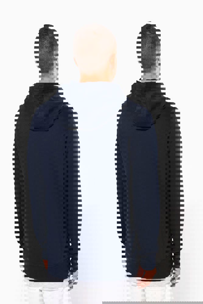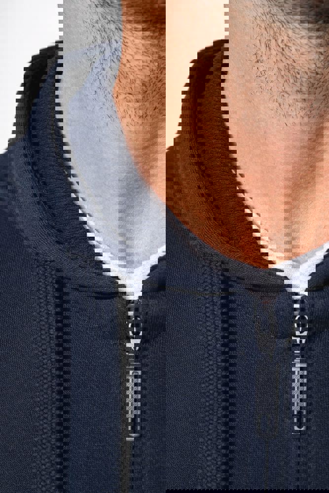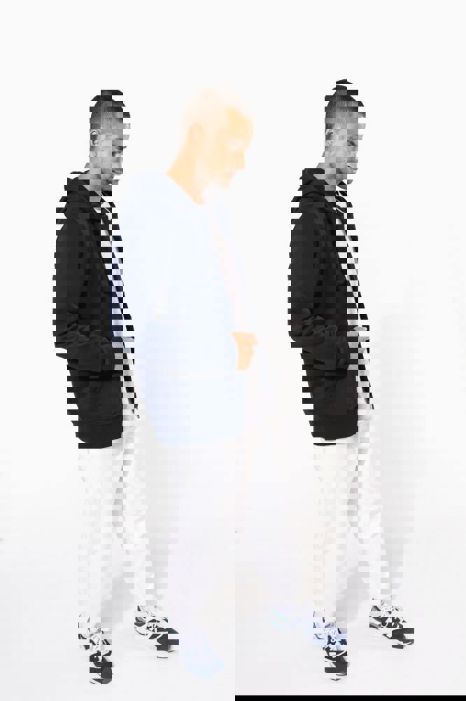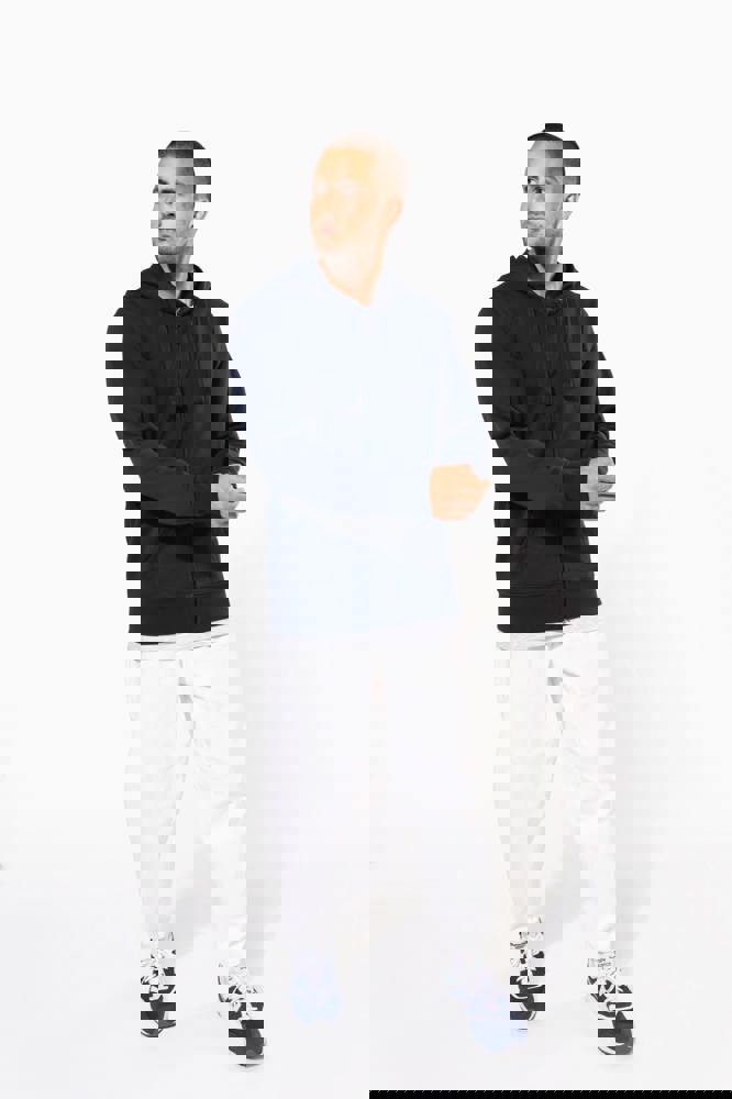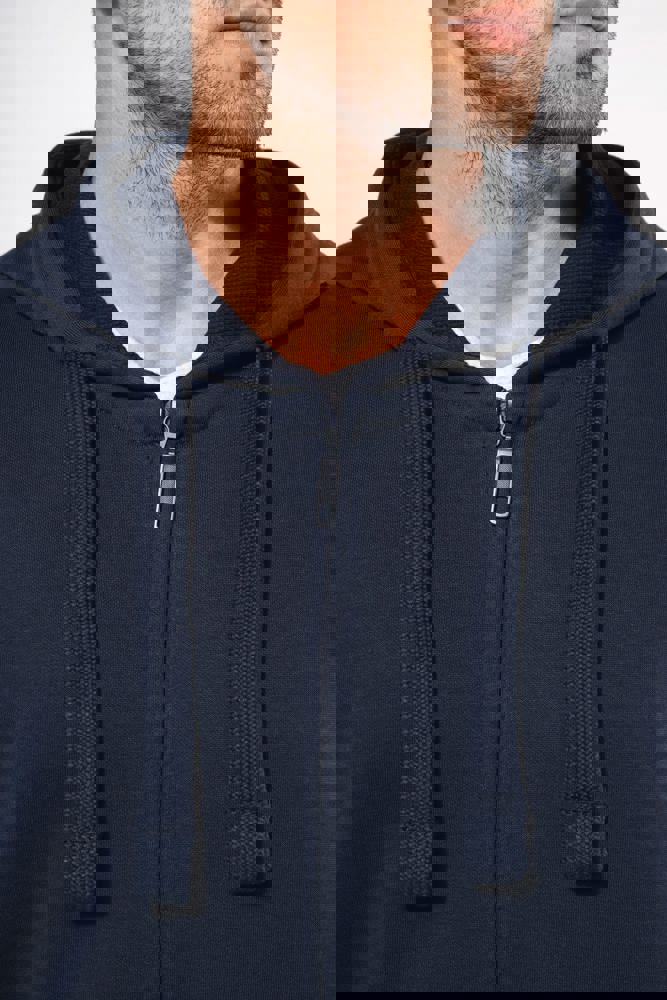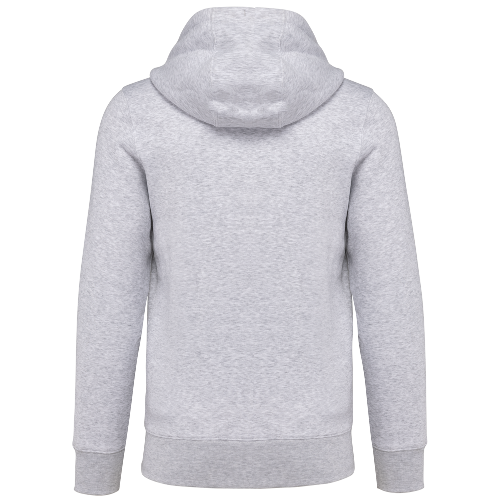 80% katoen / 20% polyester (Ash Heather: 79% katoen / 20% polyester / 1% viscose). Buitenoppervlak 100% gekamd katoen. Geborsteld fleece aan de binnenkant. Nektape in contrastkleur. (Navy voor de kleur Oxford Grey en Ash Heather ; Oxford Grey voor alle andere kleuren). Gevoerde capuchon in honinggraatstructuur met aanrijgkoordje. 'Kangaroe' zakken. Afwerking in rib aan de zakken, mouwuiteinden en onderaan. Ritssluiting.
